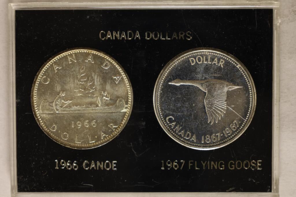 CANOE .6000 OZ. ASW & 1967 "FLYING GOOSE" .6000 OZ. ASW. SOME TONING PRESENT. COINS ARE IN HARD PLASTIC DISPLAY CASE.