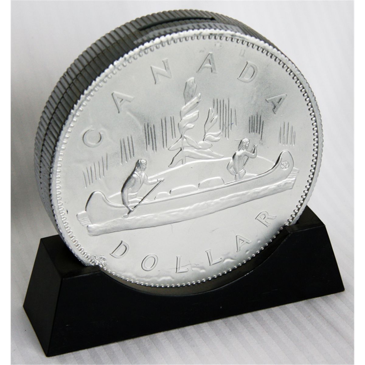 CANADA DOLLAR/VOYAGEUR SILVER DOLLAR. Coin shape/on base. Coin slot on top. 15cm. In height. Silver coloured plastic. EF.