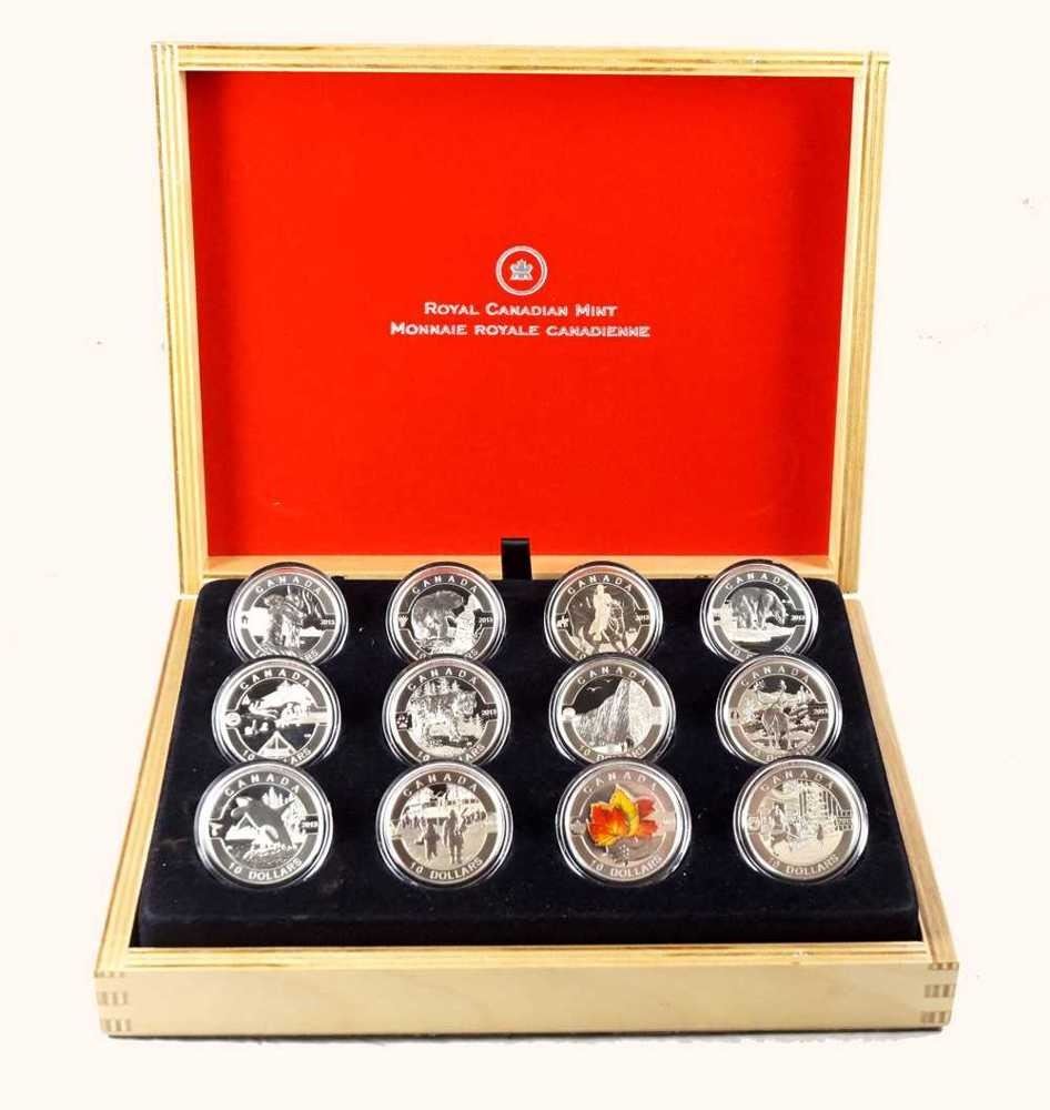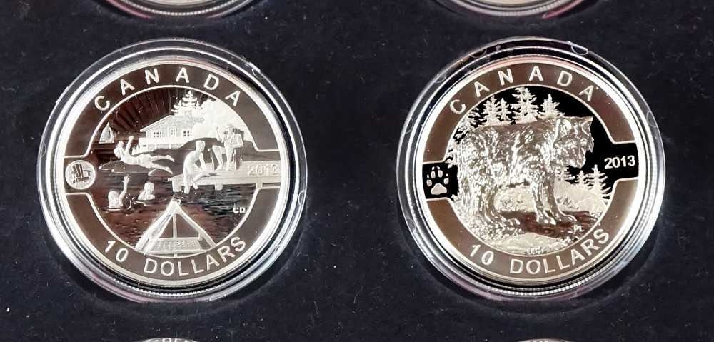 La Gendarmerie royale du Canada, Le castor, L'inukshuk, Le loup, Les chutes Niagara, Le caribou, L'epaulard, L'ours polaire, Plaisirs de l'ete canadien, Le temps des fêtes au Canada, Hockey, La feuille d'erable. Avec boite et papiers, Argent 999 15,87 grammes chaque. ASW 6,11734 oz en tout.