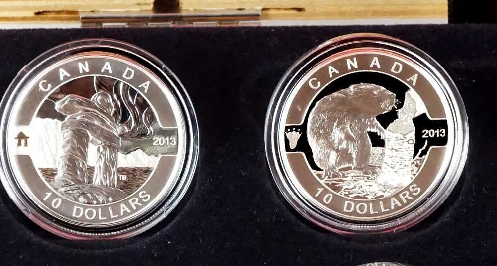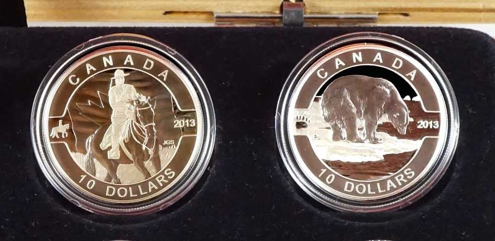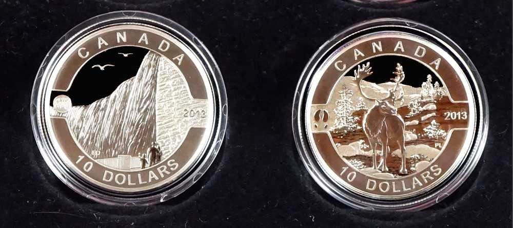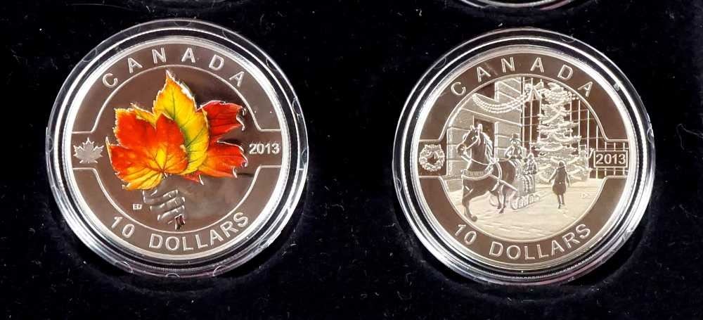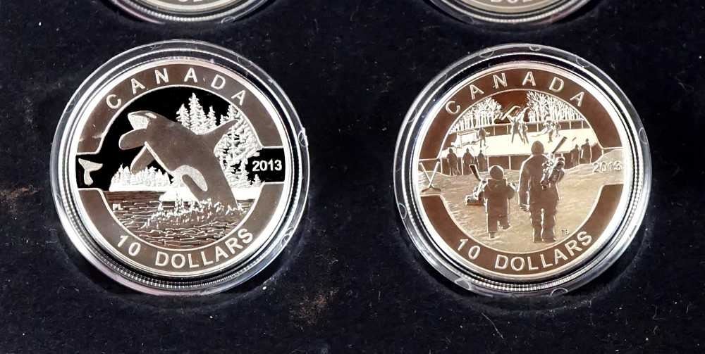 The Royal Canadian Mounted Police, The Beaver, The Inukshuk, The Wolf, Niagara Falls, The Caribou, The Orca, The Polar Bear, Canadian Summer Fun, Canadian Holiday, Season, Hockey, The Maple Leaf. With box and paper, 999 Silver 15.87 grams each. ASW 6,11734 oz