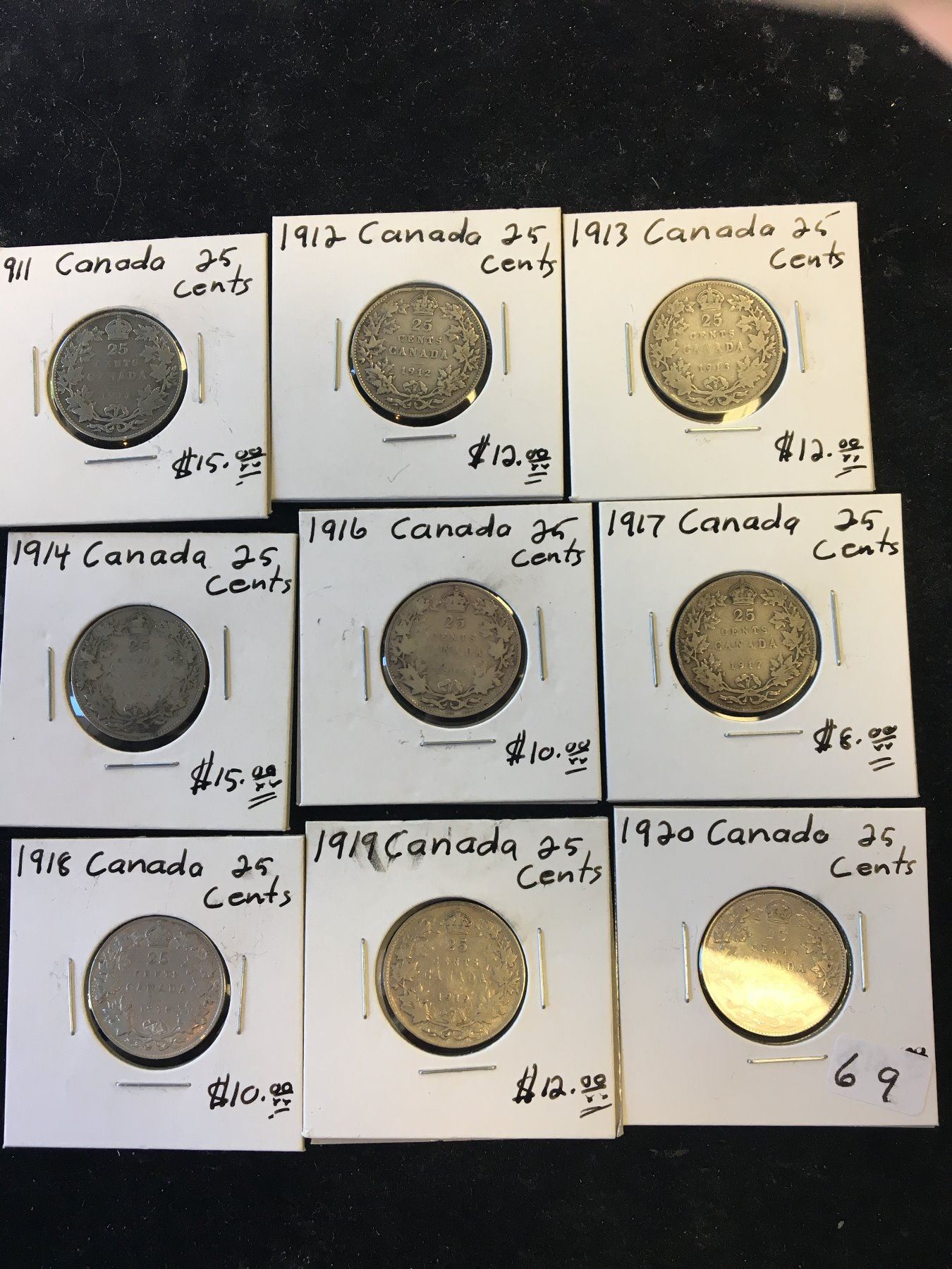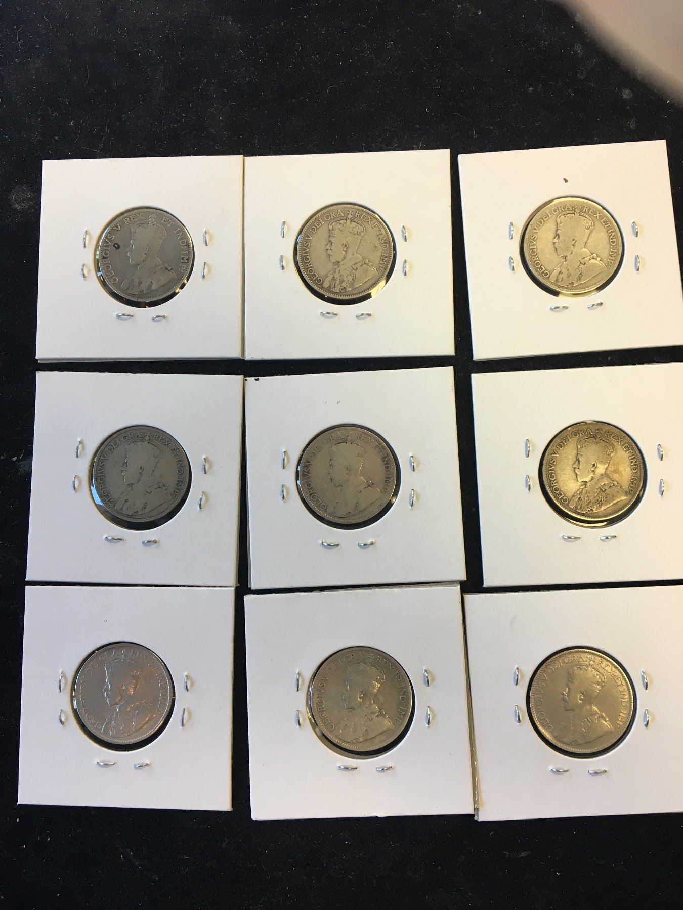 NICE LOT OF 9 GEORGE V 25 CENTS! 1911,1912,1913,1914,1916,1817,1918,19191920.AVERAGE GRADE VG