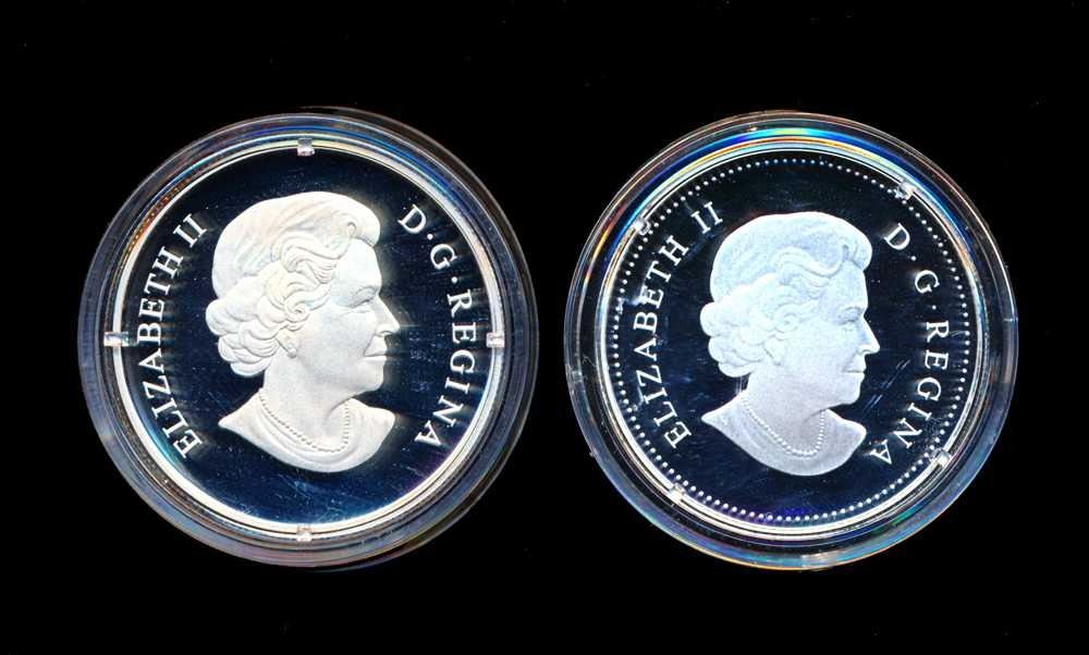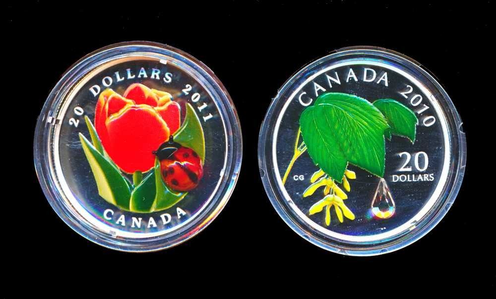 (Feuille d'erable et goutte de cristal, Tulipe et coccinelle) Avec capsule, qualite epreuve. Argent 999 31,39 grammes chaque. ASW 2,01663 oz.