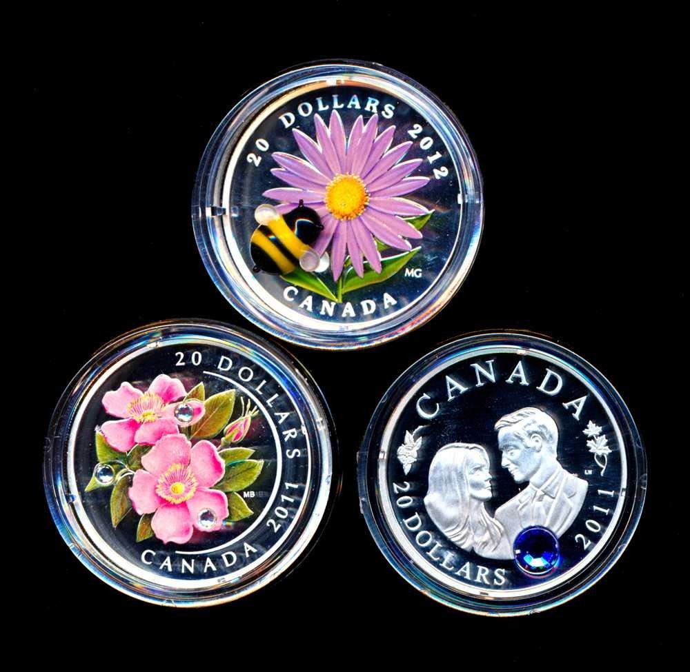 (Wild Rose, Royal Wedding, Aster With Glass Bumble Bee) With capsule, proof quality. 999 silver 31.39 grams each. ASW 3.02494 oz.