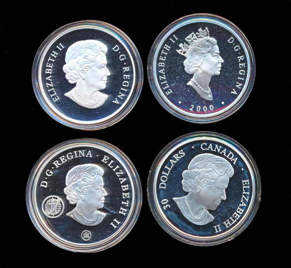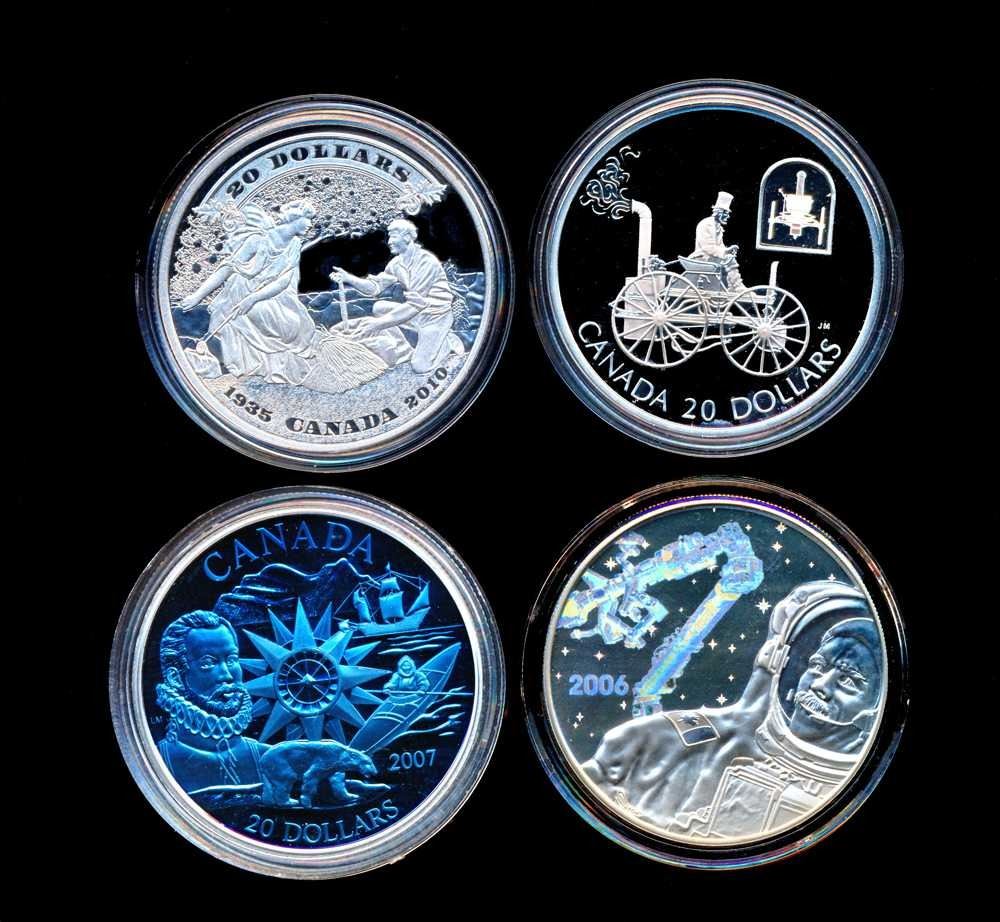 20 dollars 2000 La voiture à vapeur H.S. Taylor, Argent 925 31,1 grammes + 30 dollars 2006 5eme anniversaire de Canadarm et Col Chris Hadfield, Argent 925 31,5 grammes + 20 dollars 2007 Annee polaire internationale, Argent 925 28 grammes + 20 dollars 2010 75eme anniversaire des premiers billets de banque emis par la Banque du Canada Argent 999 31,39 grammes. Avec capsule, qualite epreuve, ASW 3,70300 oz.