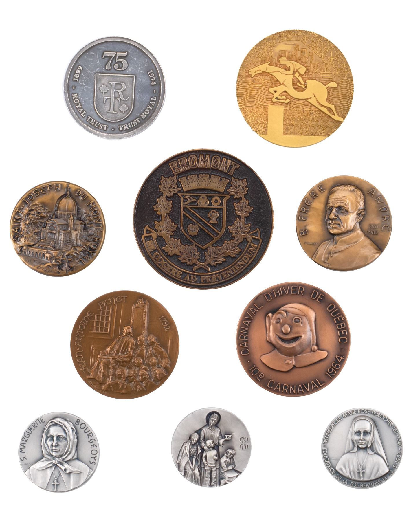 Include Bromont bronze, Carnaval de QuEbec 1964, bronze, Royal trust 1974 mEtal, concours hippique MontrEal bronze, Jean -Antoine Panet 1975 bronze, 2 x Frere AndrE bronze, Marie-Rose Durocher 1982 mEtal, Marguerite Bourgeoys 1982 metal, Marguerite d'Youville 1982, mEtal