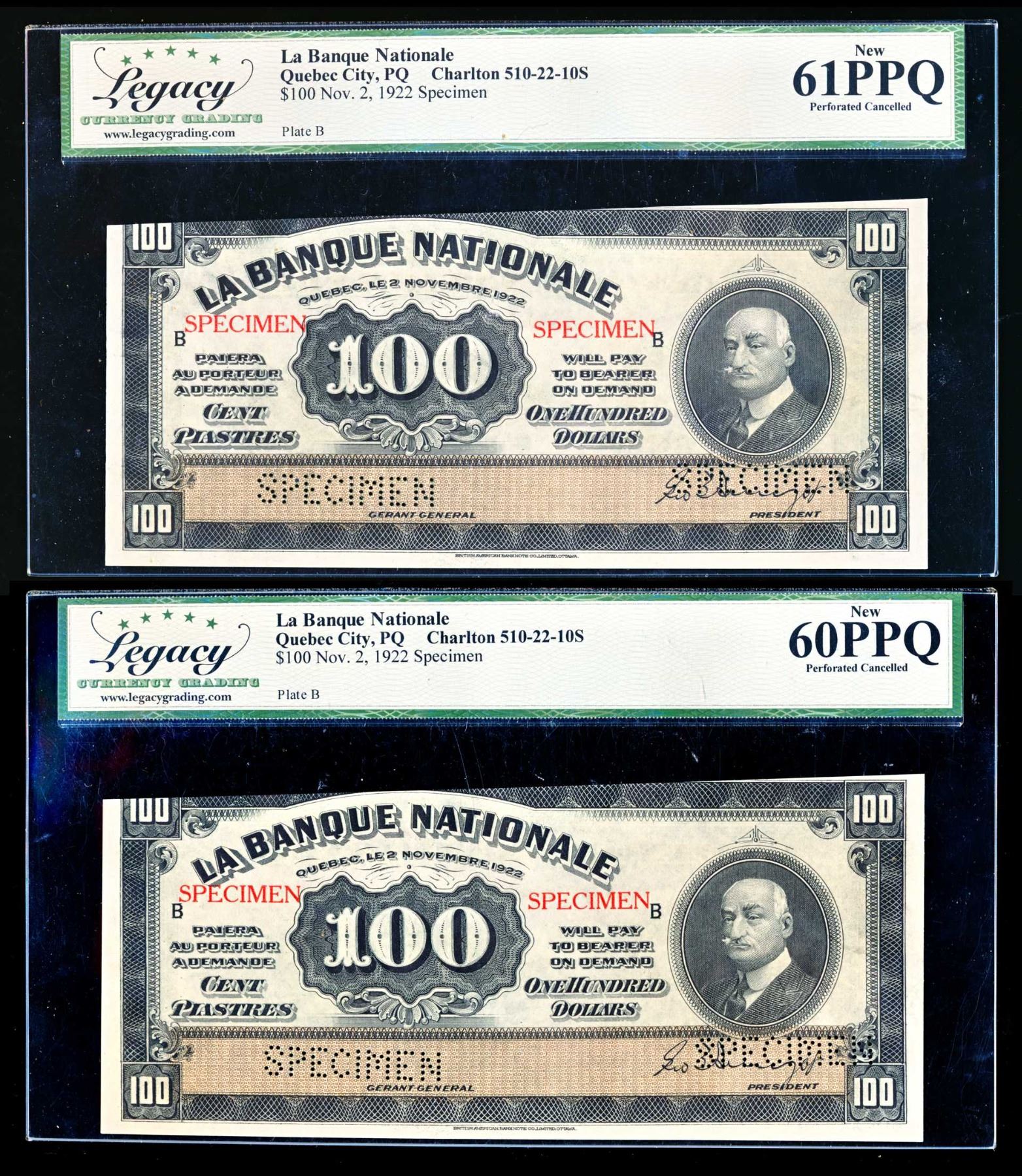 CANADA - Lot of 2 banknotes SPECIMEN LA BANQUE NATIONALE $100 1922