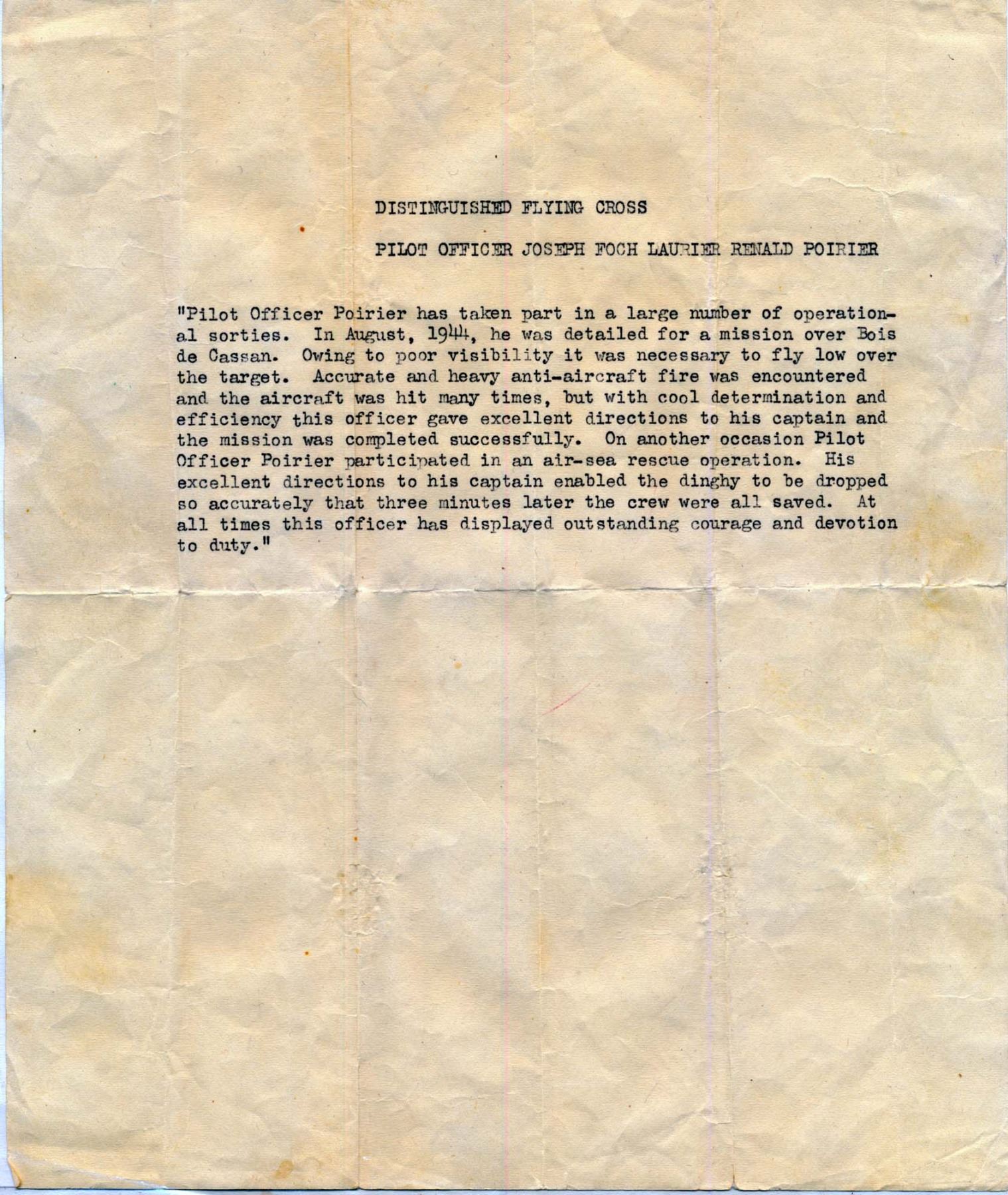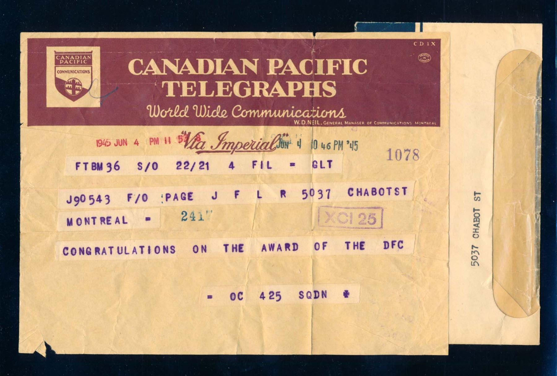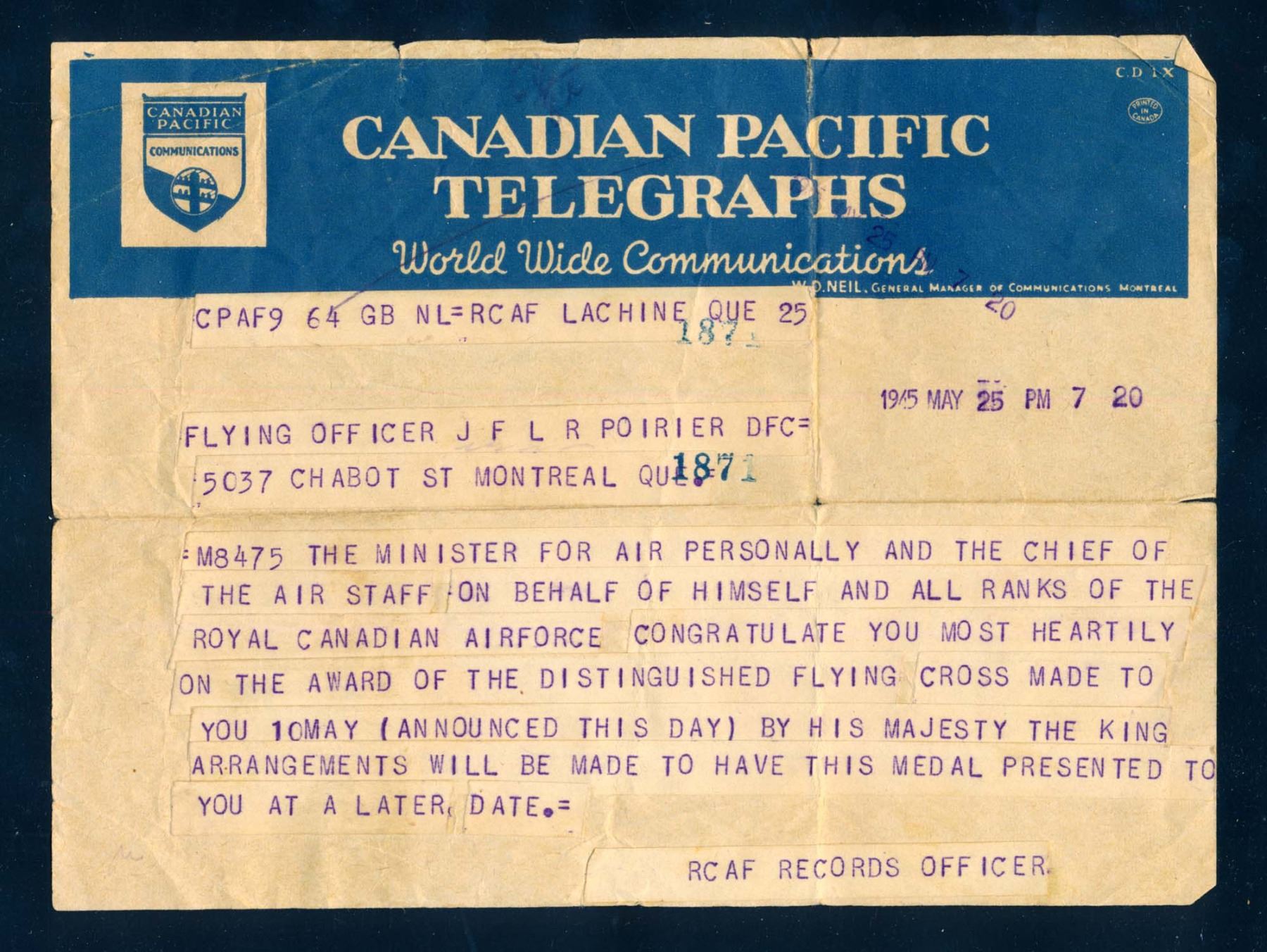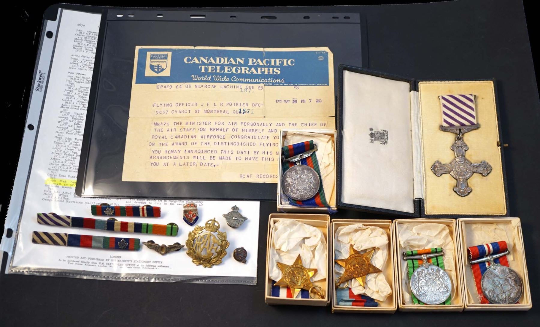 Joseph Foch Laurier Reynald Poirier, 425 (RCAF) Squadron was awarded the Distinguished Flying Cross on the 25th. of May 1945. His collection includes the DFC, 1939-45 Star, France-Germany Star, Defence Medal, 1939-45 War Medal and CVSM. All medals come in original boxes with ribbons. The DFC is in Extra Fine condition with some darkening of the ribbon, the rest are as issued. His main riband bar is in 2 parts and a supplemental bar has 3 awards. Included with the medals and bars are a RCAF hat badge, 4 lapel pins, a copy of the London Gazette for May 25, 1945, a letter describing his feats, and the original copy and envelope from the Canadian Pacific Telegraphs announcing the giving of the award.