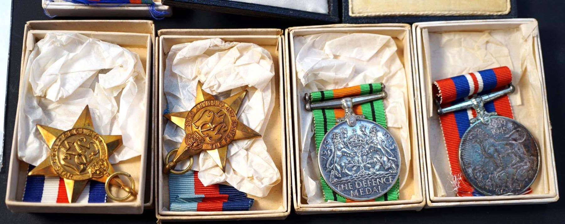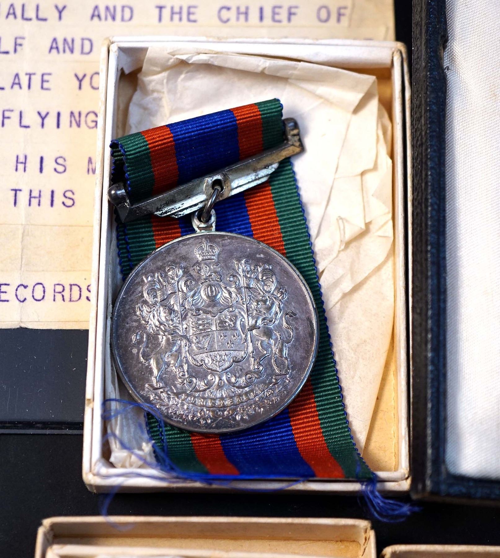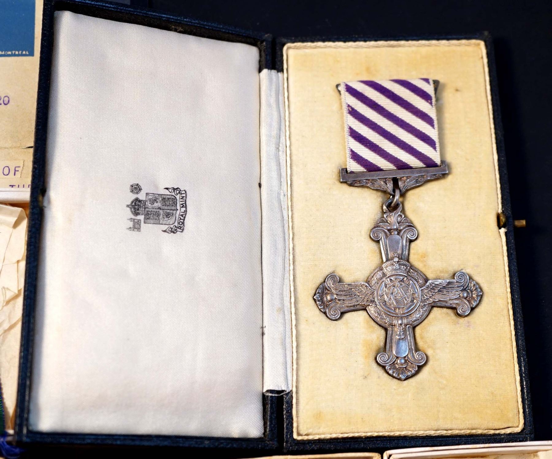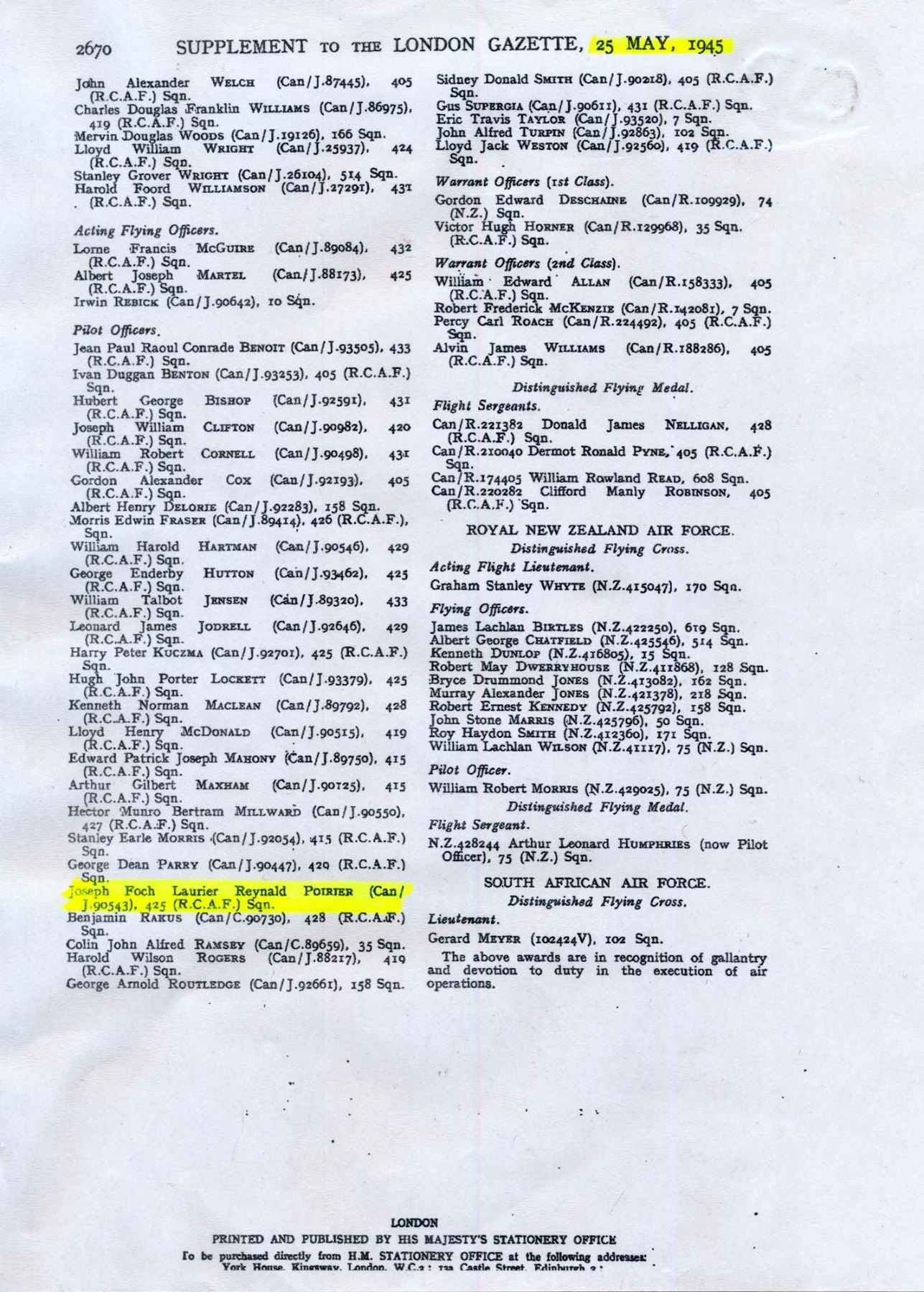Joseph Foch Laurier Reynald Poirier, 425 (RCAF) Squadron was awarded the Distinguished Flying Cross on the 25th. of May 1945. His collection includes the DFC, 1939-45 Star, France-Germany Star, Defence Medal, 1939-45 War Medal and CVSM. All medals come in original boxes with ribbons. The DFC is in Extra Fine condition with some darkening of the ribbon, the rest are as issued. His main riband bar is in 2 parts and a supplemental bar has 3 awards. Included with the medals and bars are a RCAF hat badge, 4 lapel pins, a copy of the London Gazette for May 25, 1945, a letter describing his feats, and the original copy and envelope from the Canadian Pacific Telegraphs announcing the giving of the award.