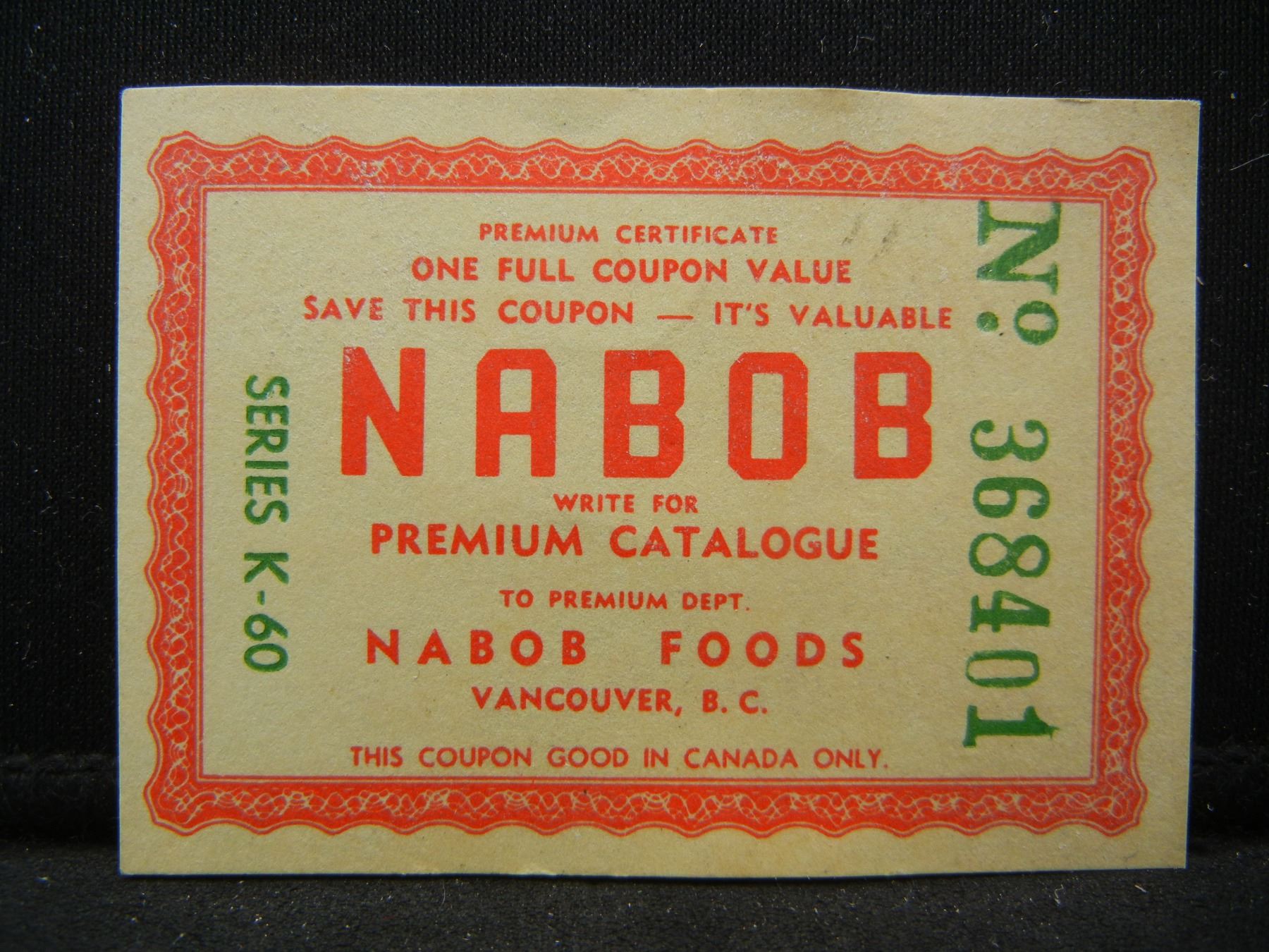 CANADA "NABOB" SERIALIZED COUPON (1950'S), CRISP