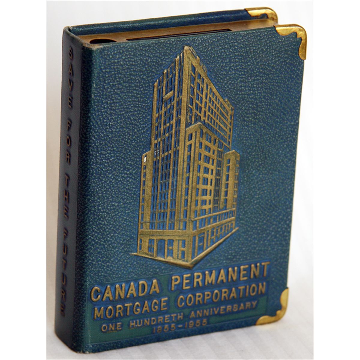 CANADA PERMANENT MORTGAGE CORPORATION. ONE HUNDREDTH ANNIVERSARY 1855-1955. Slot for coins and hole for bills on top. Key lock, key present. No serial number. 8cm x 12cm x 2cm. ‘Save for the Future’ on spine. Dark green cloth or leatherette cover. Maker-Bankers Utilities Co., San Francisco. Patented July 3, 1923. Made in USA. VF.