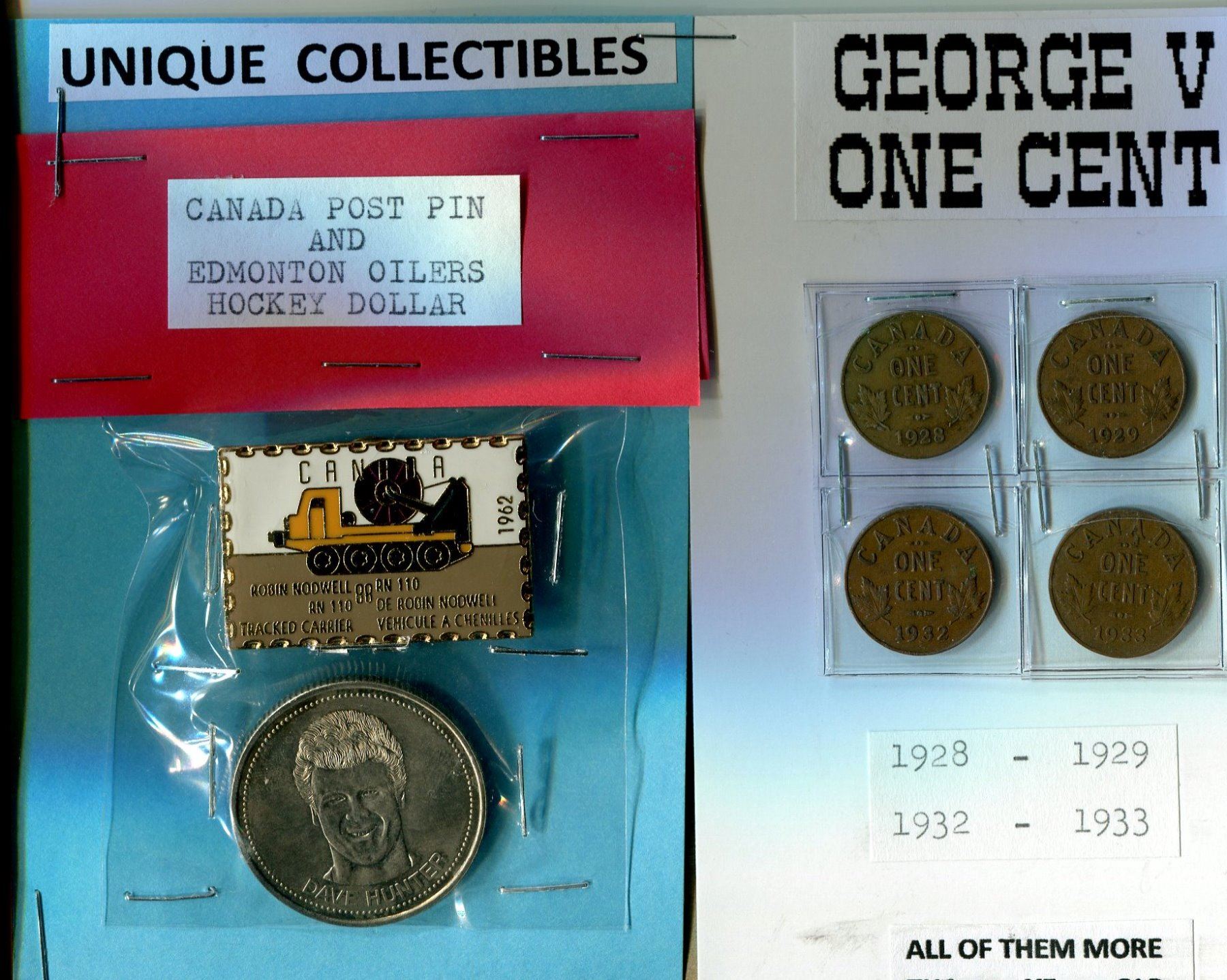 CANADA POST PINS, OILERS HOCKEY AND 4 GEORGE V ONE CENT COINS