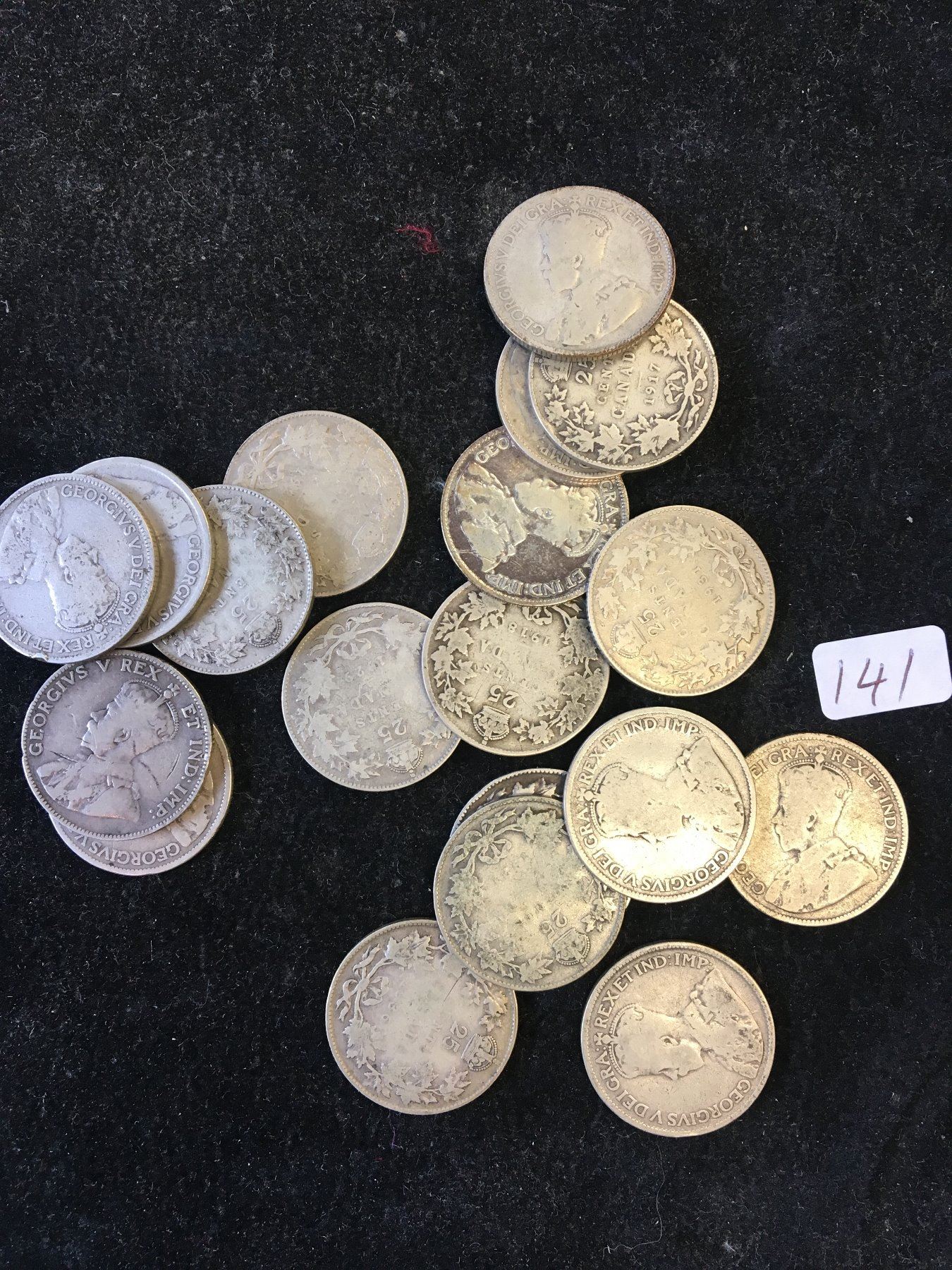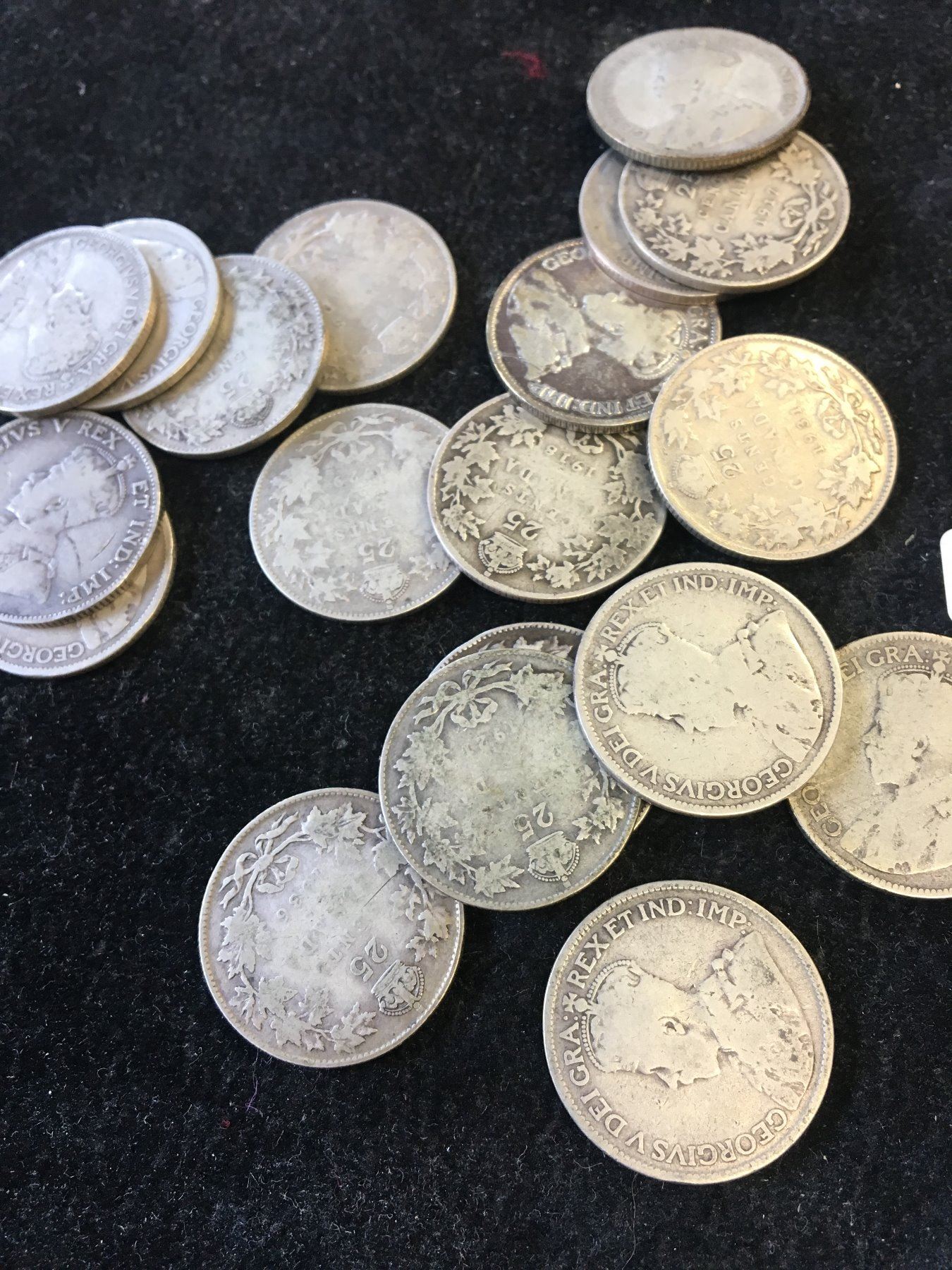 NICE LOT OF 19 MIXED DATE 25 CENTS.ALL ARE GEORGE V.SOME ARE PRE 1919 STERLING SILVER