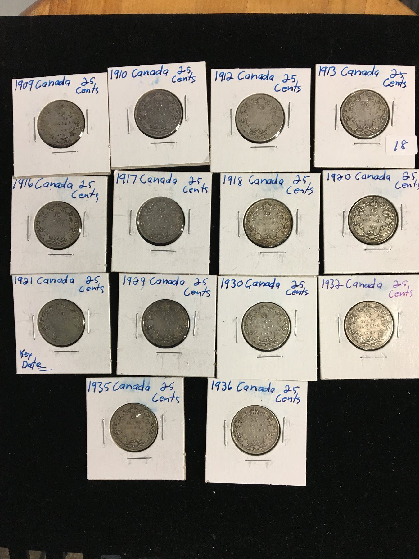 NICE COLLECTION OF 14 CANADA SILVER QUARTERS.1909,10,12,13,16,17,18,20,21,29,30,32,35,36.AVERAGE GRADE G-VF.
