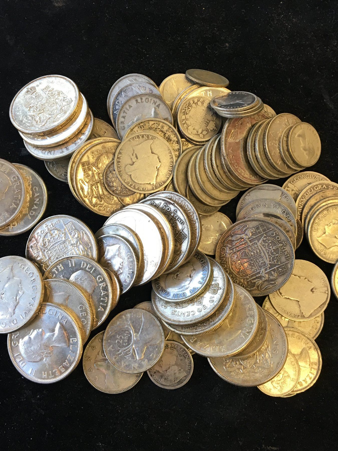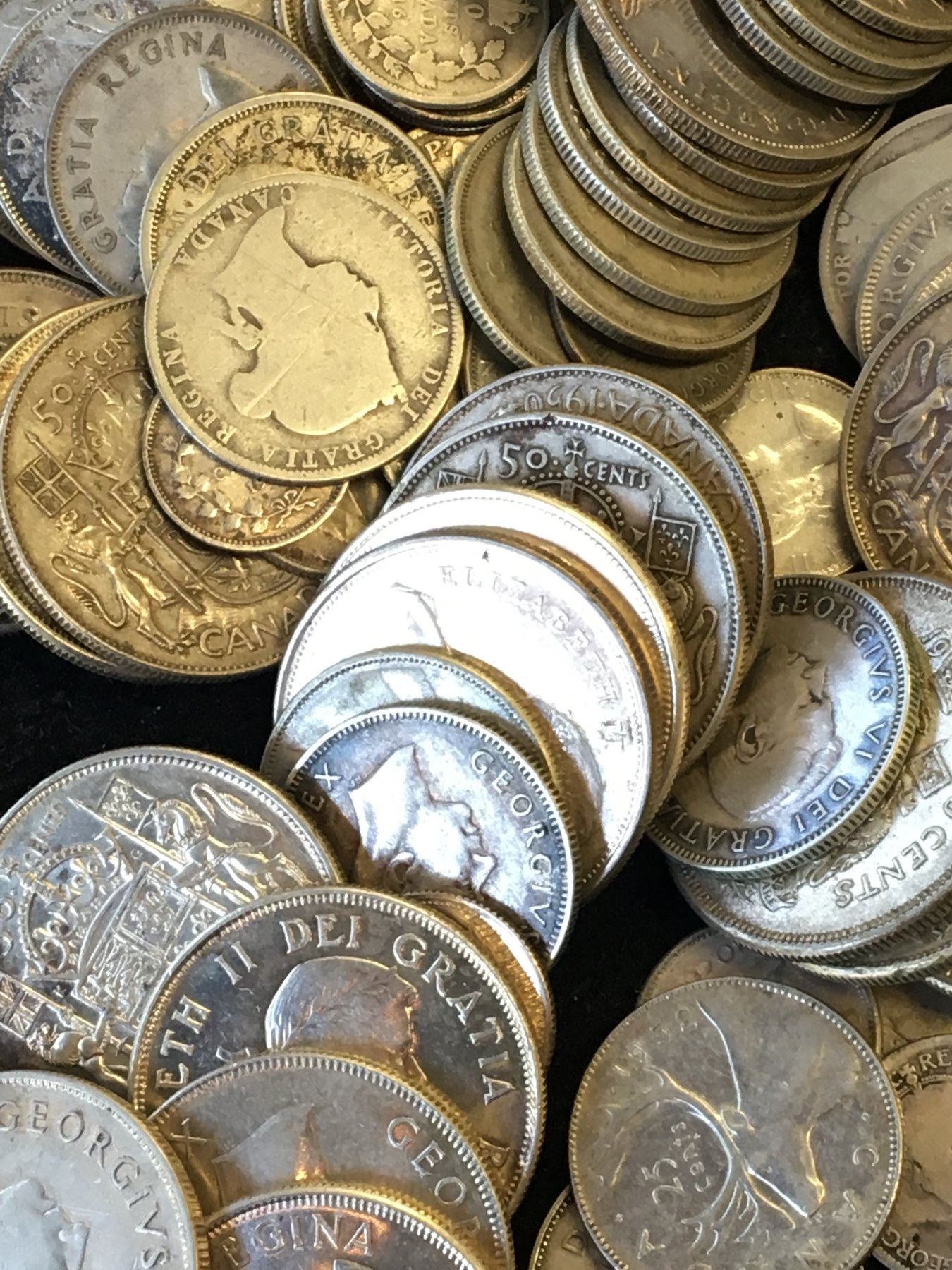 NICE LOT OF $27 FACE VALUE OF CANADA SILVER COINS! MOSTLY .800 BUT SOME STERLING AS WELL! MIXED DENOMINATIONS SILVER 5CENTS -50 CENTS