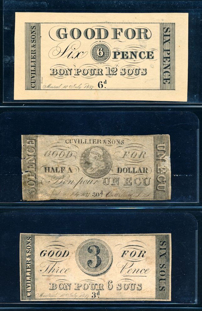Set of 3 Cuvillier & Sons exchange notes dated 1837, 6 sous, 12 sous and one écu.
