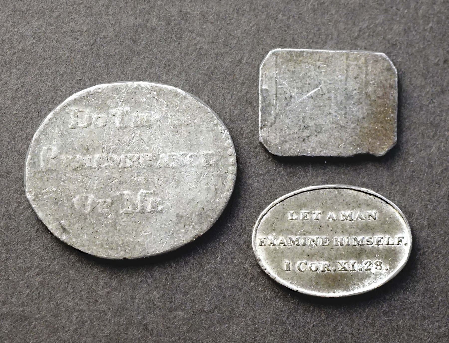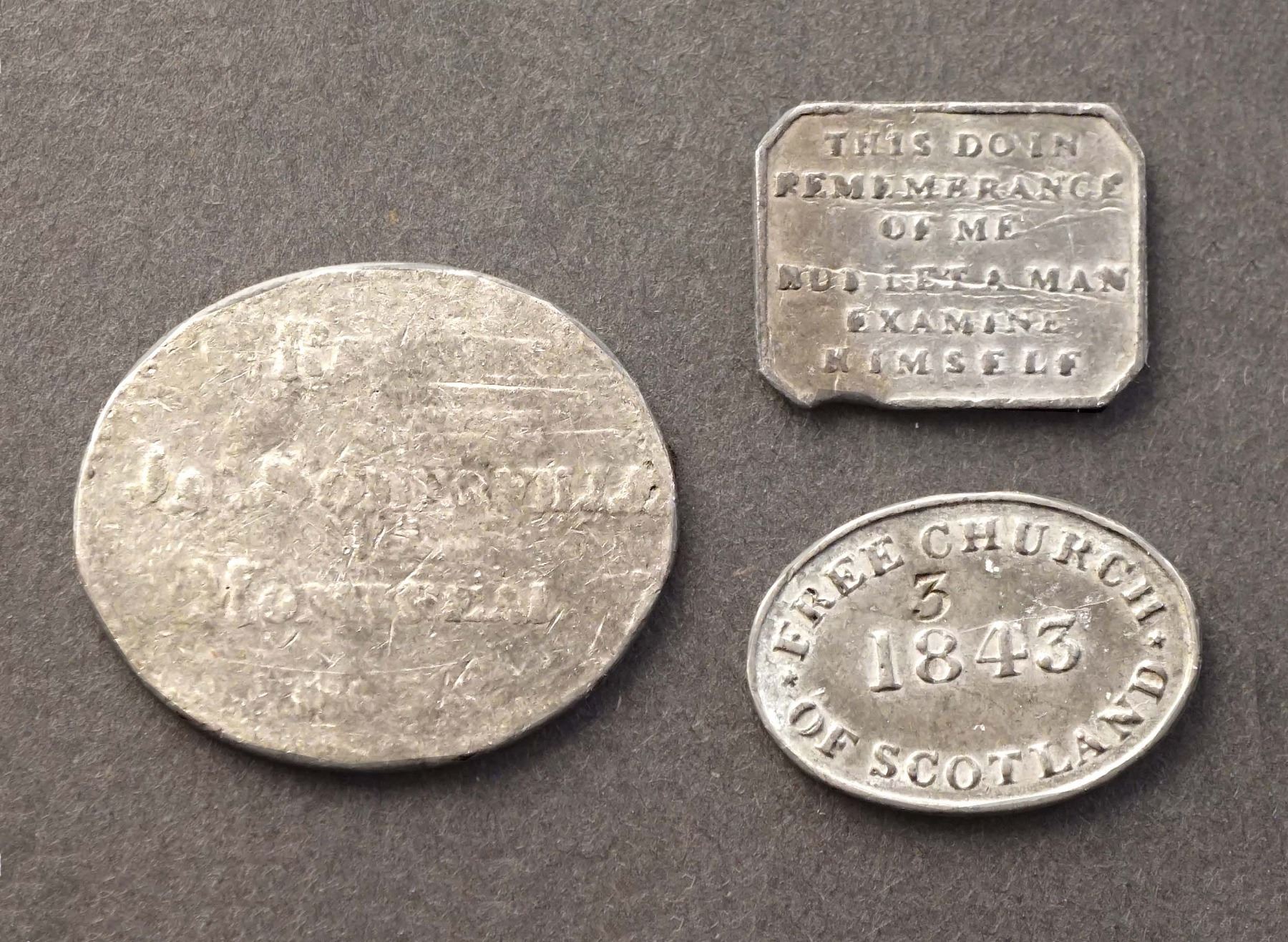 St-Gabriel, Montreal Bow #21 CE-226b Oval-40 14.4 gms. Fine, Stock token BOW-228 NB-224 8.5 gms. VF and 1843 Free Church of Scotland Stock Item Burzinski #7493 in VF.