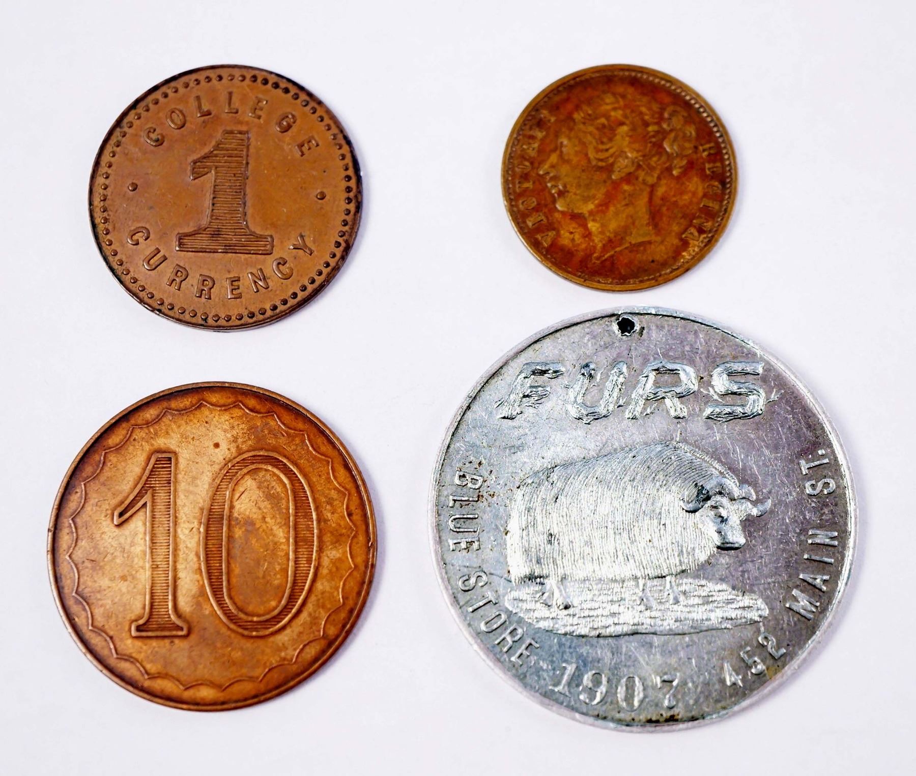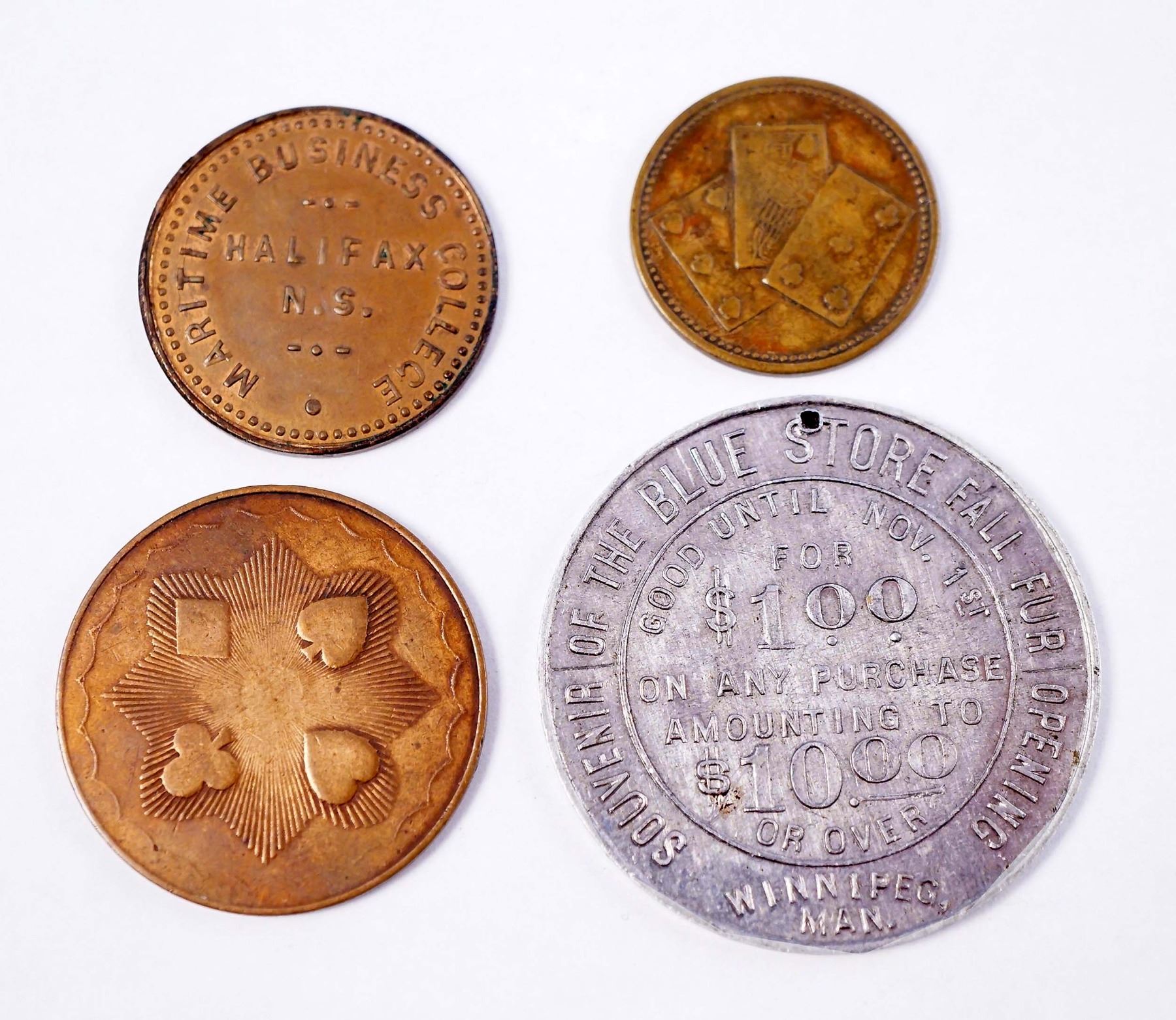 1837 Allen and Moore 21 Blackjack Victorian AE-22 3.3 gms. EF, an Unknown AE-29.5 7.8 gms medal axis with a large 10 on the obverse and Octogon w/card suits on the reverse EF, 1907 Winnipeg Blue Store Furs #TC-541385 AL-38 3.9 gms. pierced good for $1.00 and Maritimes Business College of Halifax, N.S. AE-25.5 4.9 gms. ONE College Currency in EF w/lustre. Lot should be viewed.