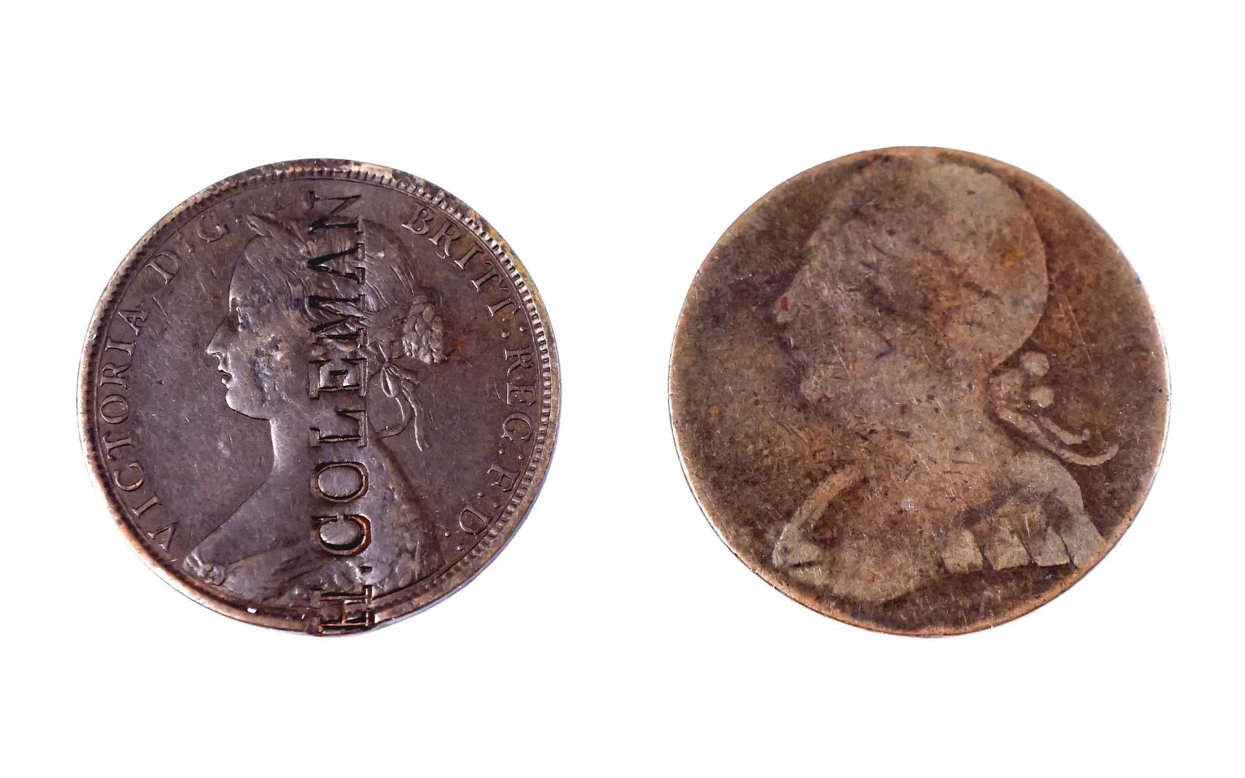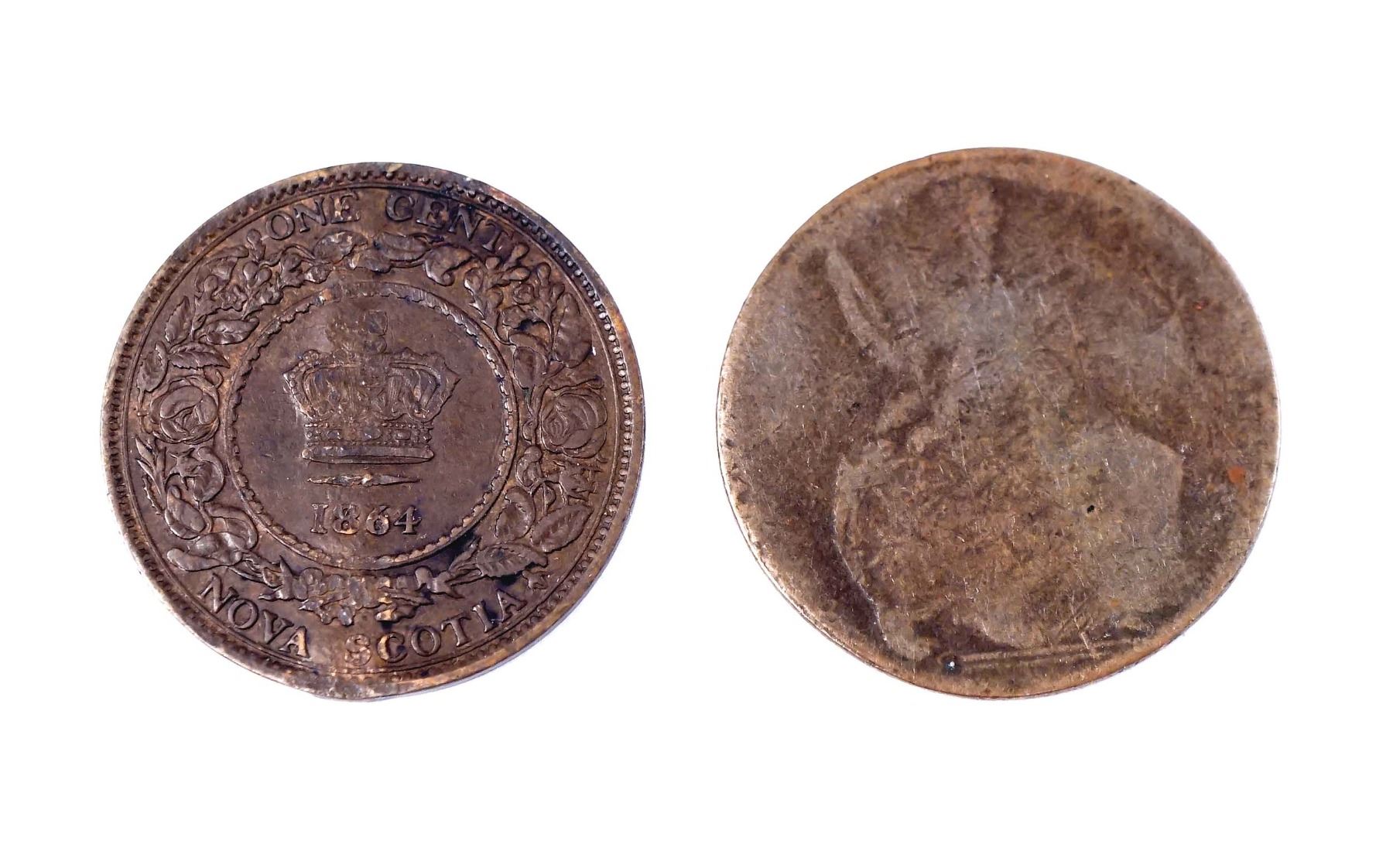 1864 Nova Scotia Cent in VF counter stamped "H. Coleman" & N/D AE-26 5.4 gms. Blacksmith #2 in Fine.