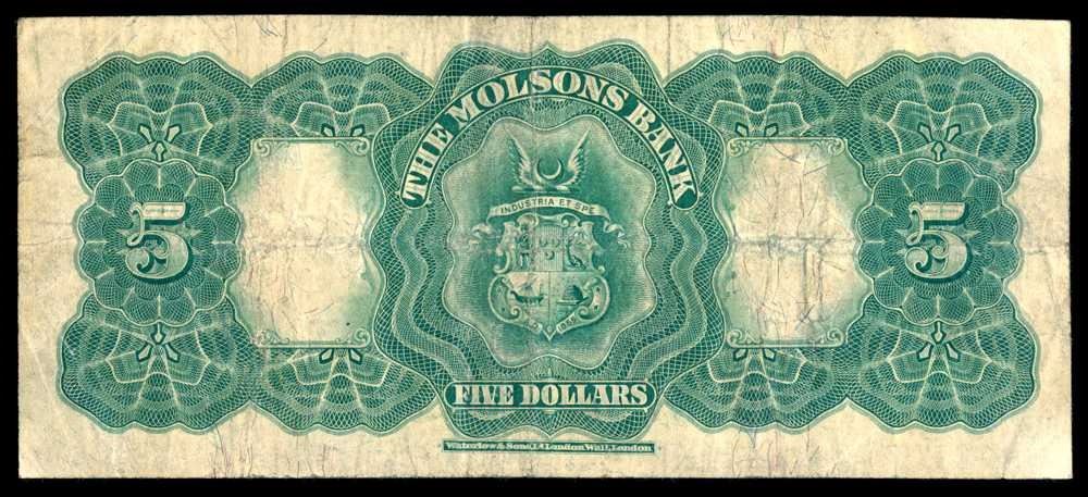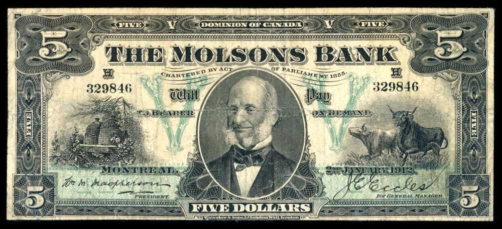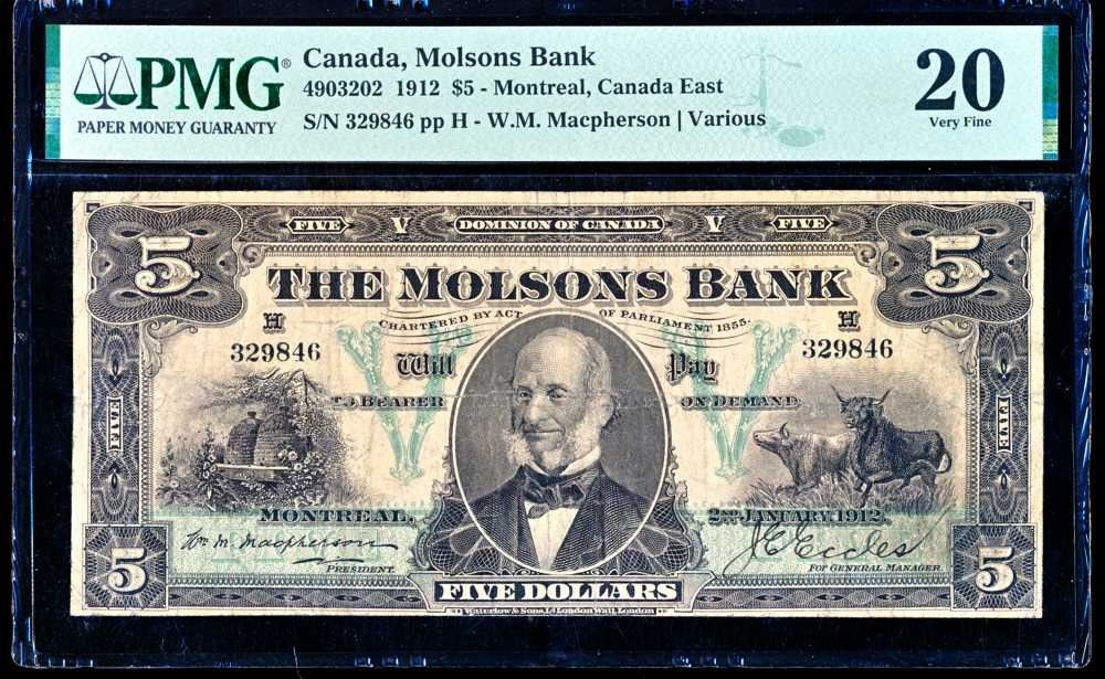 CANADA - The Molson Bank $5 1912 PMG 20 Very Fine