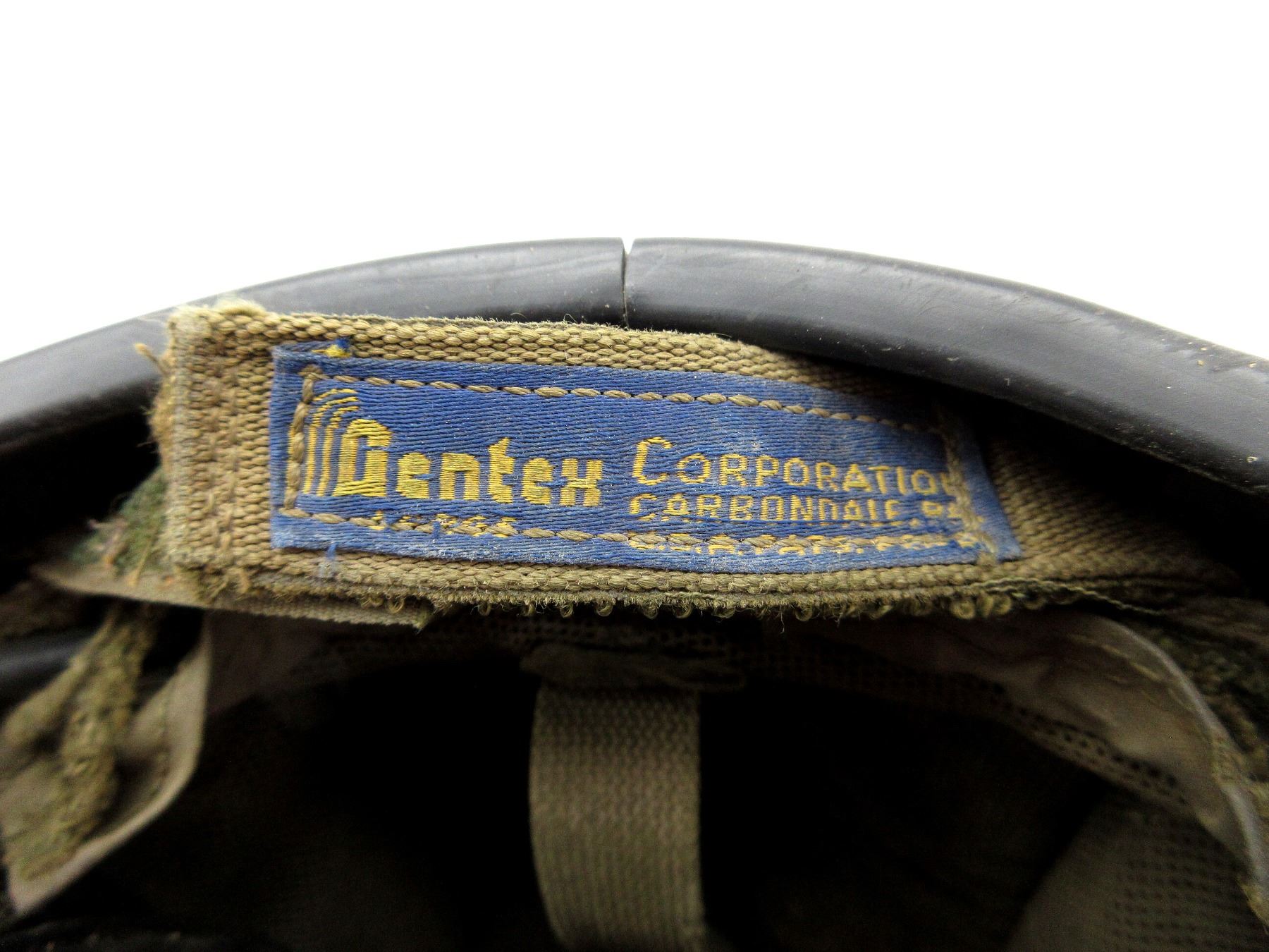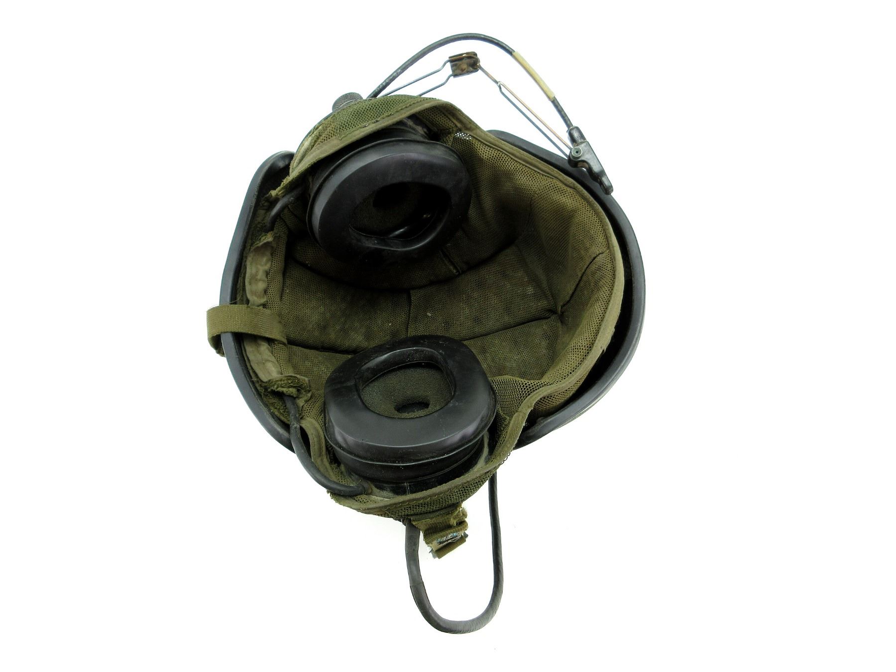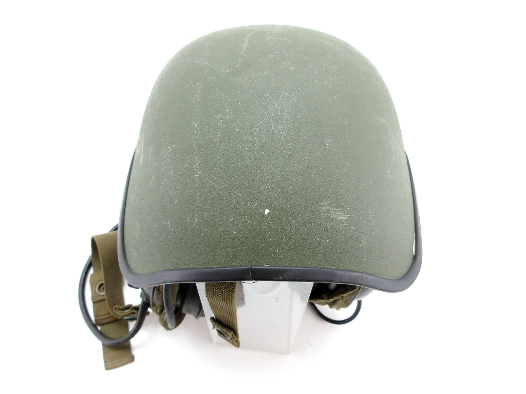 (1) GREEN AFV (ARMOURED FIGHTING VEHICLE) BALLISTICS HELMET WITH HEAD GEAR (EAR / MIC / WIRING), MARKED: "GENTEX CORPORATION" & "LARGE". SEE PHOTOS.