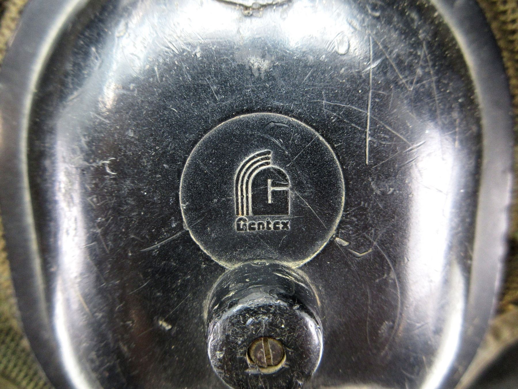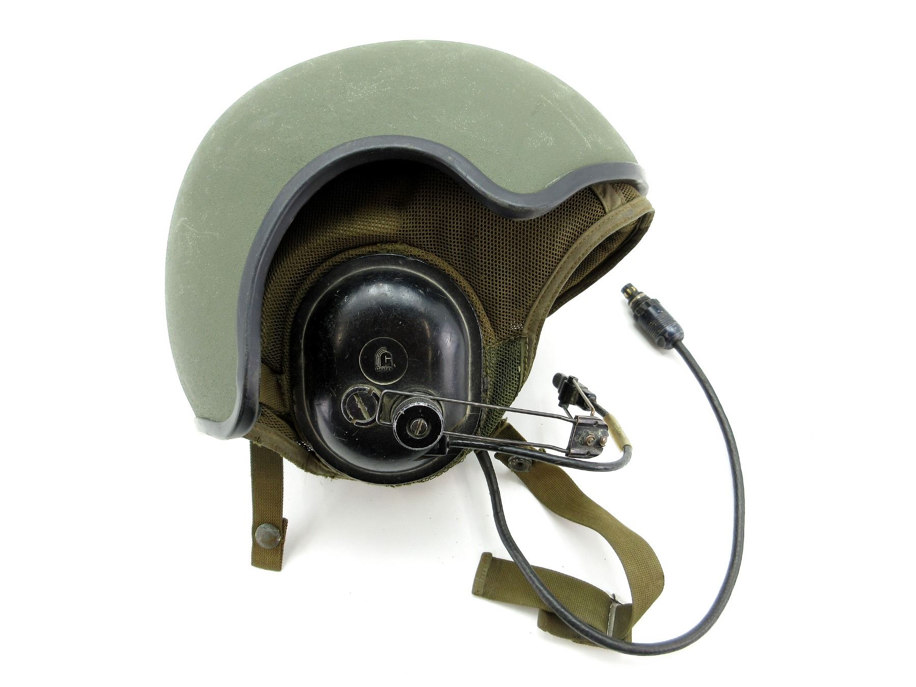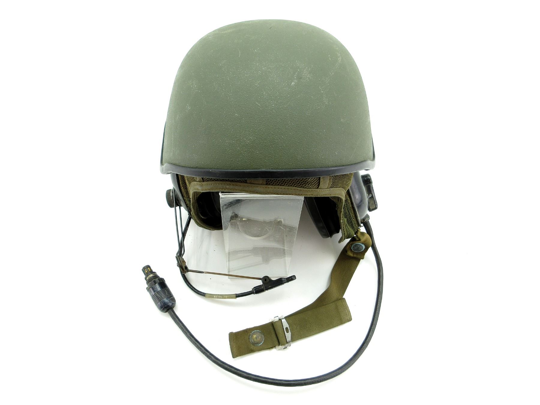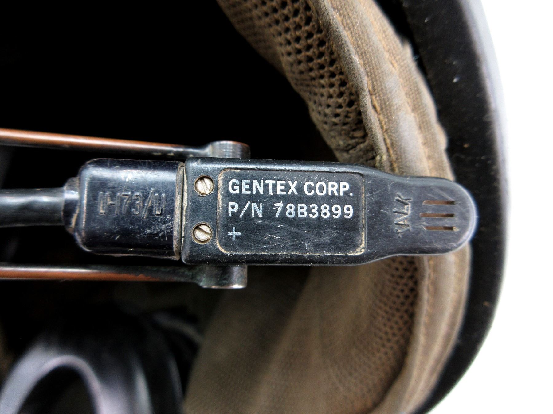 (1) GREEN AFV (ARMOURED FIGHTING VEHICLE) BALLISTICS HELMET WITH HEAD GEAR (EAR / MIC / WIRING), MARKED: "GENTEX CORPORATION" & "LARGE". SEE PHOTOS.