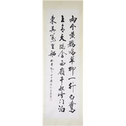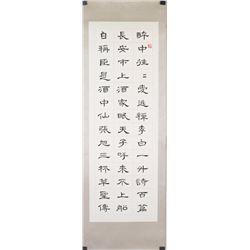 Chinese script calligraphy, ink on paper; inscribed with one artist seal; 97 cm x 35 cm