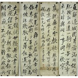 Four pieces of script calligraphy; Chinese ink on patterned paper; signed Zhen Xiaoxu and inscribed with two artist seals; 136 cm x 35 cm
