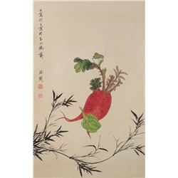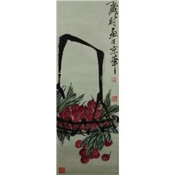 A basket of lychee; Chinese ink and watercolour on paper; hanging scroll; signed Qi Baishi and inscribed with three artist seals; 200 cm X 46 cm