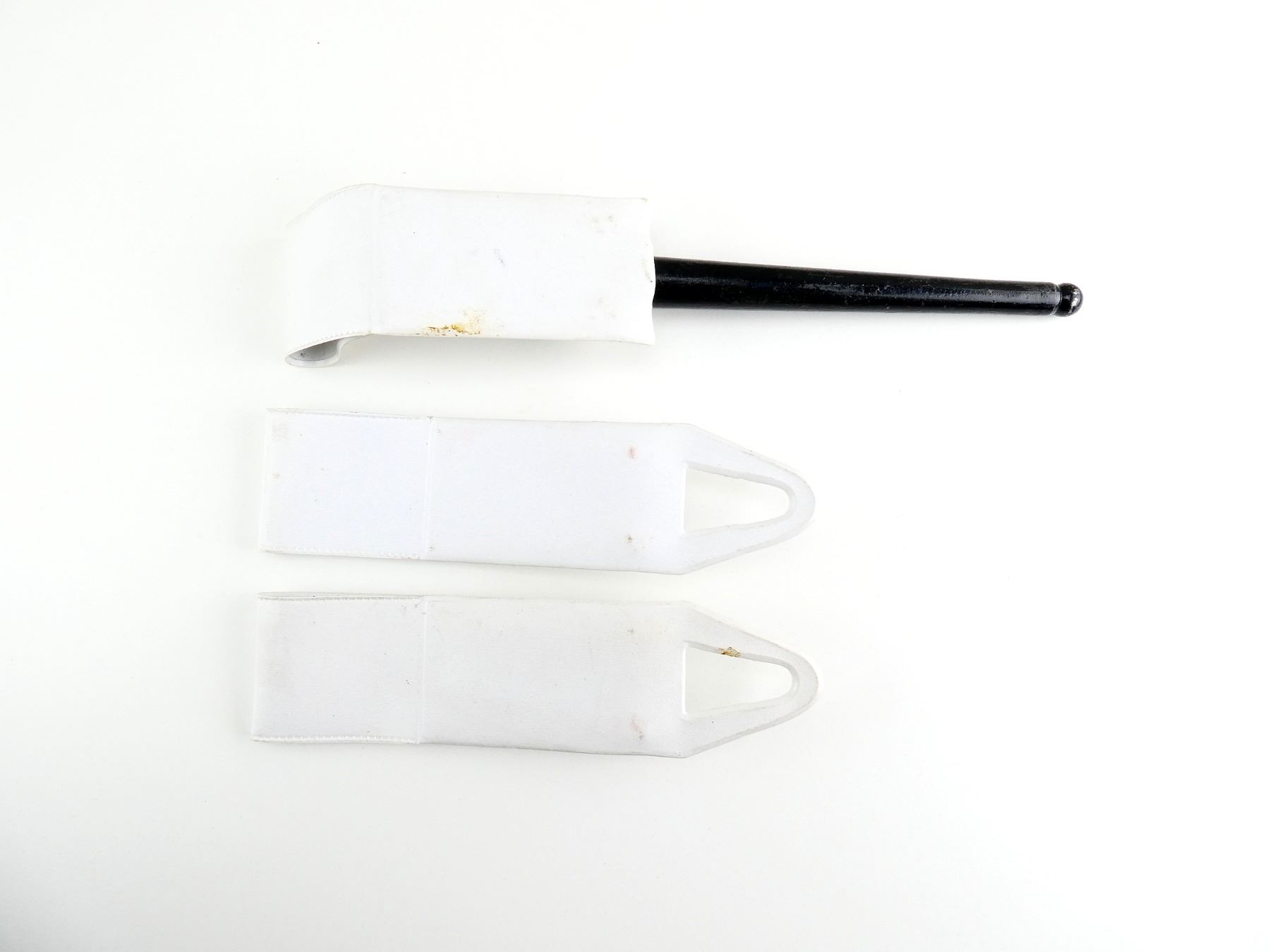 LOT INCLUDES; (1) FITS NO.4 MKII & NO.4 MKII* SPIKE BAYONETS, BLACK PAINTED STEEL NO.4 MKI SPIKE BAYONET SCABBARD (NO BAYONETS), NO VISIBLE MARKINGS, PART OF THROAT IS BROKEN / MISSING, WITH WHITE PLASTIC BAYONET FROG, OAL APPROX. 8.25" & (2) WHITE PLASTIC NO.4 MKII BAYONET FROGS, NO VISIBLE MARKINGS, OALS APPROX. 7.75". SEE PHOTOS.