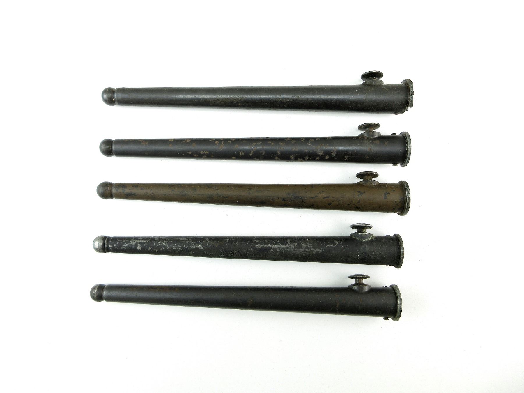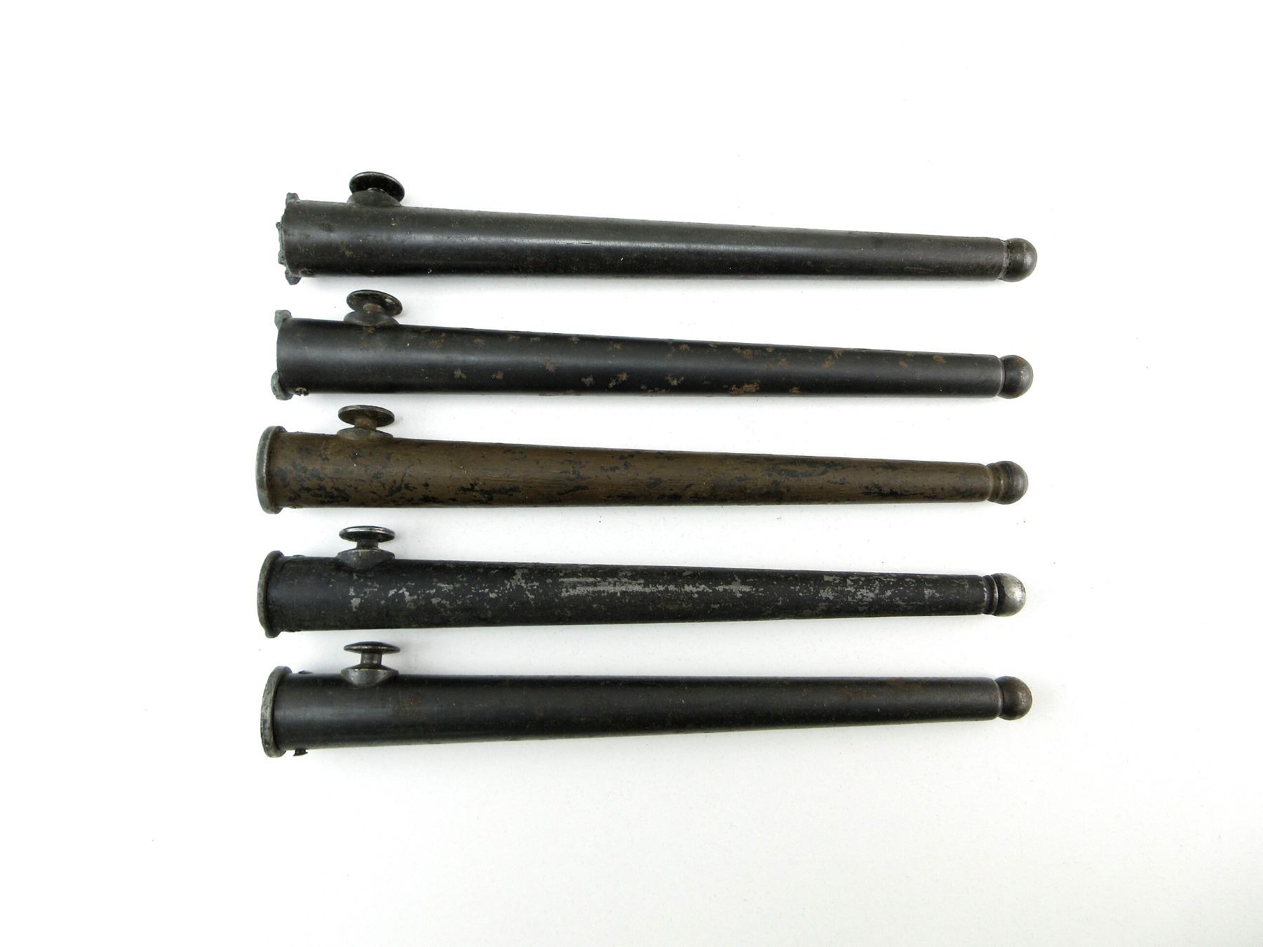 LOT INCLUDES; (5) BLACK PAINTED STEEL NO.4 MKI SPIKE BAYONET SCABBARDS (NO BAYONETS), THREE HAVE NO VISIBLE MARKINGS, ONE UN-MARKED SCABBARD THROAT IS CRACKED / MISSING HALF, ONE WITH THROAT MARKED: "NO4 MKI, S.S.P. 1943" WITH BROAD ARROW & ONE MARKED: "NO 4 MK" & MISSING PIECE OF THROAT, OALS APPROX. 8.25" & 8 3/8". SEE PHOTOS.
