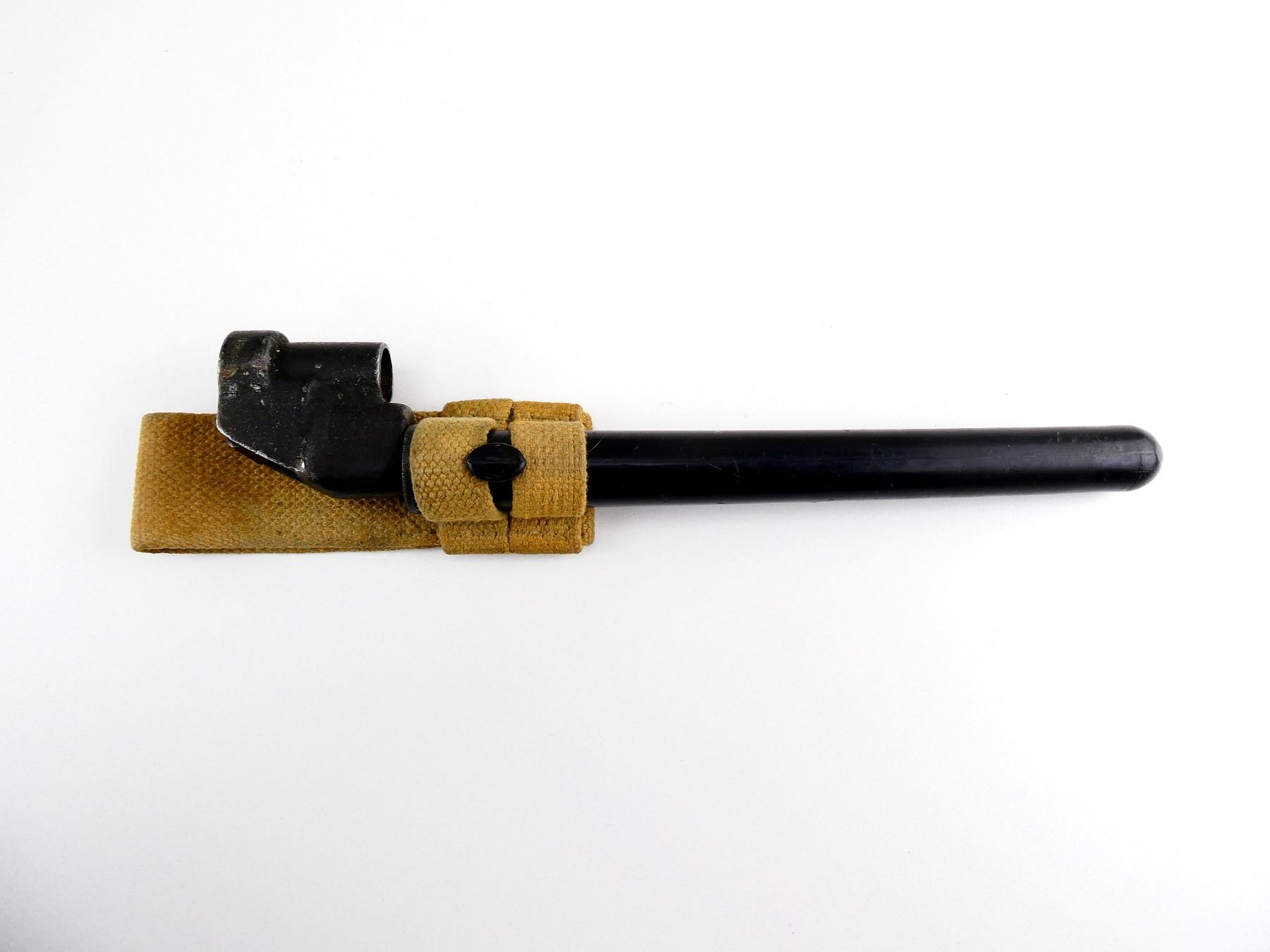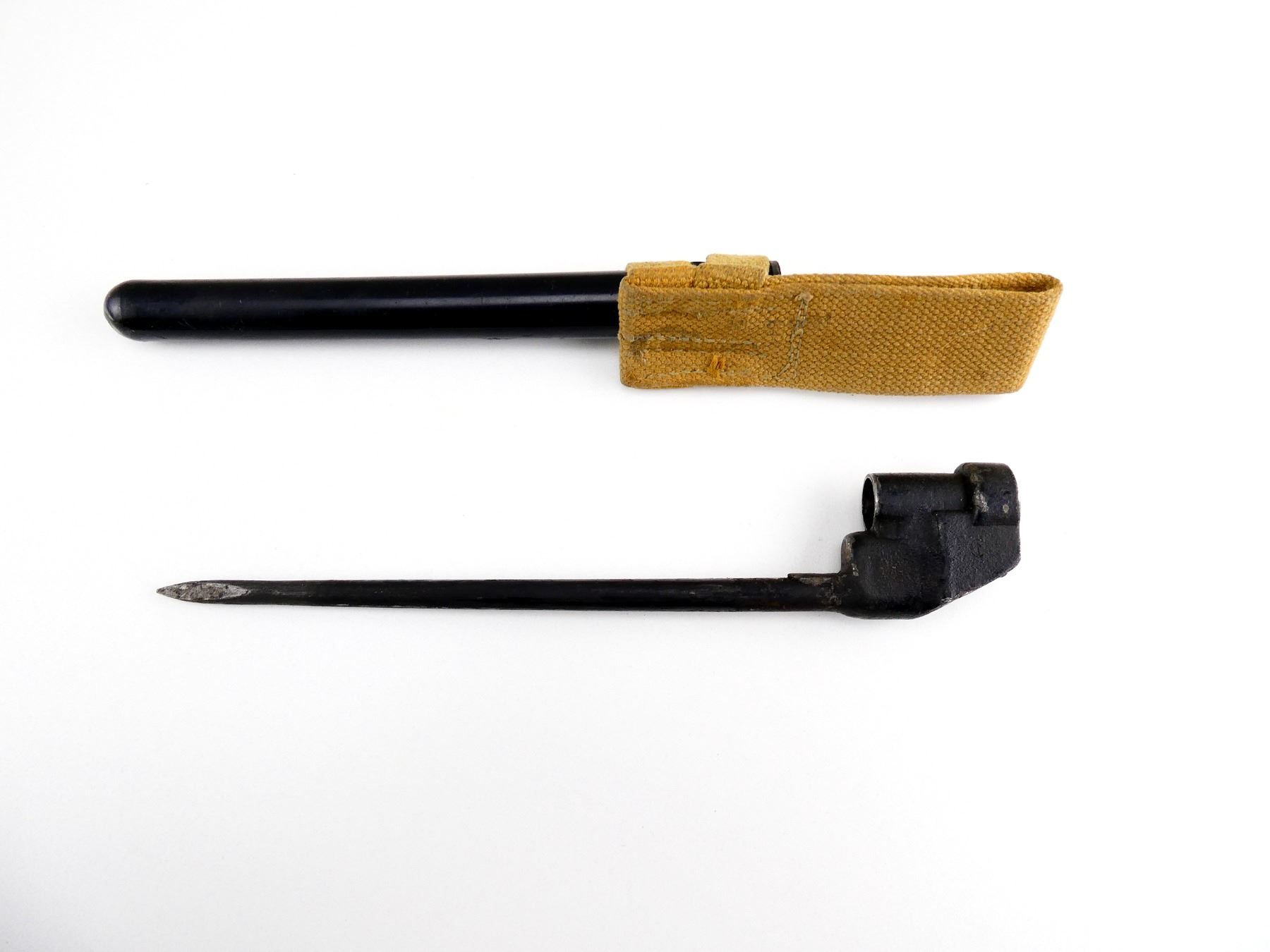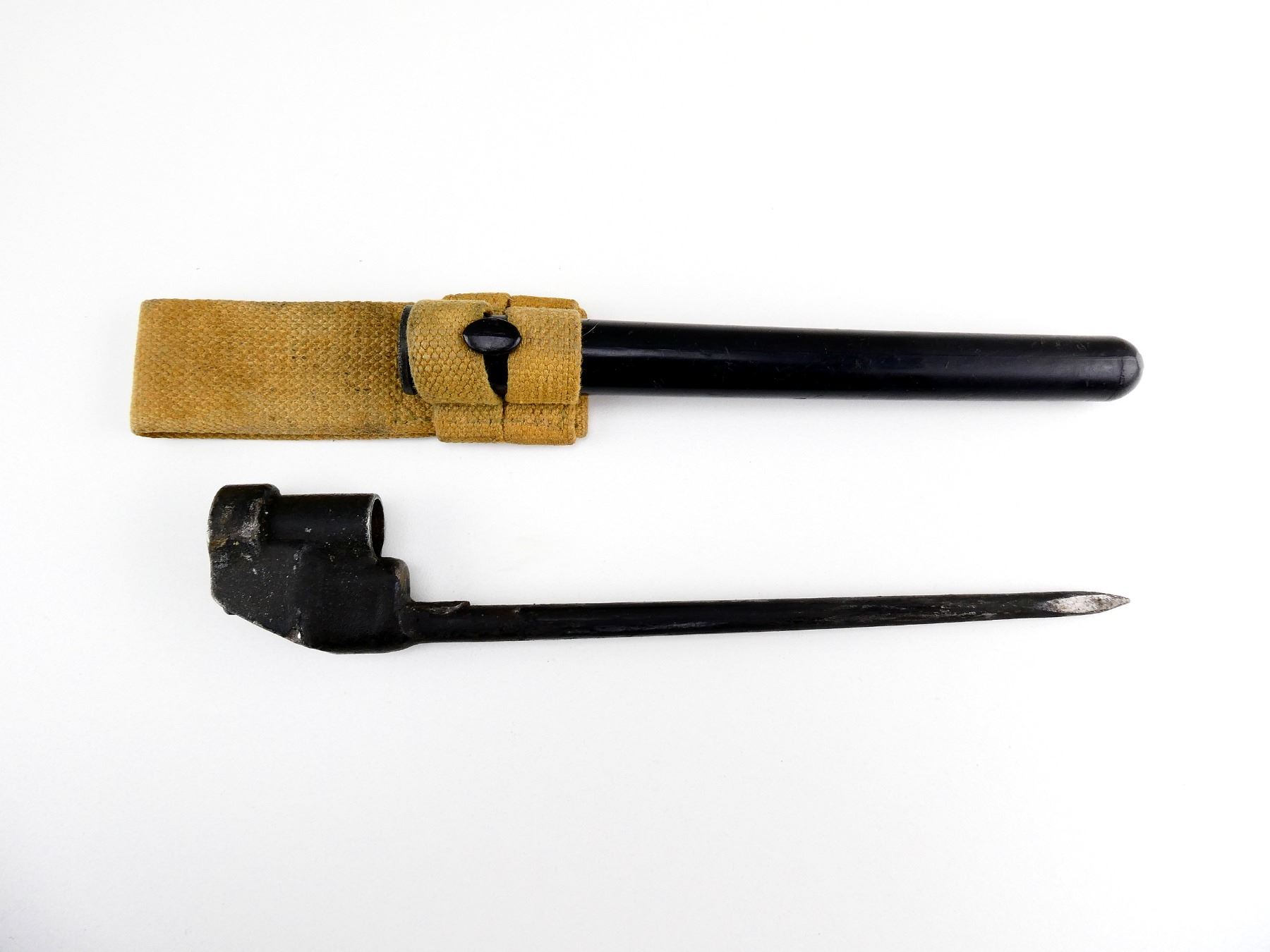 (1) NO.4 MKIII SPIKE BAYONET, FITS LEE ENFIELD NO.4 MKI & MKII SERIES RIFLES, SOCKET MARKED: "M/158" WITH BROAD ARROW & C-BROAD ARROW MARK, BLACK POLYMER MKIII SCABBARD WITH TAN P37 WEB FROG, NO VISIBLE MARKINGS ON SCABBARD, VARIOUS FAINT MARKINGS ON CANVAS FROG, BLADE APPROX. 8", OAL APPROX. 9 7/8". SEE PHOTOS.