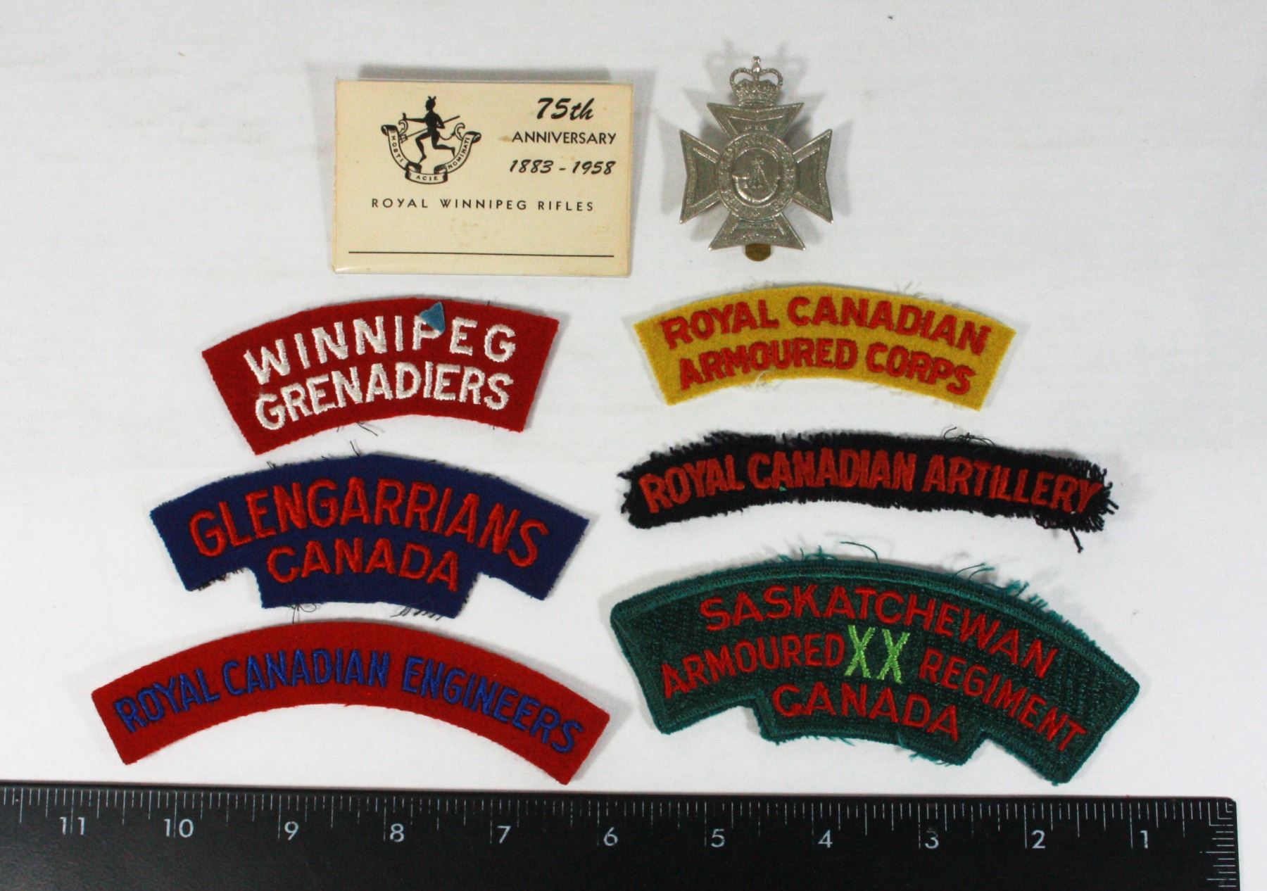 MAKER MARKED ON REVERSE CANADIAN CANADA MILITARY ARMY COLD WAR ERA QUEEN ELIZABETH II QEII CAP BADGE, 1950'S 6 CANADIAN MILITARY SHOULDER TITLES INCLUDING ROYAL CANADIAN ARMOURED CORPS GENGARRIANS WINNIPEG GRENADIERS 1950'S 1960'S ERACOLD WAR ALLIED FORCES, AND ROYAL WINNIPEG RIFLES ID CARD 1958 75TH ANNIVERSARY CANADIAN MILITARY