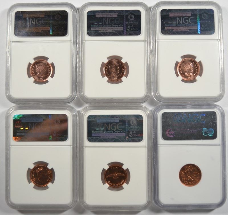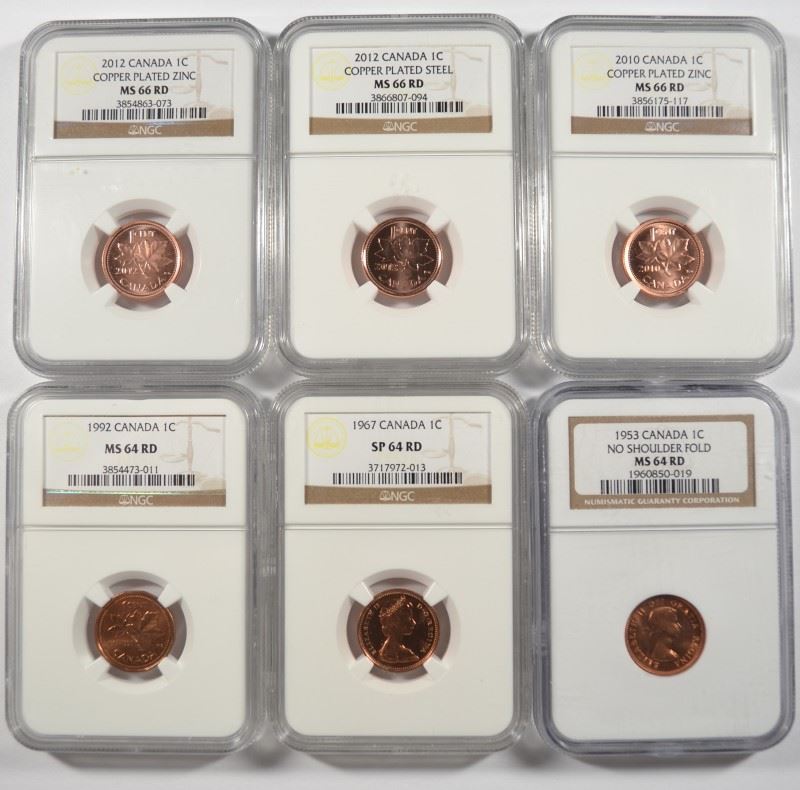 1953 MS-64 RED, 1967 SP-64 RED, 1992 MS-64 RED, 2010 COPPER PLATED ZINC MS-66 RED, ( 2 ) 2012 COPPER PLATED STEEL, MS-66 RED, ESTIMATE $200.00 TO $250.00