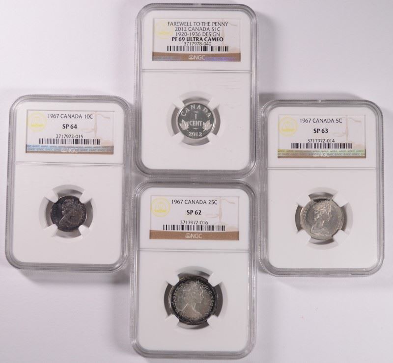 2012 FAREWELL TO THE PENNY, NGC PF-69 ULTRA CAMEO, 1967 NICKEL NGC SP-63, 1967 DIME, SP-64, 1967 QUARTER, SP-62, ESTIMATE, $175.00 TO $200.00
