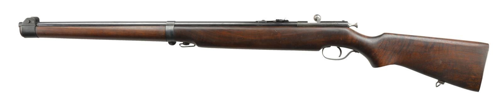Cal. 22 LR. B2165. Bbl. 27". Mfg. Pre 1961. Single shot bolt action Cooey Canadian military training rifle. Mannlicher type stock cut square at muzzle. 2 Bbl. bands. Slotted blade front sight & elevation adj. rear. Mid & rear sling swivels. 34,810 mfg. for Canadian Government in 1944. This rifle is numbered B2165 on pistol grip w/ No "67" cartouche on action. CONDITION: blued finish on exposed surfaces remains complete & consistent w/ some thinning on high spots & in areas of mechanical intervention. Wooden stock displays scattered minor dents & impressions. Bright bore w/ strong rifling. Fire control mechanism appears to function correctly when cycled by hand. (22-571/JZ). CURIO. $200-400.