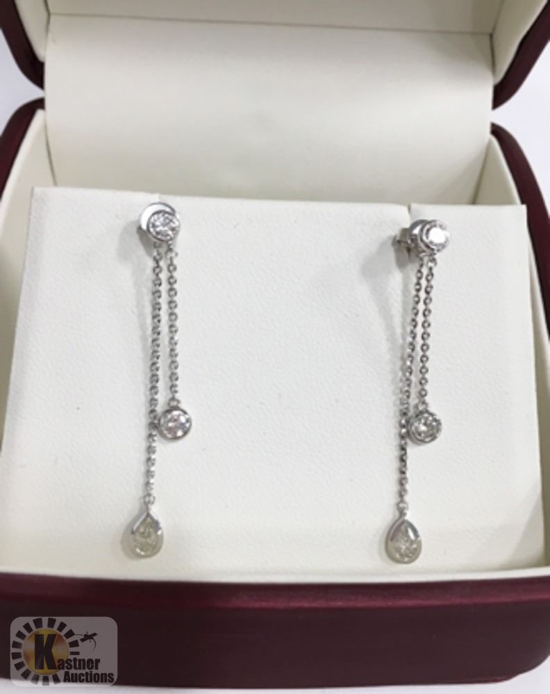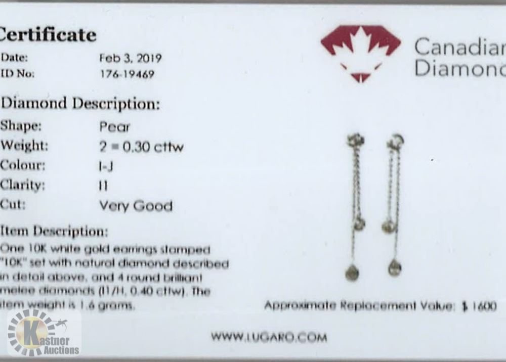 WEIGHT: 0.16 GRAMS METAL: 10K WHITE GOLD CENTER DIAMONDS CARAT: 2=0.30 CTS T.W. CLARITY: I1 COLOUR: I-J CUT: PEAR SHAPE ACCENT DIAMONDS CARAT: 4 =0.40 CTS T.W. CLARITY: I1 COLOUR: H CUT: ROUND BRILLIANT CDC CERTIFIED APPROXIMATE REPLACEMENT VALUE: $1600.00 SKU:176-19469