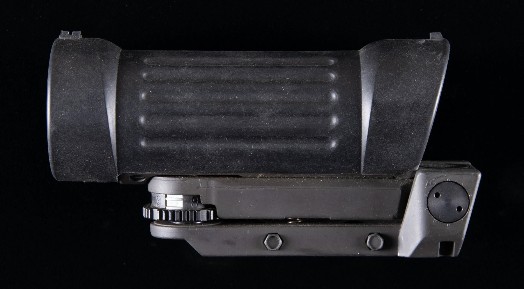 Adopted in 1989 & used on service rifles, the 3.4x28 scope has a Tritium illuminated reticle. The rail appears to be a Weaver as opposed to a picatinny, although an adapter was available for the latter rail. The scope has heavy rubber armoring w/ a fixed emergency sight molded on top. The reticle is a vertical pointed post & has horizontal lines, one of which aids in range-finding. The scope mount is adjustable for windage & elevation. Tritium trefoil is molded underneath eyepiece. Serial number is "SER-92-20716". CONDITION: scope has light wear & tiny handling marks. Optics appear clear & serviceable. (02-24538-10/RW). NON-GUN. $600-900.