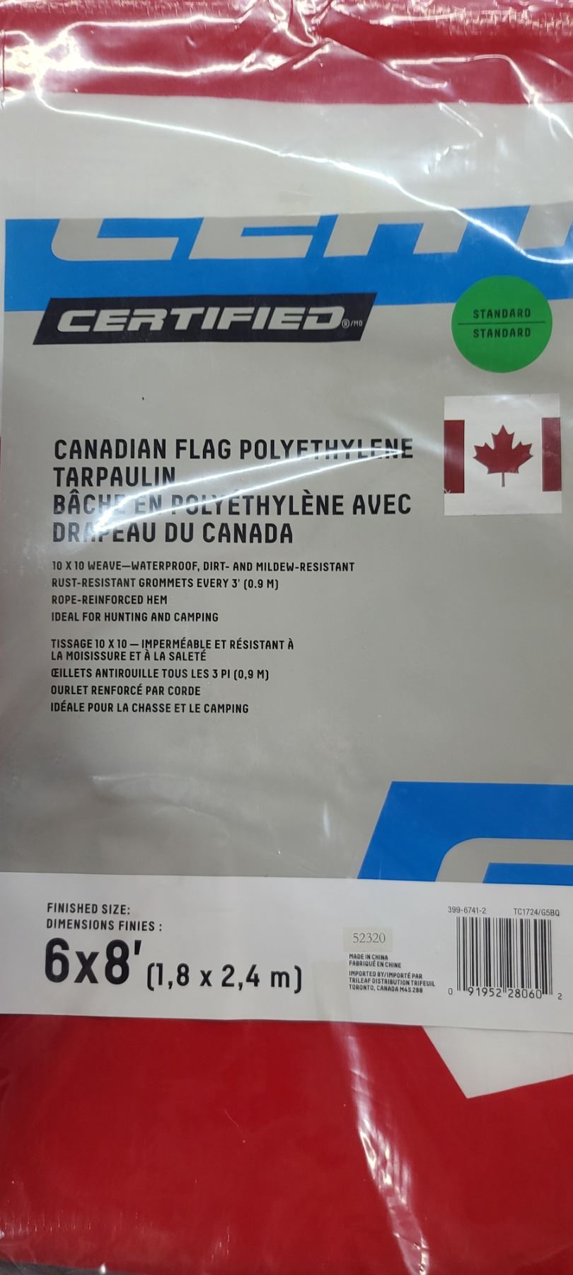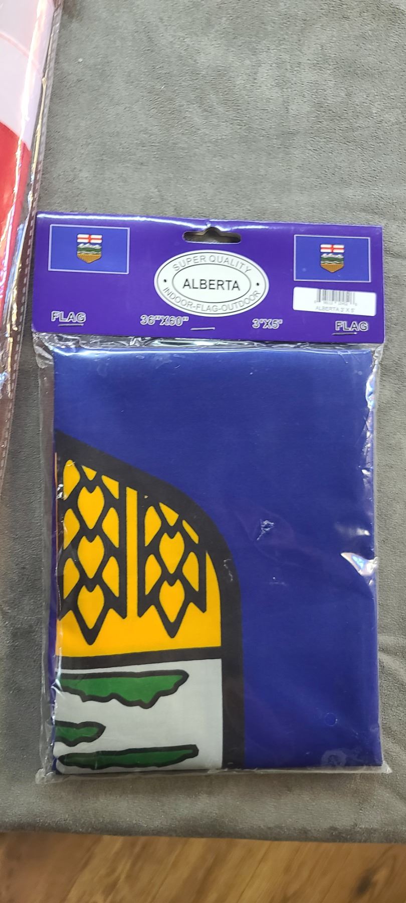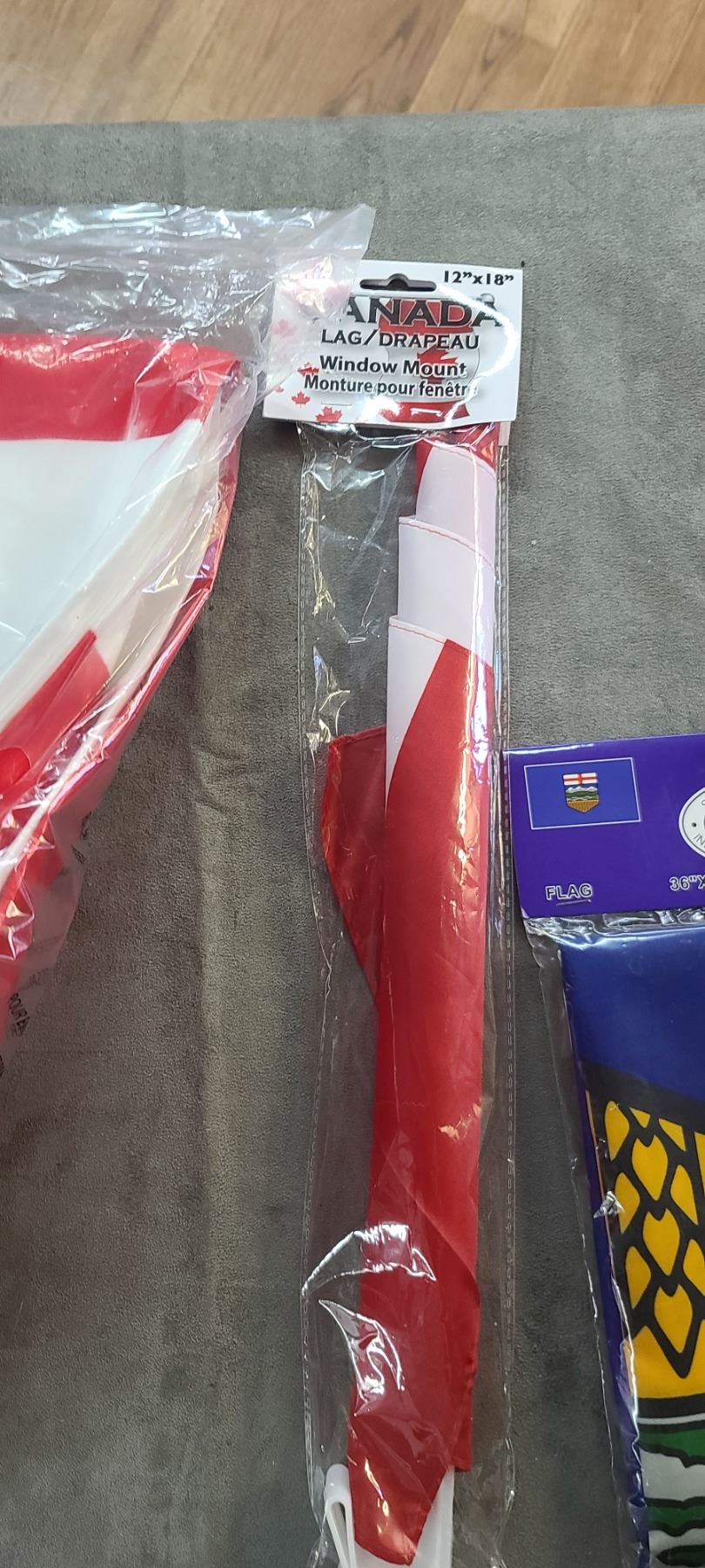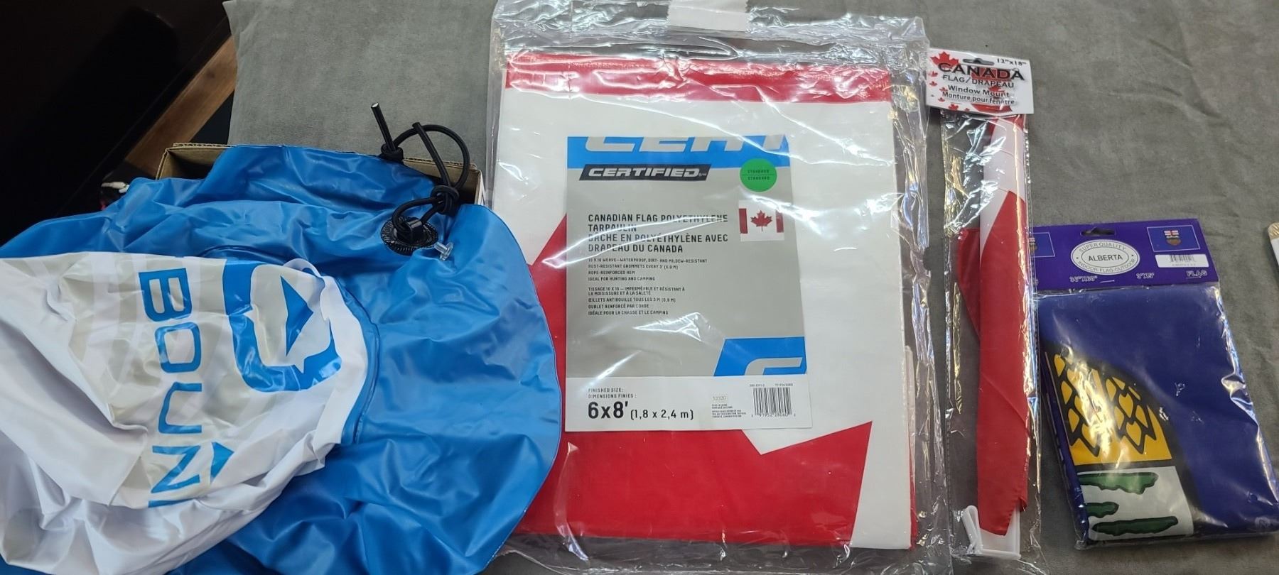 CANADIAN FLAG TARPAULIN 6' X 8'. ALBERTA FLAG 3' X 5', AND CANADA CAR FLAGS