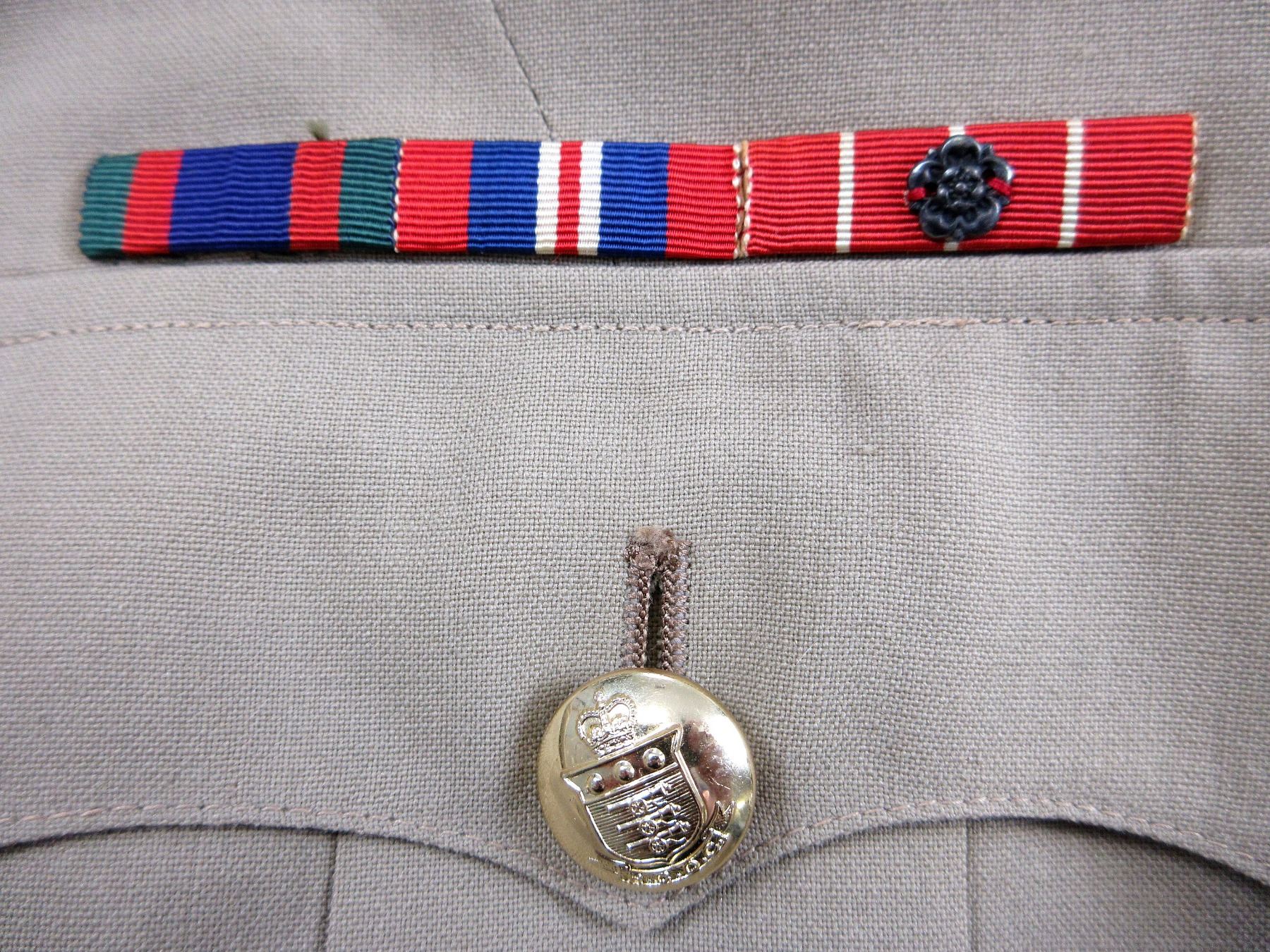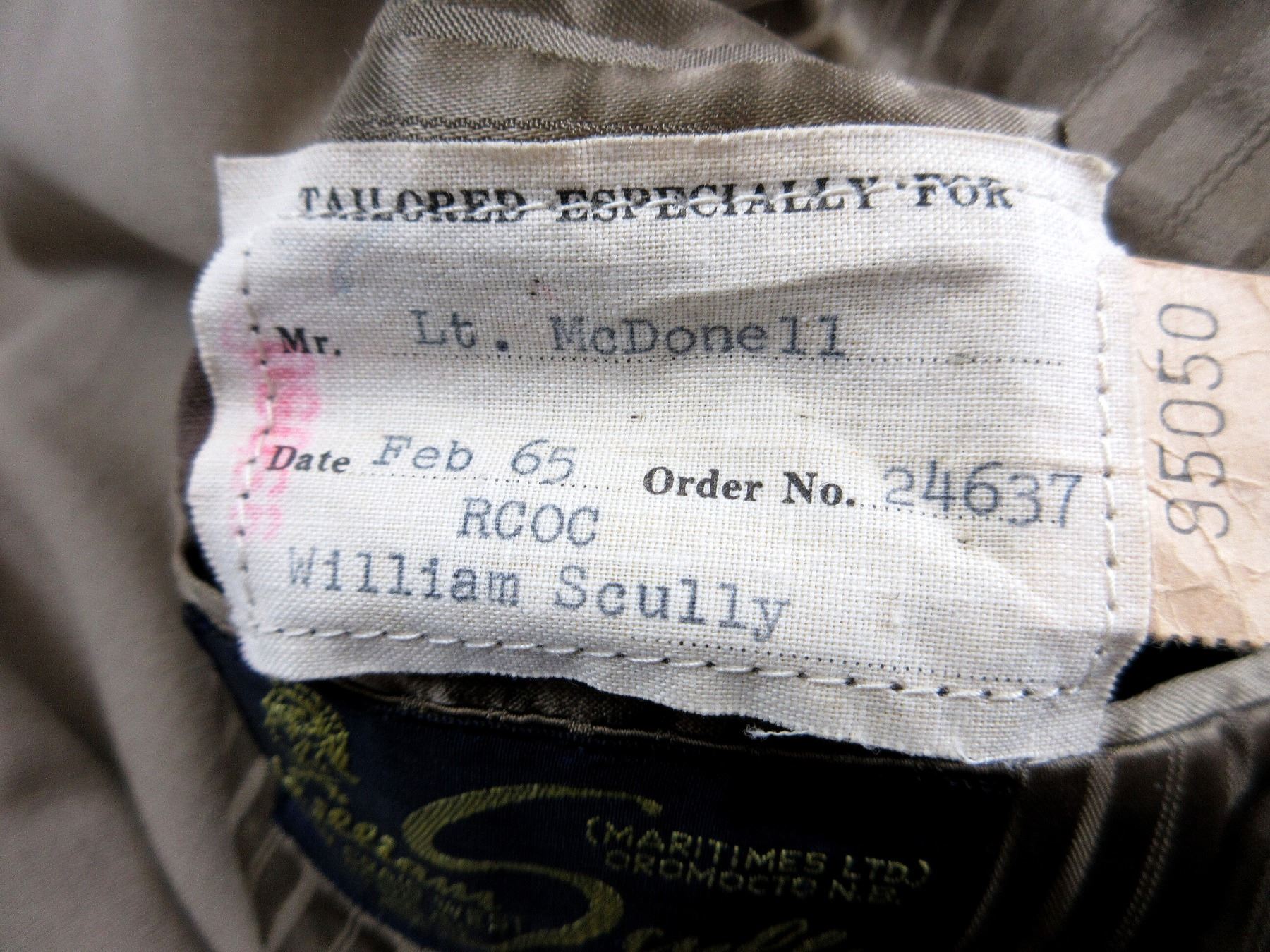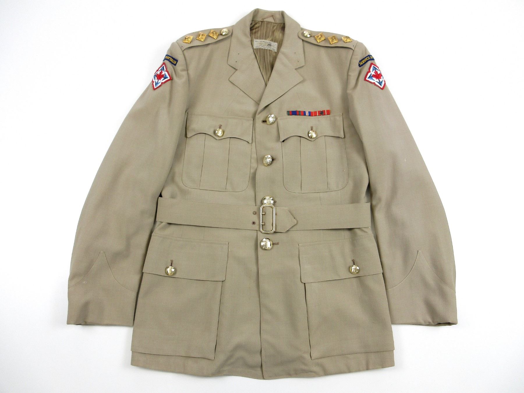 (1) TAN TUNIC, MARKED: "MR. LT. MCDONELL, DATE: FEB 65, ORDER NO. 24637, RCOC, WILLIAM SCULLY" & VARIOUS OTHER MARKINGS / LABELS, SIX SHOULDER RANK PIPS, SERVICE BATTALION SHOULDER BADGES, MOBILE COMMAND BADGES, RIBBON BAR (CANADIAN VOLUNTARY SERVICE MEDAL, 1939-1945 WAR MEDAL, CANADIAN FORCES' DECORATION MEDAL WITH ROSET), RCOC BUTTONS, BUTTON FRONT, WITH WAIST BELT, SHOULDER WIDTH APPROX. 17". SEE PHOTOS.