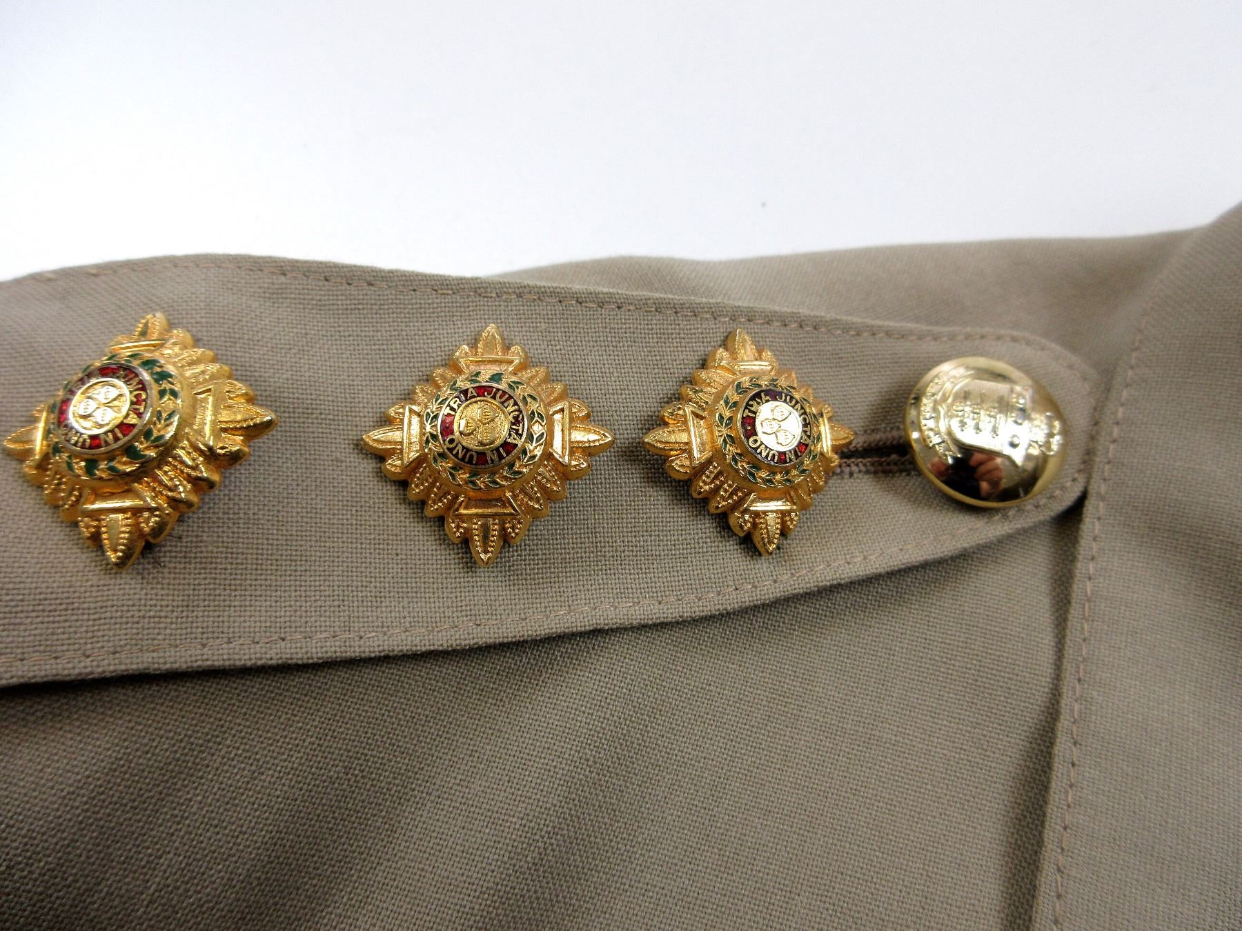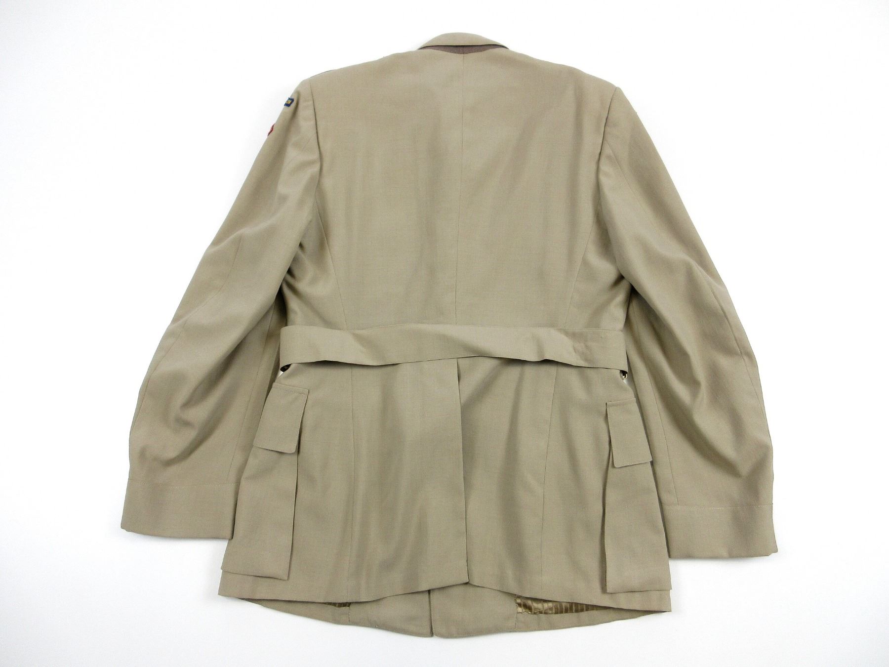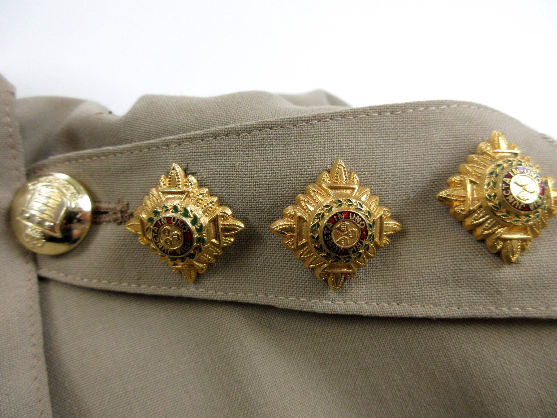 (1) TAN TUNIC, MARKED: "MR. LT. MCDONELL, DATE: FEB 65, ORDER NO. 24637, RCOC, WILLIAM SCULLY" & VARIOUS OTHER MARKINGS / LABELS, SIX SHOULDER RANK PIPS, SERVICE BATTALION SHOULDER BADGES, MOBILE COMMAND BADGES, RIBBON BAR (CANADIAN VOLUNTARY SERVICE MEDAL, 1939-1945 WAR MEDAL, CANADIAN FORCES' DECORATION MEDAL WITH ROSET), RCOC BUTTONS, BUTTON FRONT, WITH WAIST BELT, SHOULDER WIDTH APPROX. 17". SEE PHOTOS.