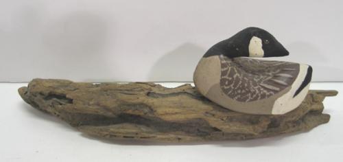 MINIATURE CANADIAN GOOSE PREENING CARVING. Attached to driftwood base. Unmarked. 10” L