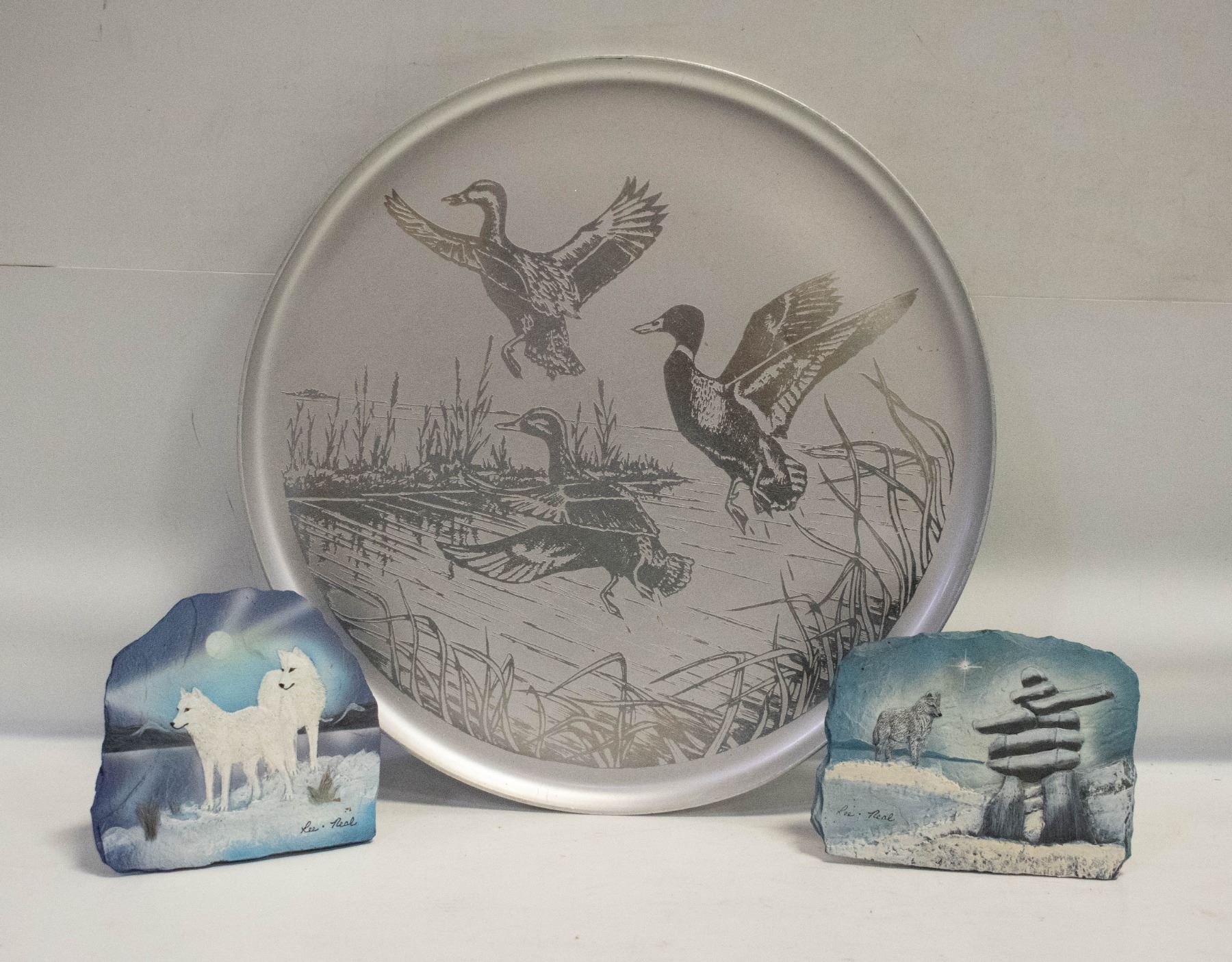 PLATTER + 2 HAND PAINTED STONES WOLF SCENES **ALL ITEMS MUST BE REMOVED BY 5PM SATURDAY, NOVEMBER 29TH 2025. ALL REMAINING ITEMS WILL BE SUBJECT TO A $6.00 PER DAY STORAGE CHARGE. ANY ITEMS REMAINING AFTER MONDAY, DECEMBER 15TH 2025 WILL BE CONSIDERED FORFEITED. NO REFUNDS WILL BE ISSUED FOR FORFEITED ITEMS. TO SCHEDULE A PICK UP APPOINTMENT CLICK HERE