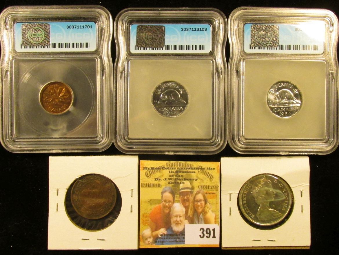 CANADIAN HODGEPODGE LOT INCLUDES 1967 SILVER HALF DOLLAR, 1952 CANADIAN NICKELS GRADED MS60 DETAILS, 1954 CANADIAN NICKEL WITH MS60 DETAILS,1946 CANADIAN PENNY WITH MS60 DETAILS. AND 1916 CANADIAN LARGE CENT
