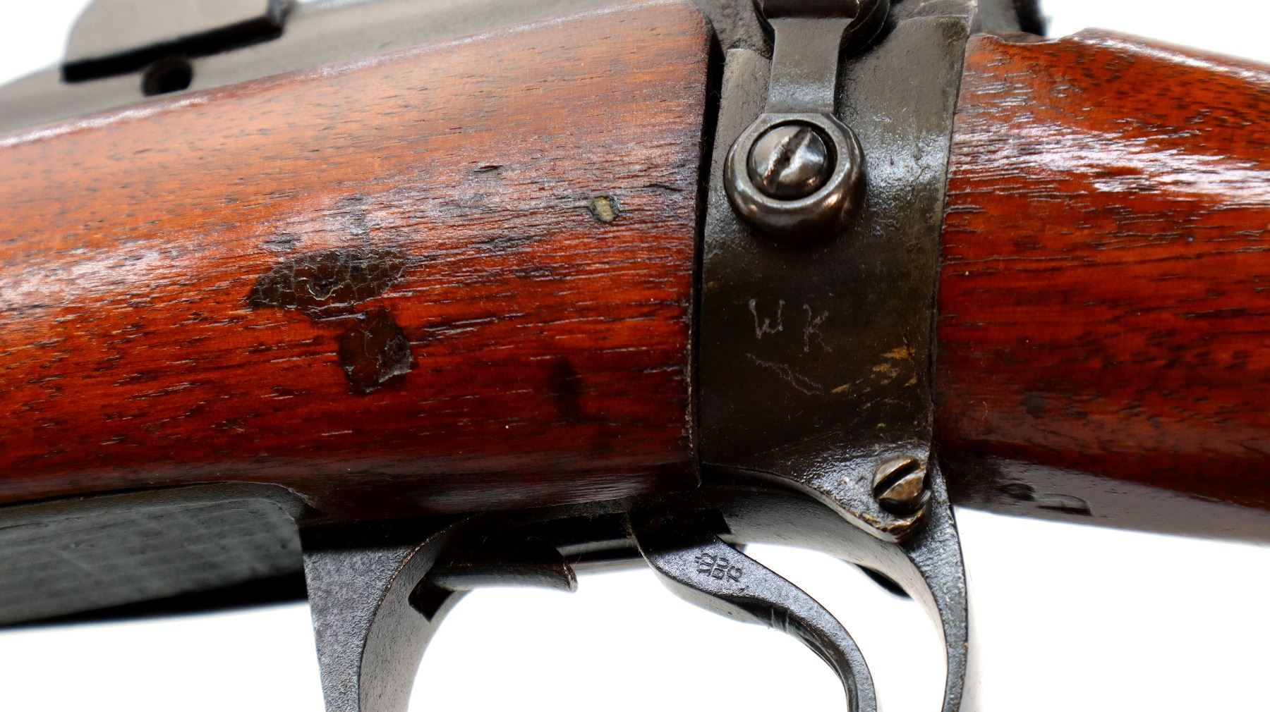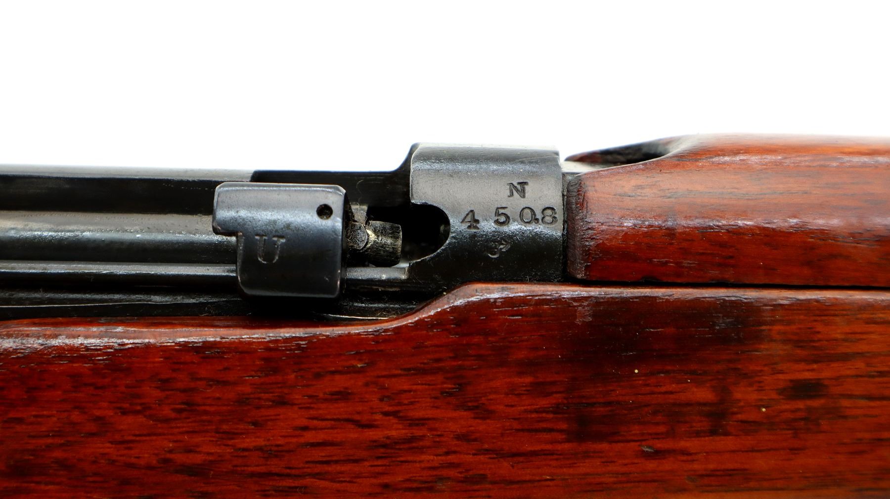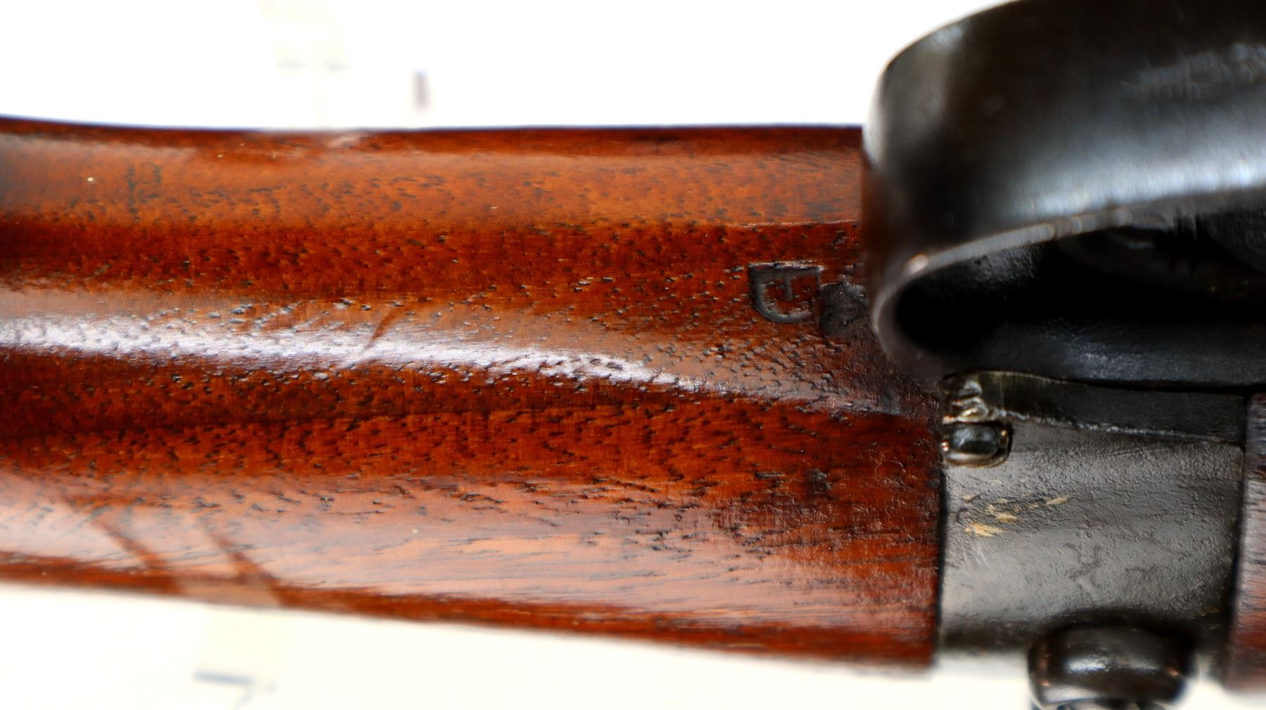 Main Description: Manufactured by Enfield 1916, rebuilt numbered to match. Blade front sight with ears and ramp, adjustable u notched rear sight with ears, blued finish, missing ejector screw. Four piece full military wood stocks, pistol grip cracked behind receiver, smooth brass butt plate with trap, sling swivels with P37 canvas web sling, wood block installed in magwell, has a bayonet lug.