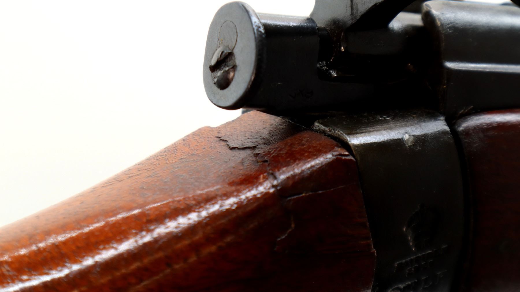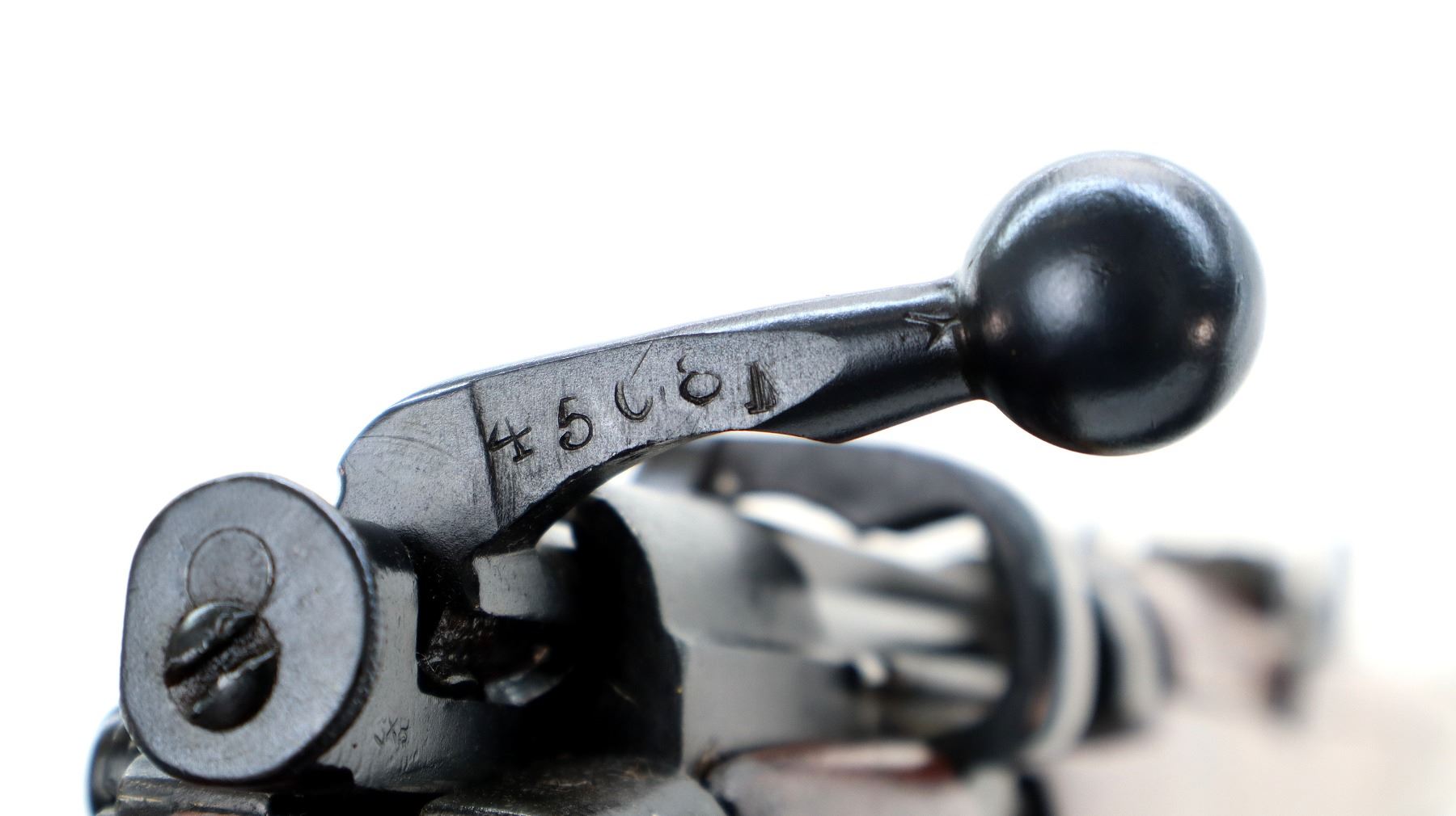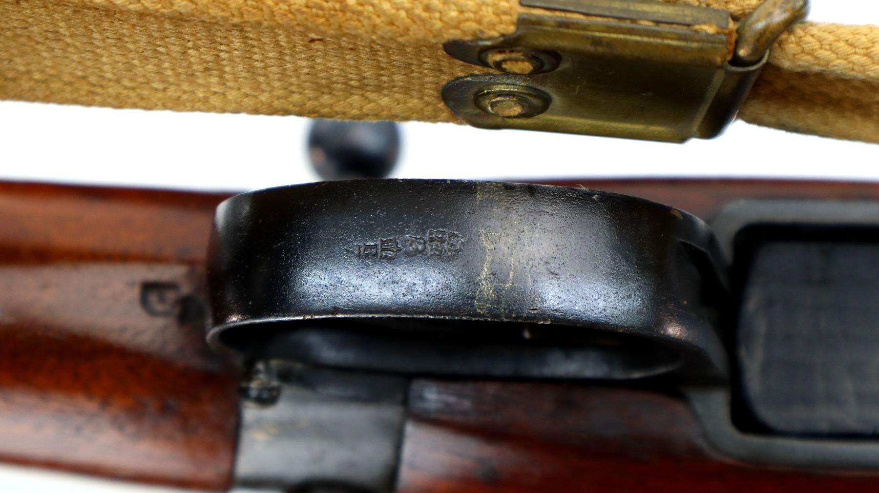 Main Description: Manufactured by Enfield 1916, rebuilt numbered to match. Blade front sight with ears and ramp, adjustable u notched rear sight with ears, blued finish, missing ejector screw. Four piece full military wood stocks, pistol grip cracked behind receiver, smooth brass butt plate with trap, sling swivels with P37 canvas web sling, wood block installed in magwell, has a bayonet lug.