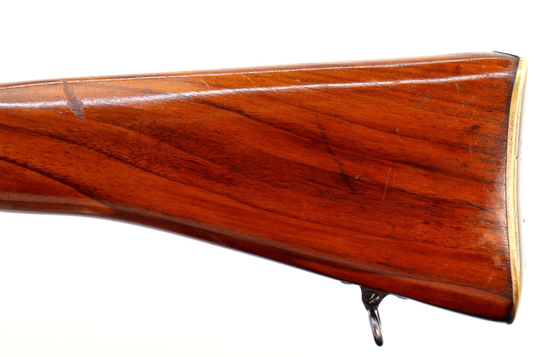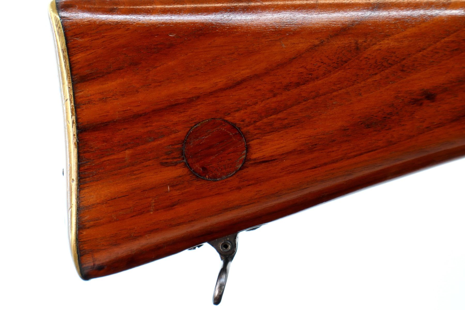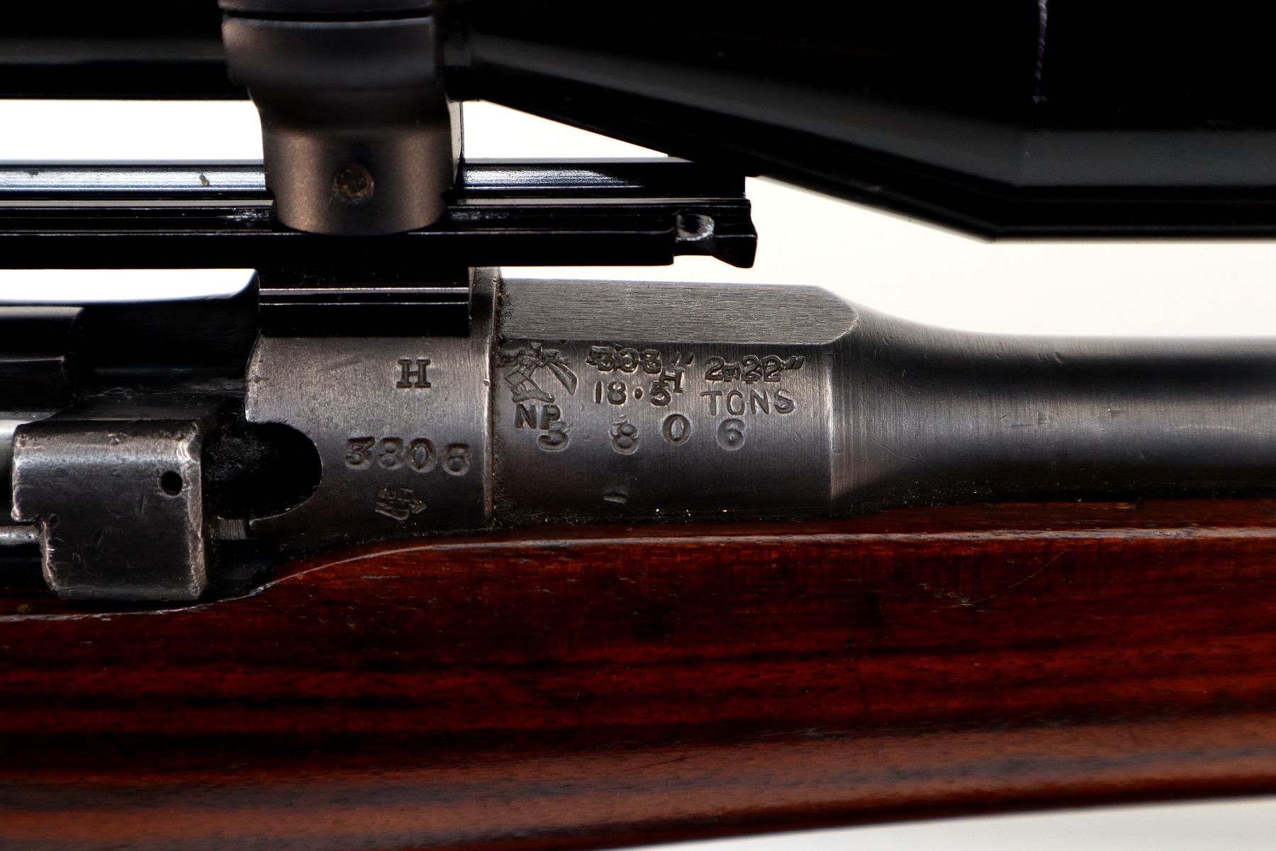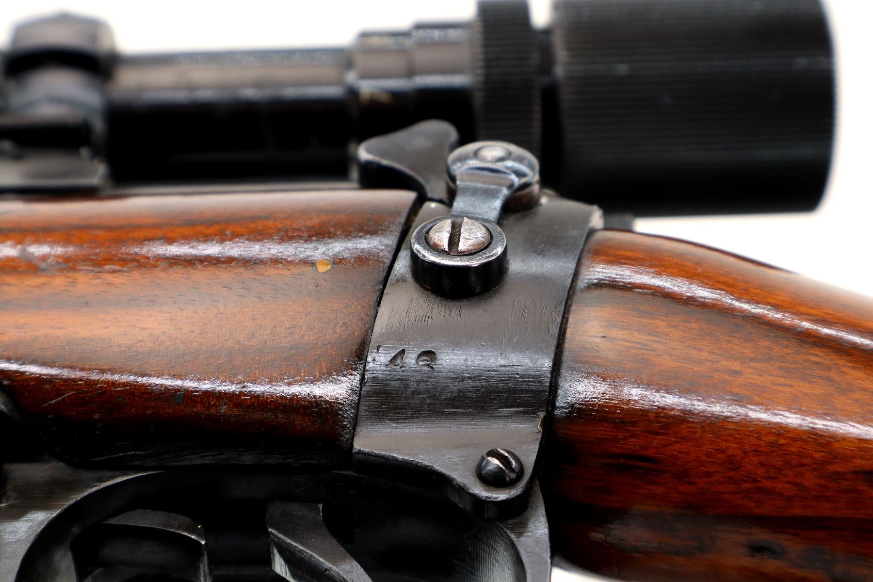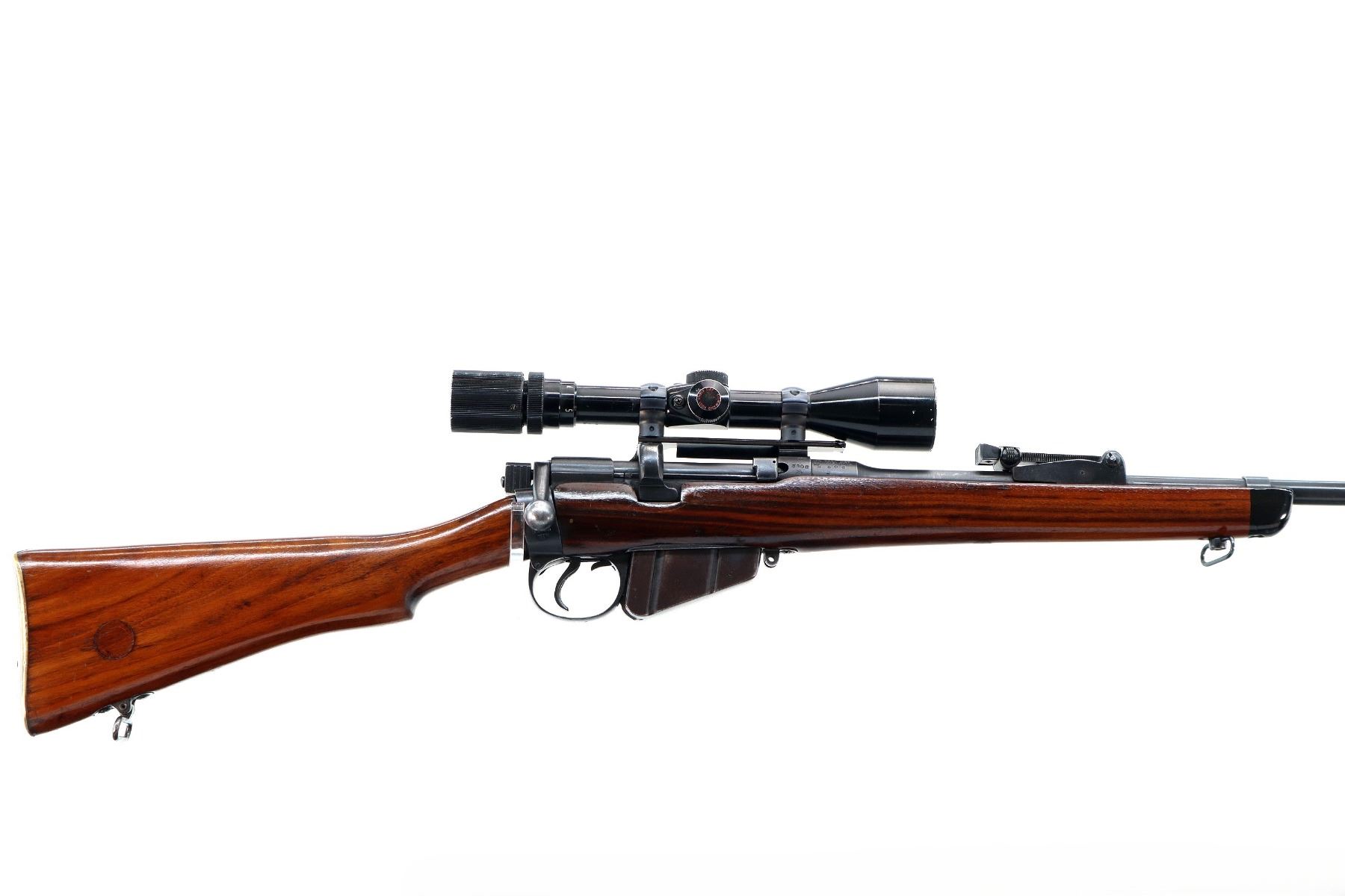 Main Description: Manufactured by Enfield 1919, bolt matches. Blade front sight with ramp, adjustable u notched rear sight, blued finish, C-Broad arrow on front ring and barrel, receiver drilled and tapped with Bushnell Scopechief 3-9 scope installed, clear optics tapered post with fine reticle. Two piece sporterized wood stocks, black painted forend tip, pistol grip, smooth brass butt plate with trap, wood stock disk, sling swivels.