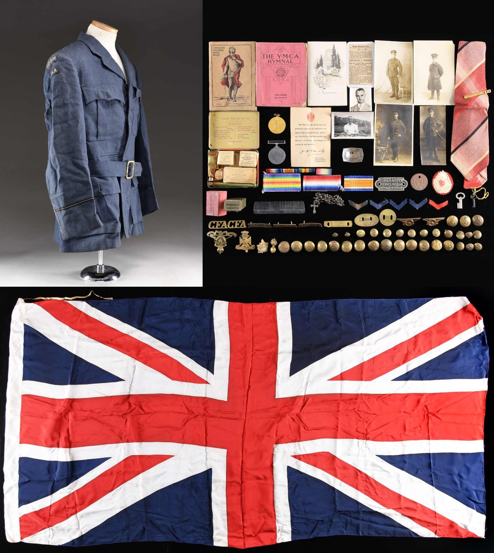 This large group contains several items relating to Charles J. Peppin of Toronto. 1 grayish blue uniform that has been stripped of buttons and other insignia; however, there is a wool patch on the right sleeve that reads "CANADA" in an arc. Below this is a rectangular patch that reads "U.S.A" and the left sleeve has the same "U.S.A" patch. / 1 Union Jack flag measuring approx. 70" x 35". / 1 necktie of the period. / 1 small book titled "CANADIAN SOLDIERS SONG BOOK." / 1 small book titled "THE YMCA HYMNAL." / 2 photographs, presumably of Peppin. / 2 funeral cards belonging to Peppin. / 1 Pressed leather WWI dog tag. / 1 Miniature book titled "PARADISE LOST" by Milton. / 1 unissued WWI Victory Medal, in box, addressed to Peppin. / 1 WWI Service Medal, in box, addressed to Peppin. / 32 Canadian military buttons. / 4 small blue wool chevrons. / 11 Canadian cap and collar insignia. / 2 keys. / 1 hard rubber comb. / 1 wool sacred heart patch. / 1 silvered belt buckle with the initial "P" on the front. / 1 ribbon bar for the British Mons Star. / 1 three-award ribbon bar for the Mons Star, WWI War Service Medal, and WWI Victory Medal. / 4 photographs of Peppin in uniform. / 1 first aid kit in a red tin. / 1 German tin marked "Weinsaure-tabletten". / 1 iron rosary. / 1 metal plate from a coffee machine. CONDITION: The uniform shows wear with visible insect damage. The books are well-used but stable. Most buttons and insignia have a pleasing, tarnished finish. Other items show light wear overall. (02-23767/BF). $200-400.