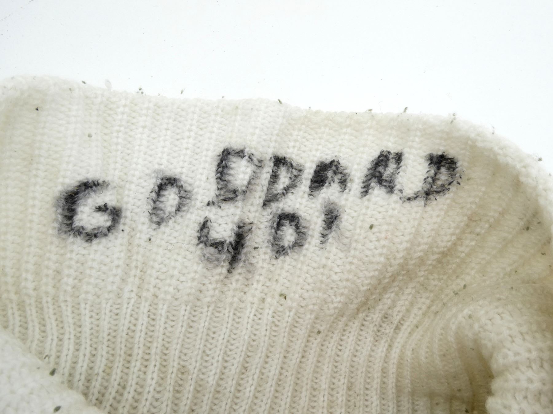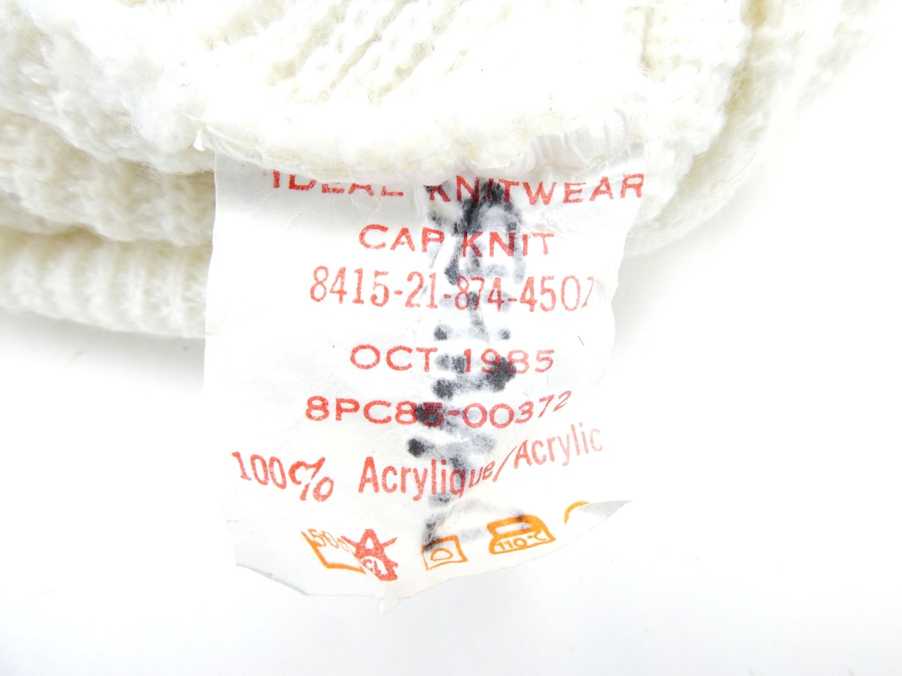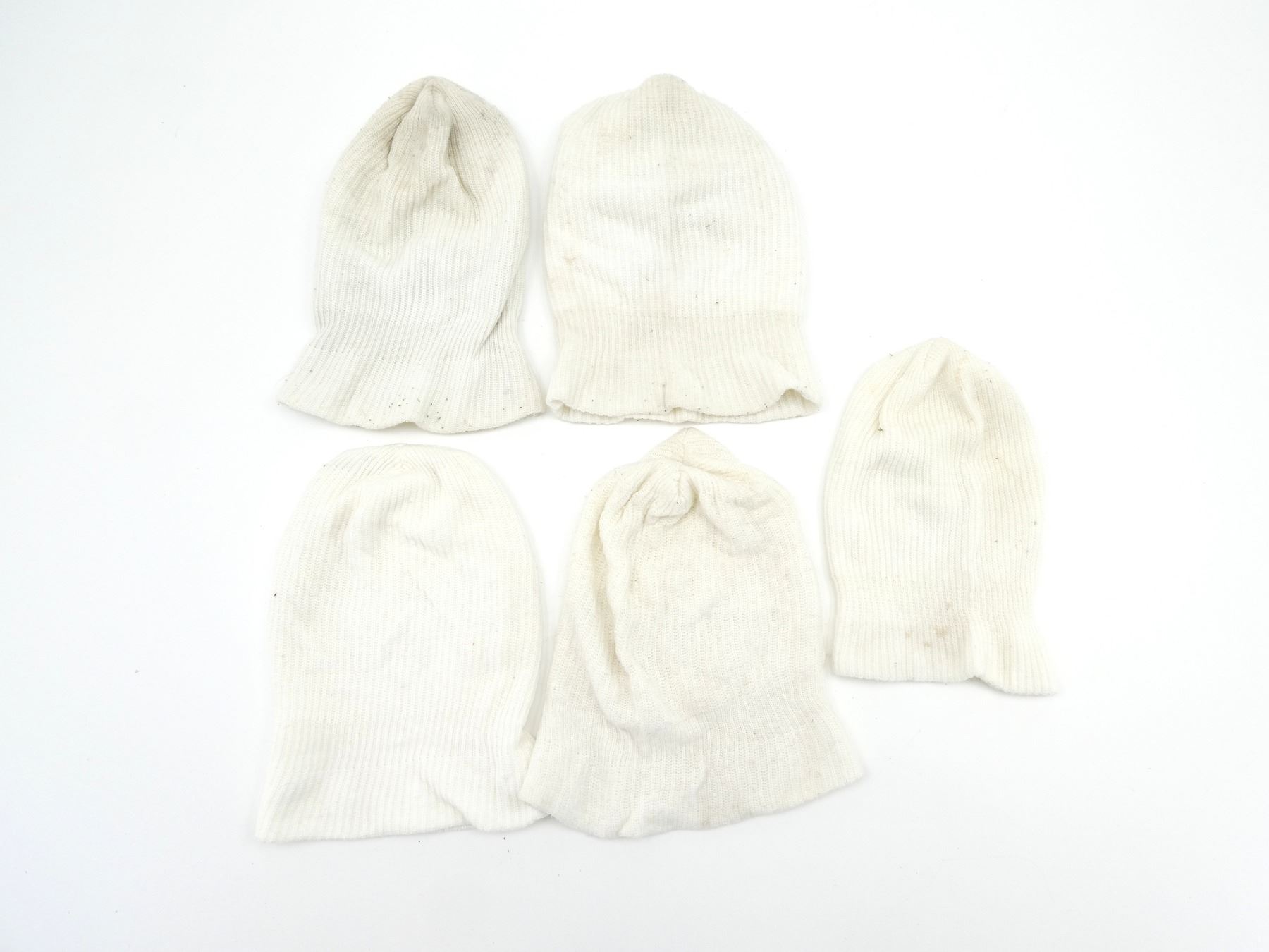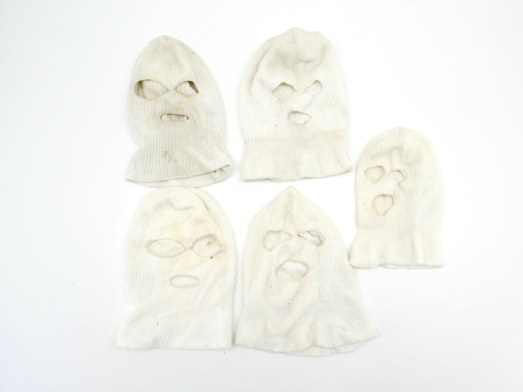 LOT INCLUDES; (5) WHITE KNIT BALACLAVAS, SHOWS WEAR, VARIOUS MARKINGS. SEE PHOTOS.