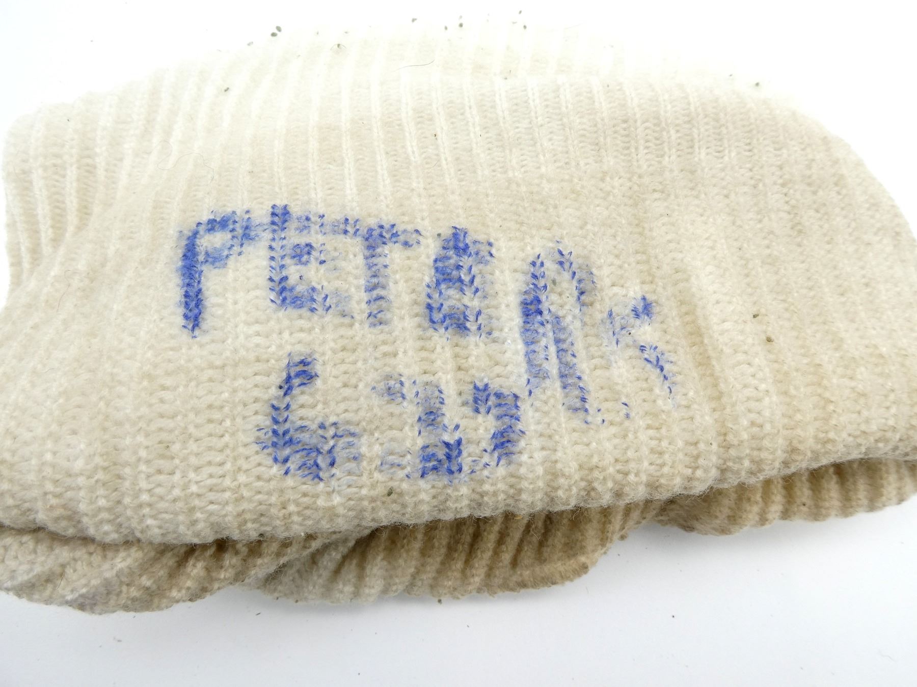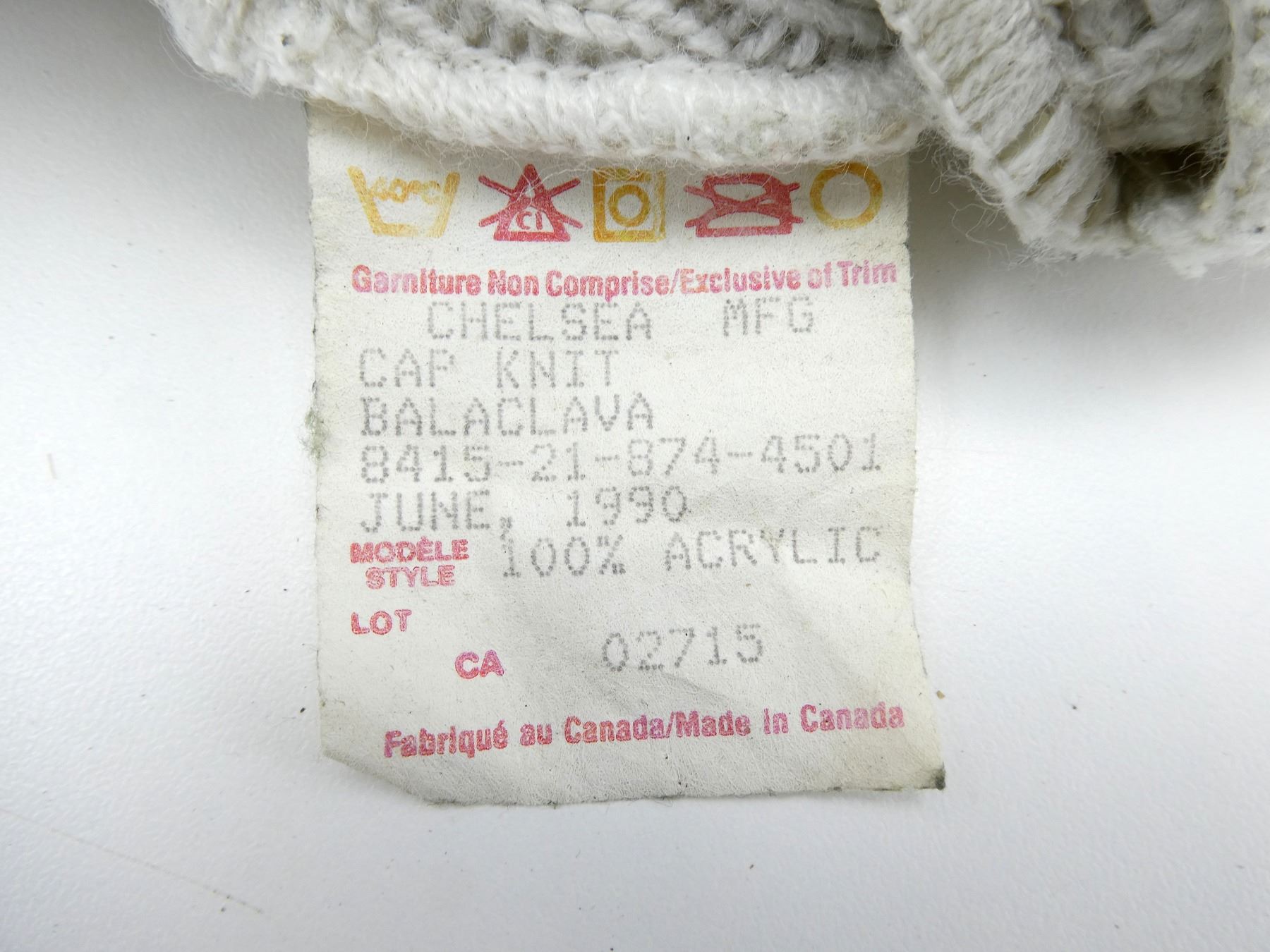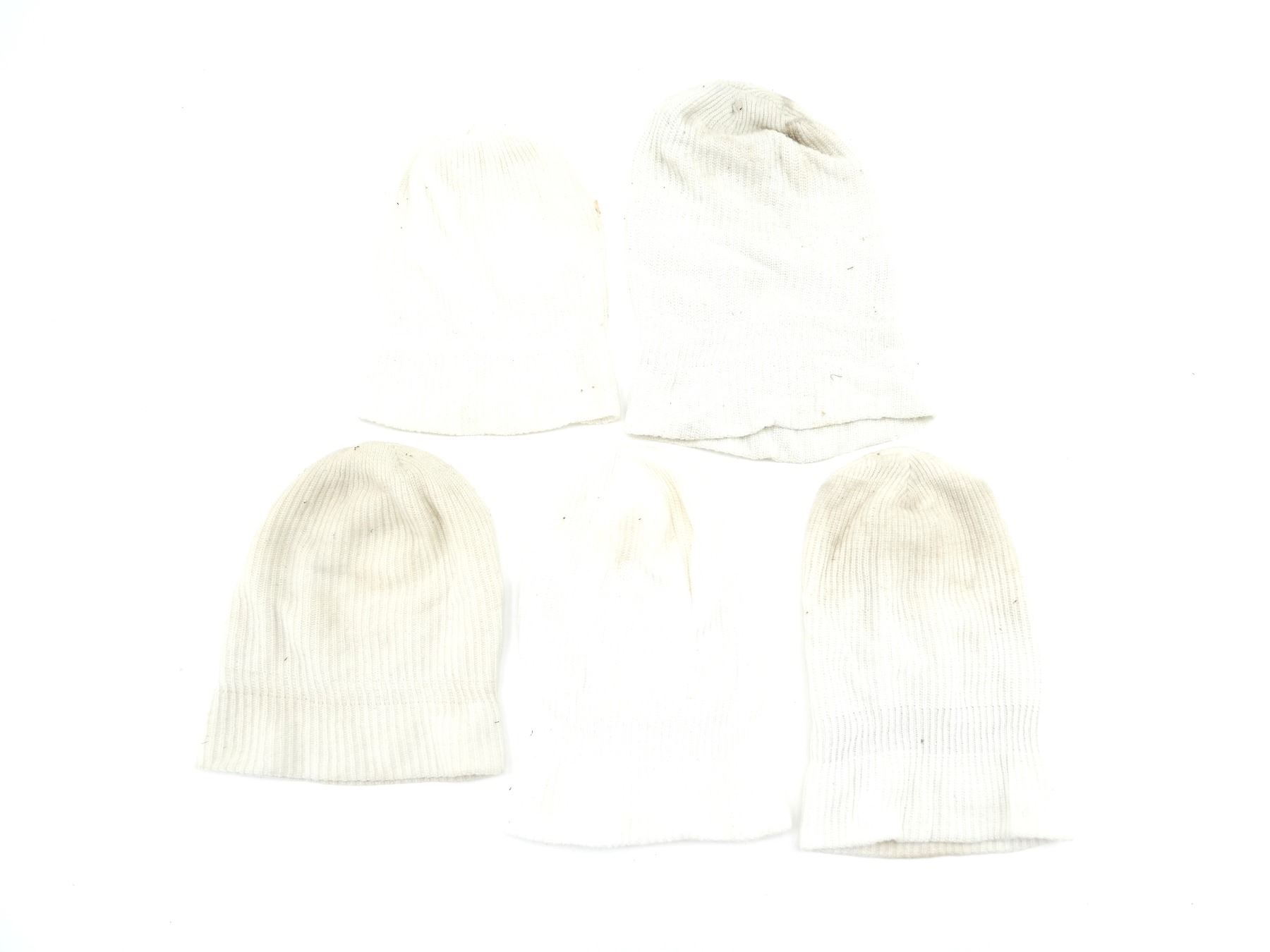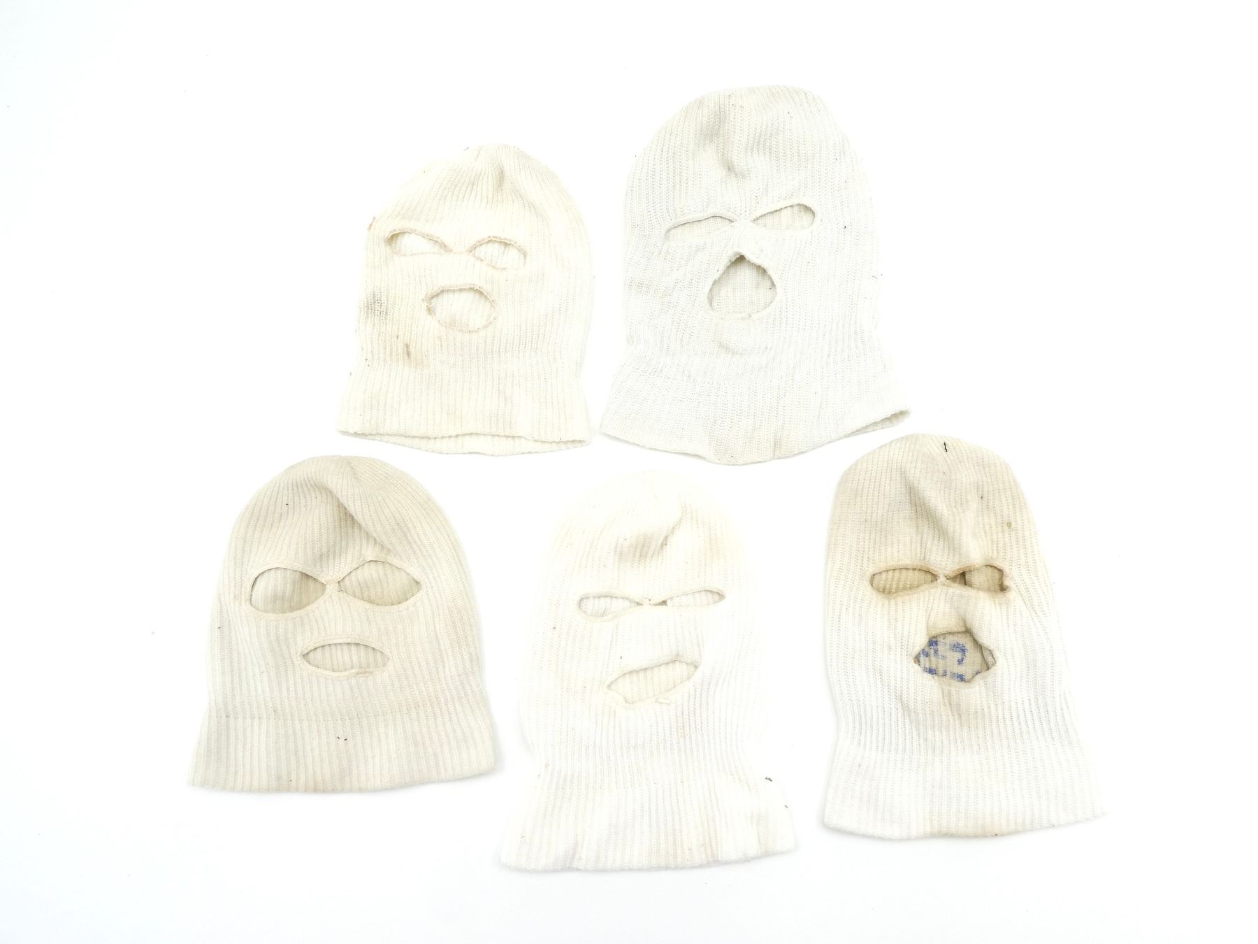 LOT INCLUDES; (5) WHITE KNIT BALACLAVAS, SHOWS WEAR, VARIOUS MARKINGS. SEE PHOTOS.
