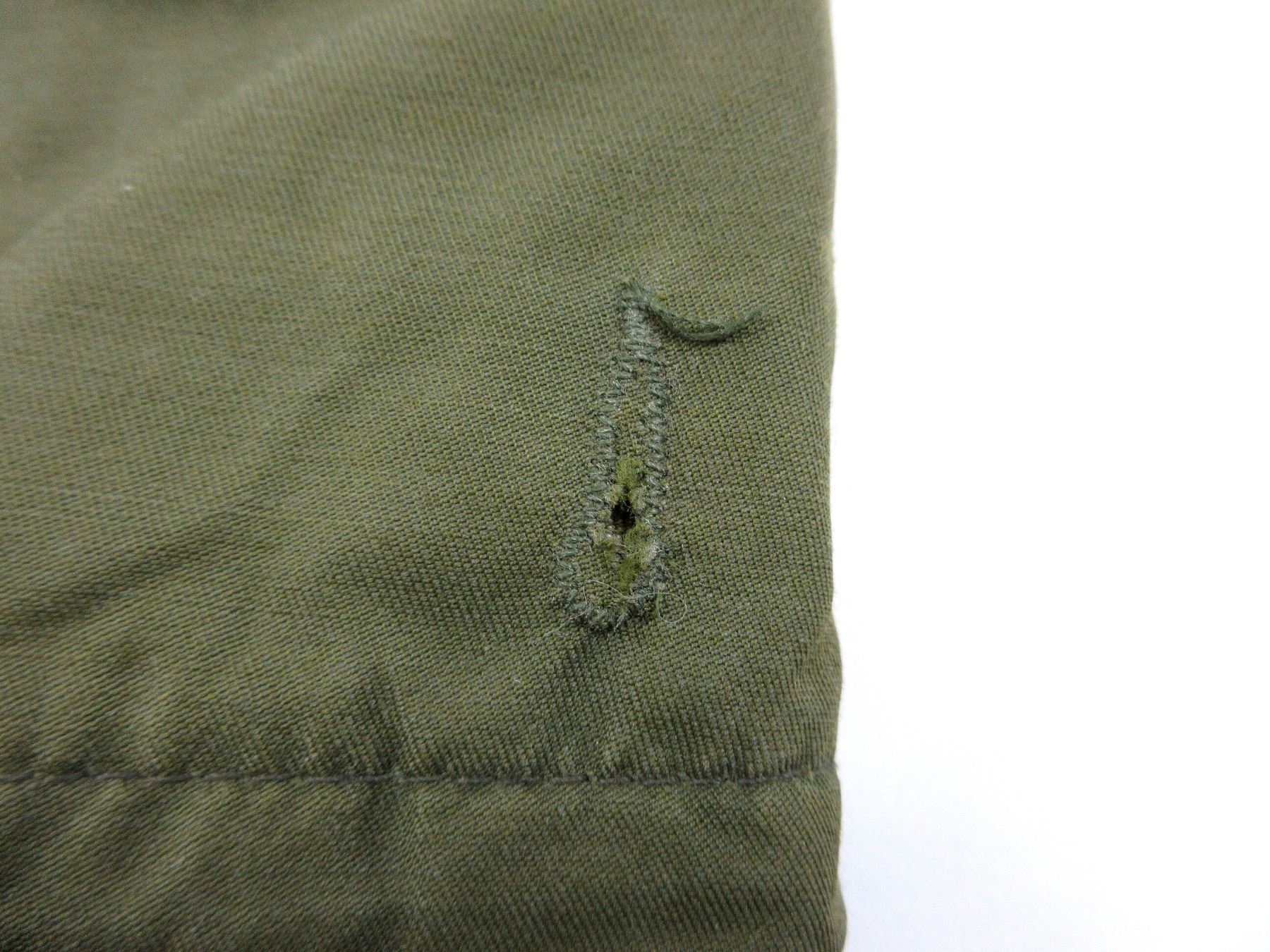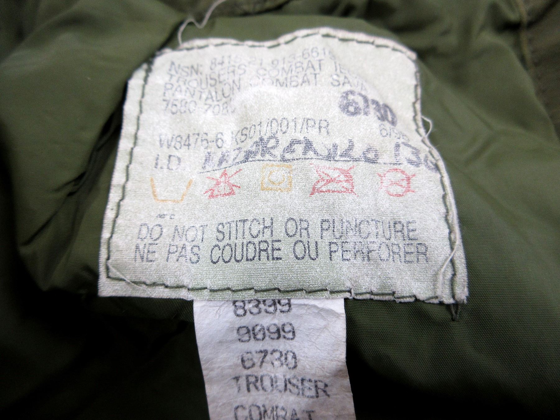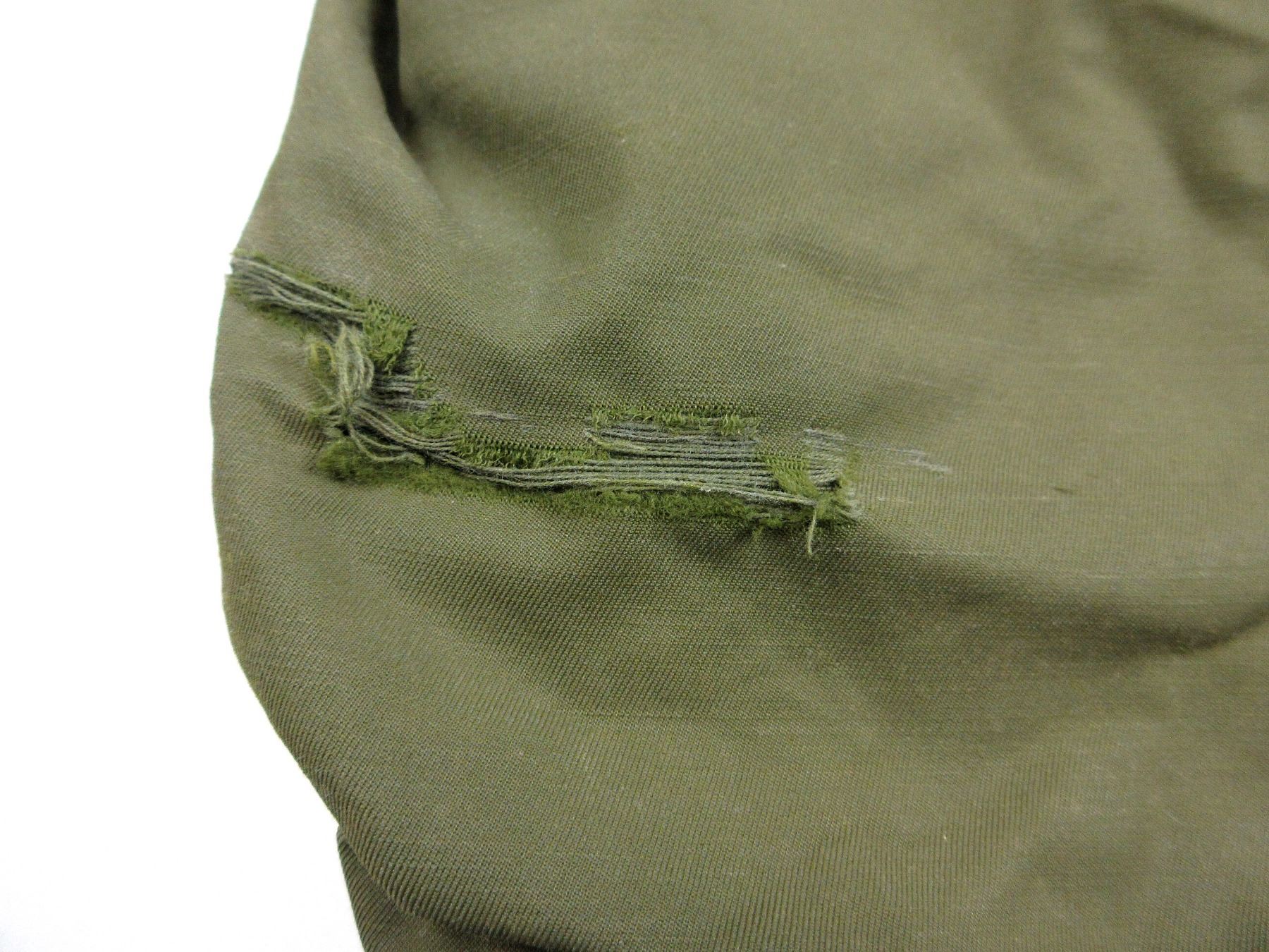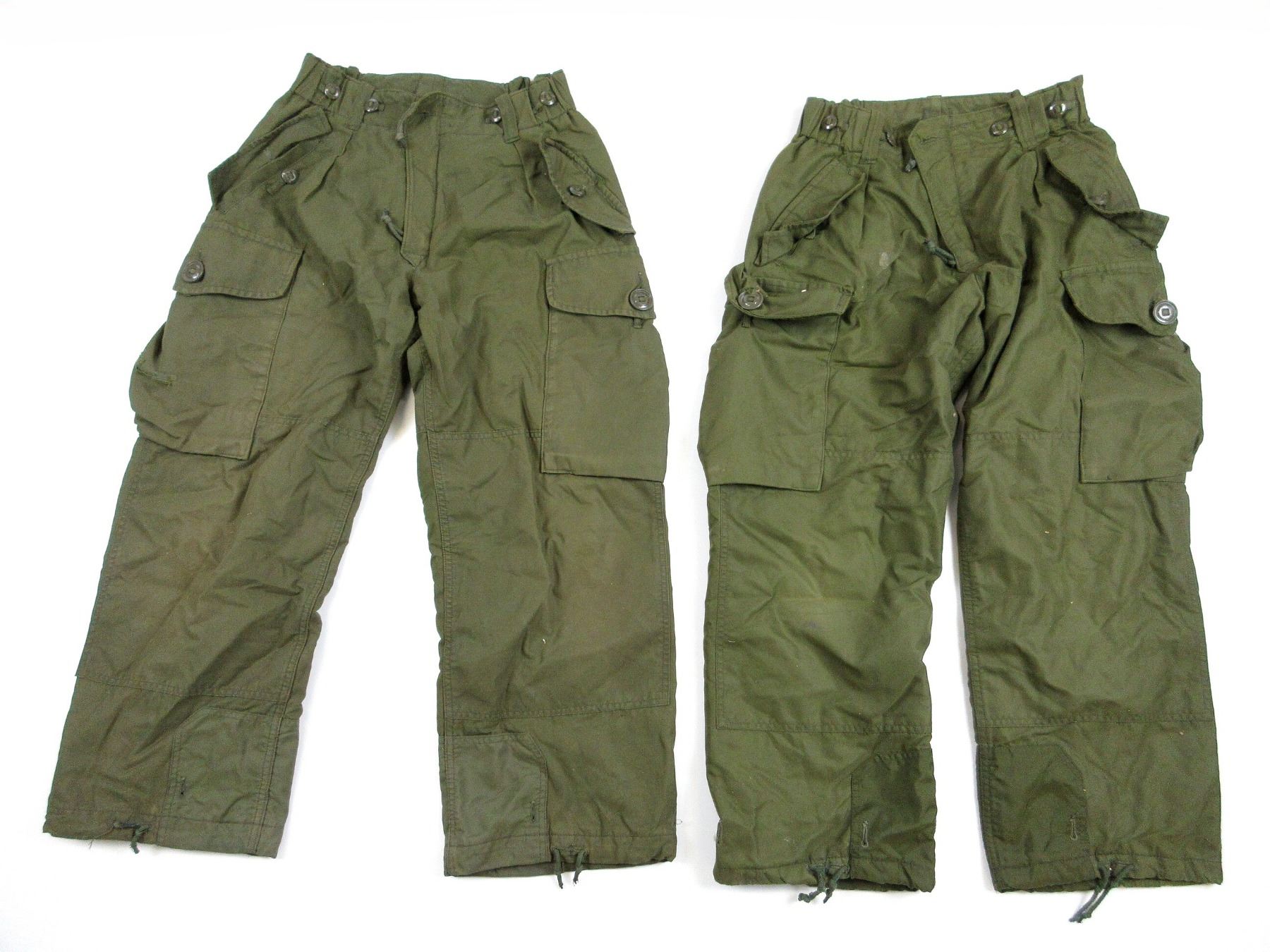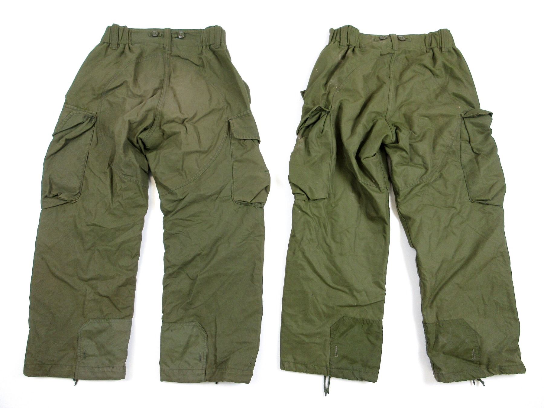 LOT INCLUDES; (2) PAIRS OF GREEN NYLON COMBAT PANTS, SIZES SMALL-SHORT, VARIOUS LABELS / MARKINGS, ZIPPERED-FLY (WORKS), SHOWS WEAR. SEE PHOTOS.
